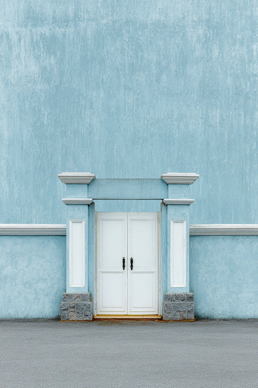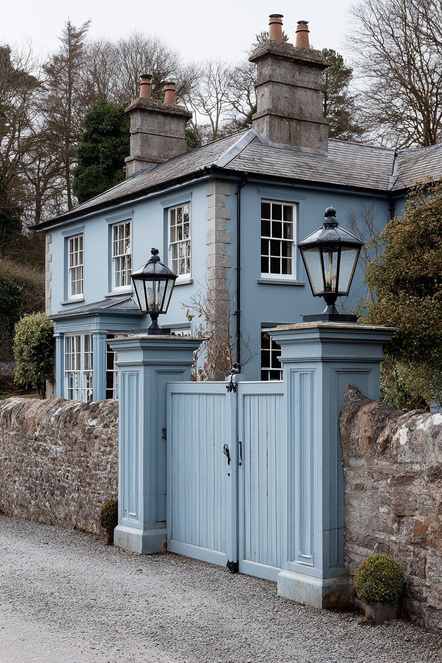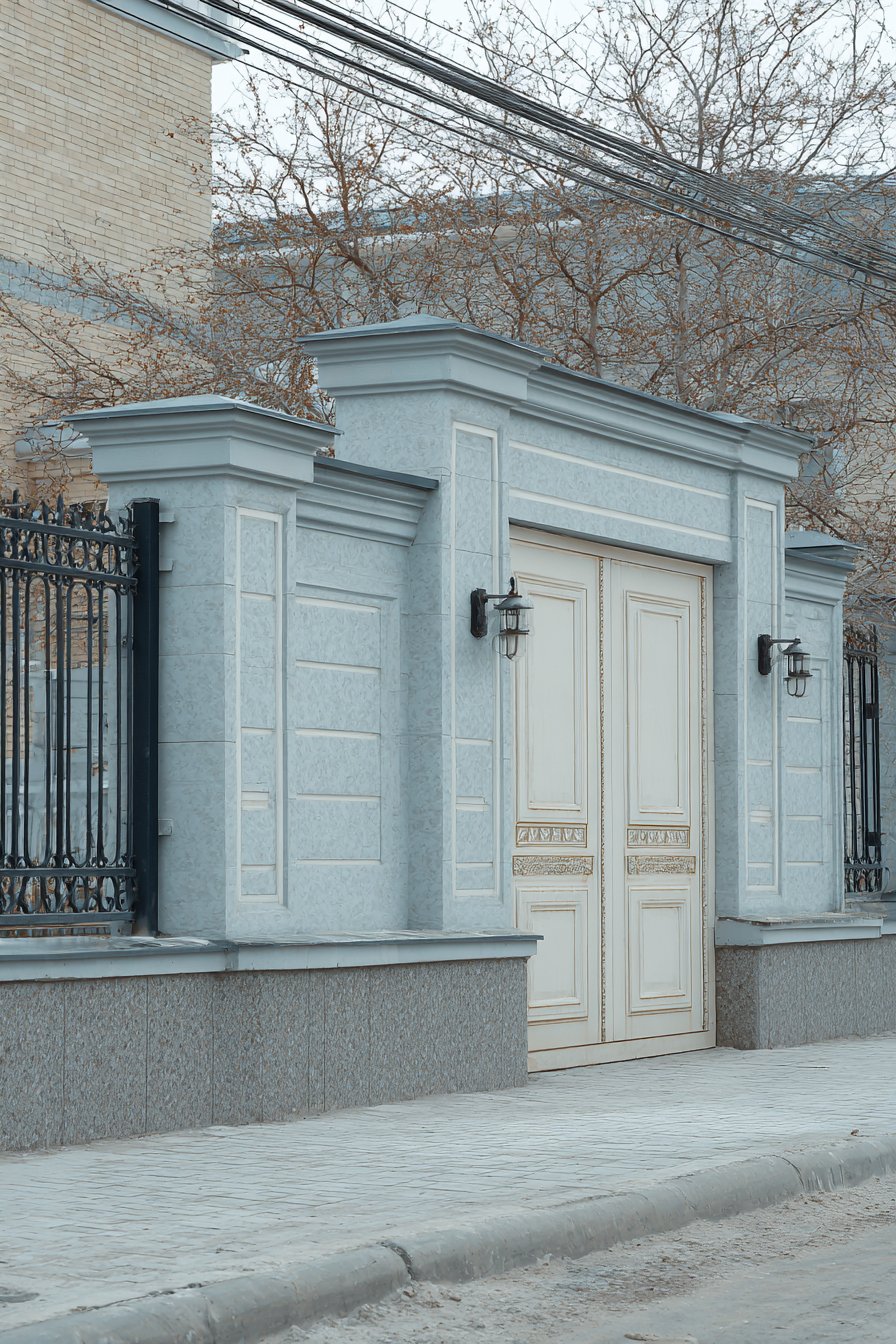 Classic double swing gates in white with simple panel design create timeless entrance that balances formality with approachability. The white finish creates strong value contrast against the blue-grey wall, ensuring the entrance reads clearly as the access point. The simple panel design—typically featuring flat panels with modest edge molding—provides understated elegance without excessive ornamentation. Black iron hardware including hinges, handles, and decorative bolt heads adds traditional character while the dark metal provides accent color that grounds the soft pastel palette.