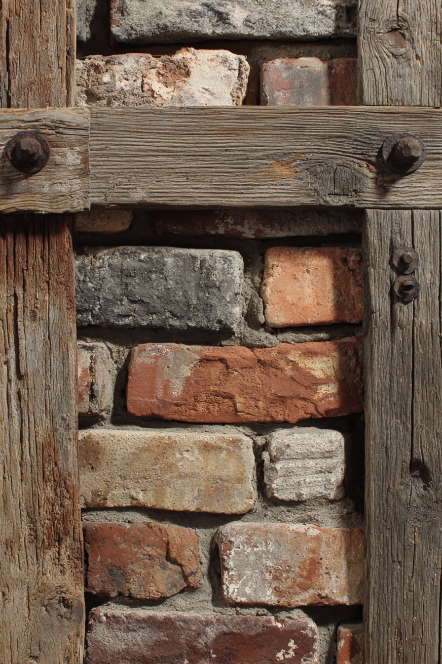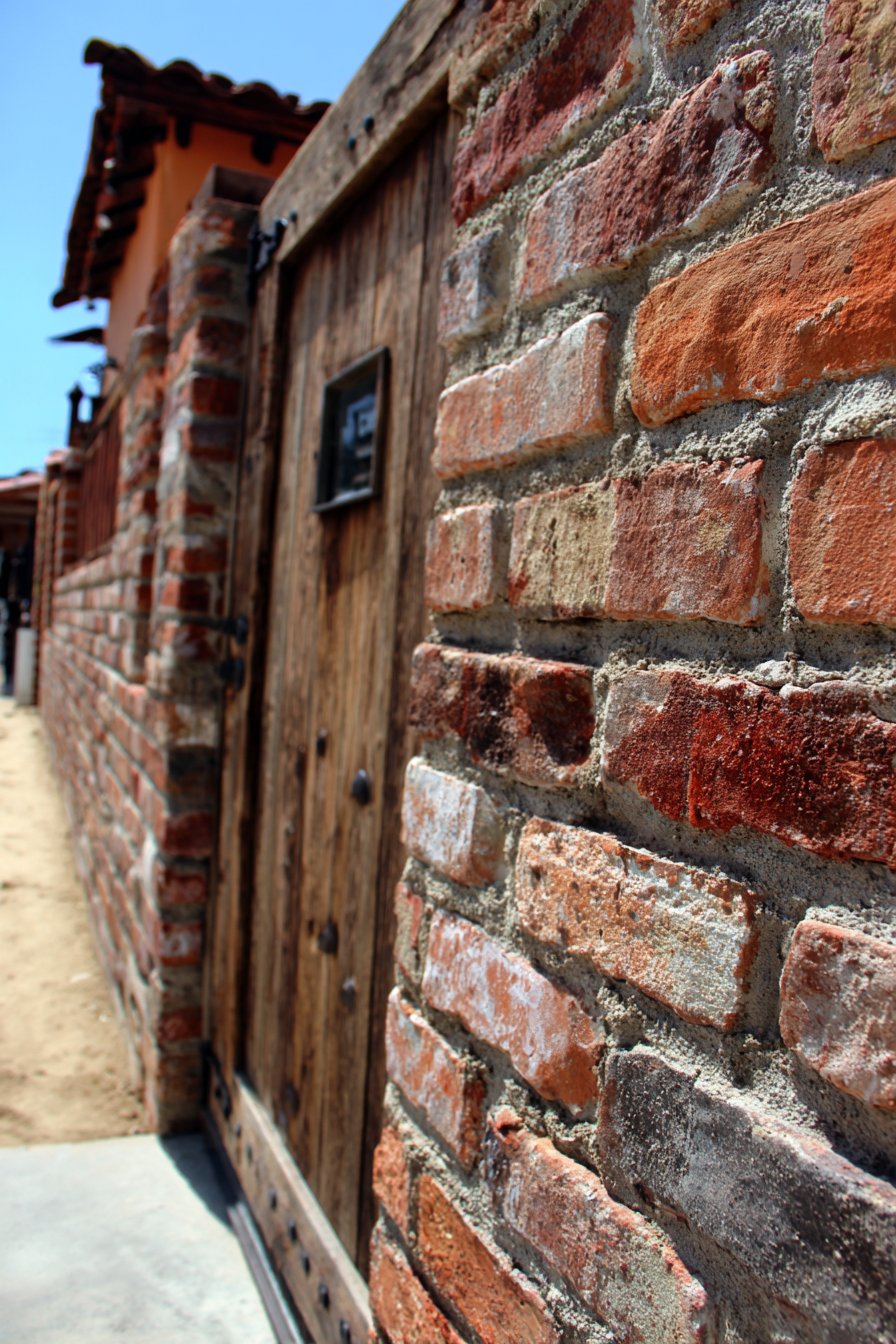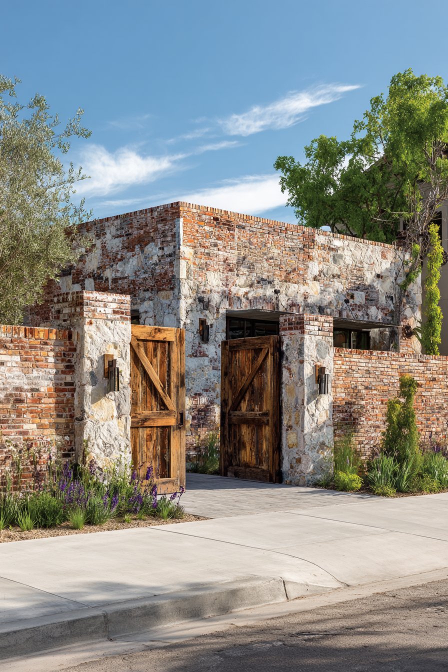 The rustic wooden gate with exposed bolts and simple cross-bracing complements the reclaimed brick’s salvaged character while maintaining honest expression of materials and construction. The gate’s design reveals its assembly method rather than concealing it—visible bolts, diagonal bracing members, natural wood grain all contributing to unpretentious aesthetic that values authenticity over perfection. The weathered or distressed wood finish harmonizes with the bricks’ aged appearance, creating cohesive composition where every element shares similar patina and character.