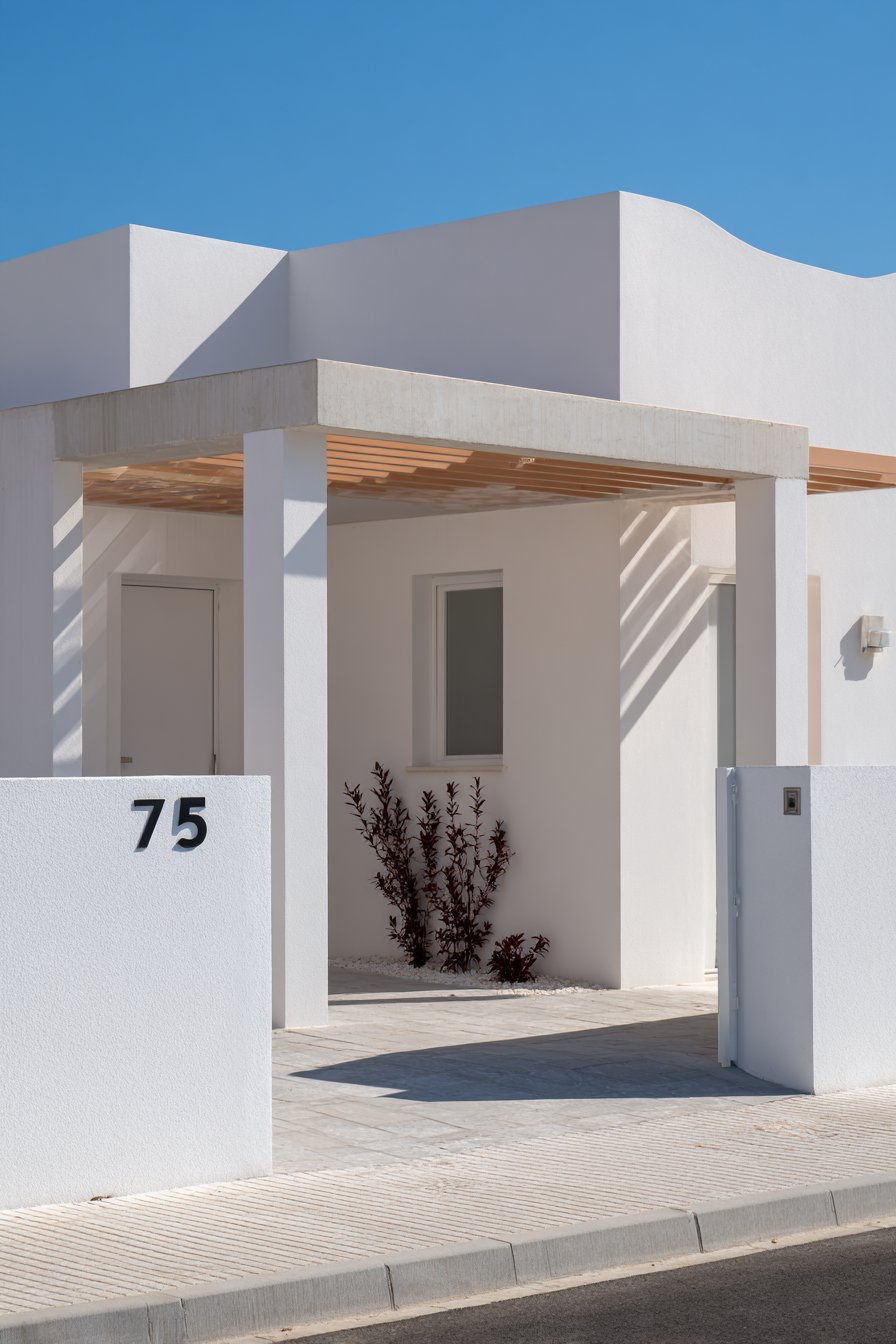 Minimalism reaches its zenith in this pristine compound wall design that proves simplicity, when executed flawlessly, creates profound impact. The smooth white rendered finish represents the ultimate restraint, eschewing ornamentation in favor of pure geometric form and impeccable surface quality. Every detail serves a purpose: the cantilevered concrete cap creates a distinctive shadow line that adds dimensional interest without additional ornamentation, while the precise edges and corners demonstrate the craftsmanship required to achieve true minimalist aesthetics.
