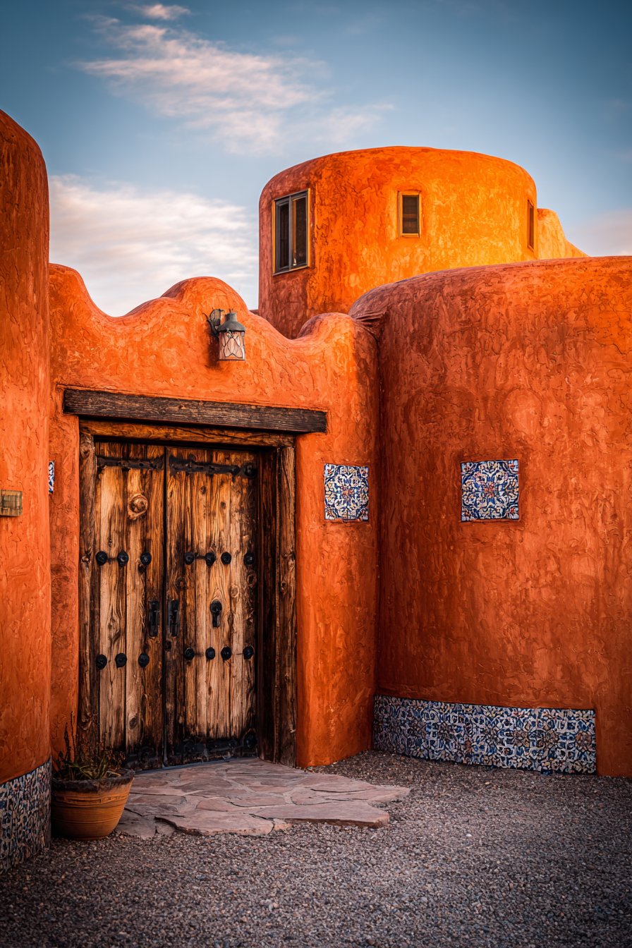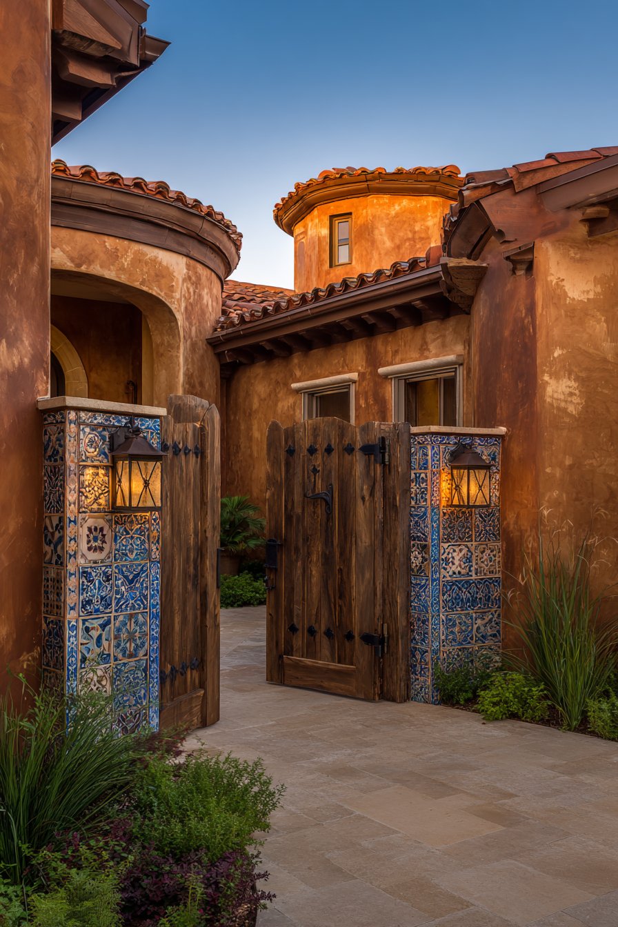 Decorative tile accents in traditional blue and white patterns positioned near the entrance serve as jewel-like details against the warm terracotta background. These handpainted ceramic tiles, whether featuring geometric patterns, floral motifs, or abstract designs, reference the rich tile-making traditions of Spain, Portugal, Morocco, and Italy. Their placement at the entrance creates a focal point that signals the transition from public street to private residence, much like the elaborately tiled entries found in Mediterranean architecture.
