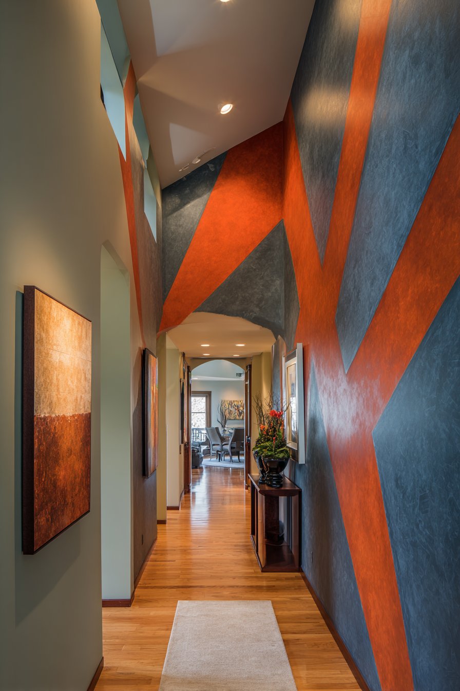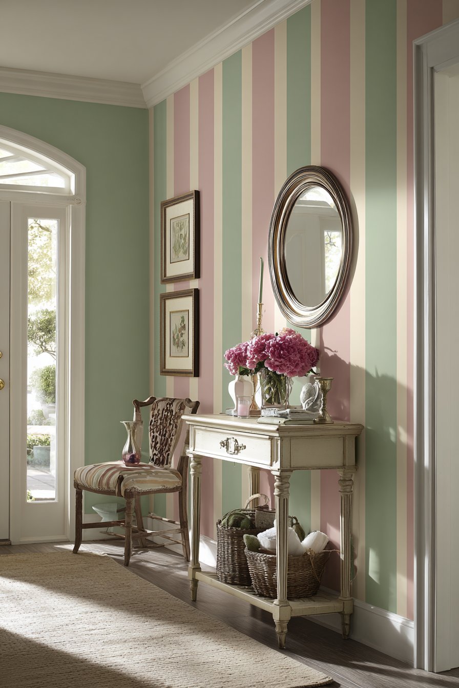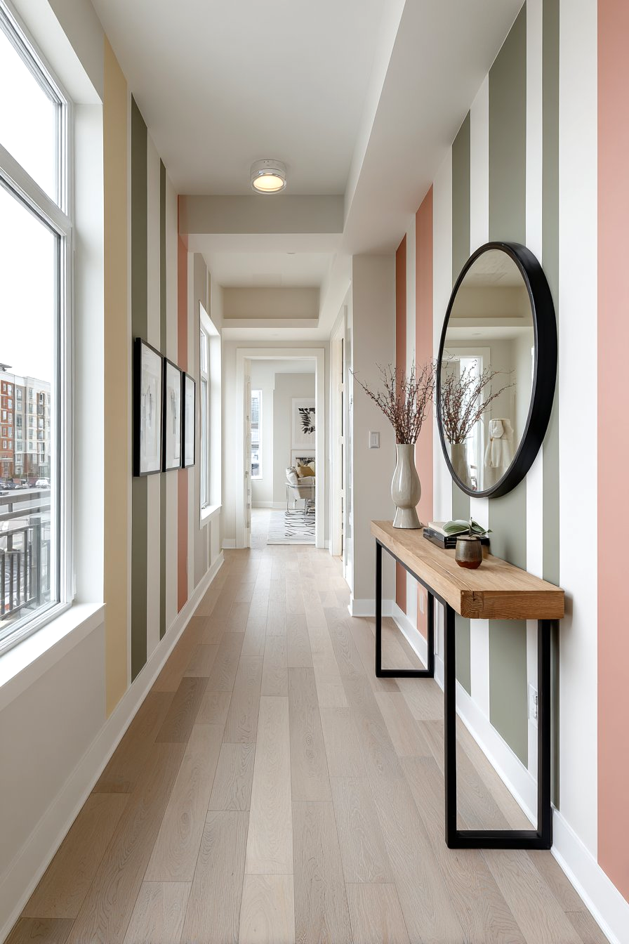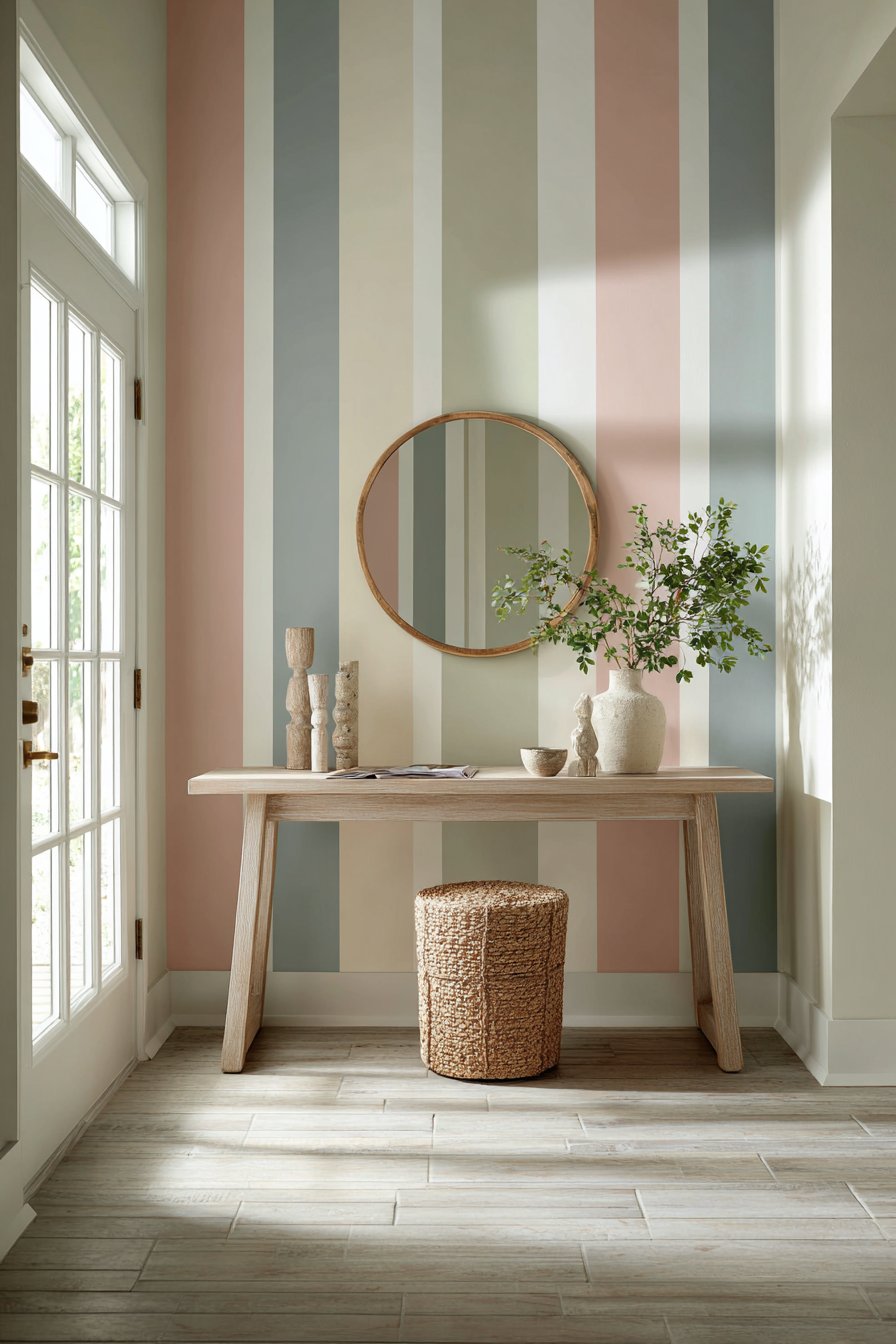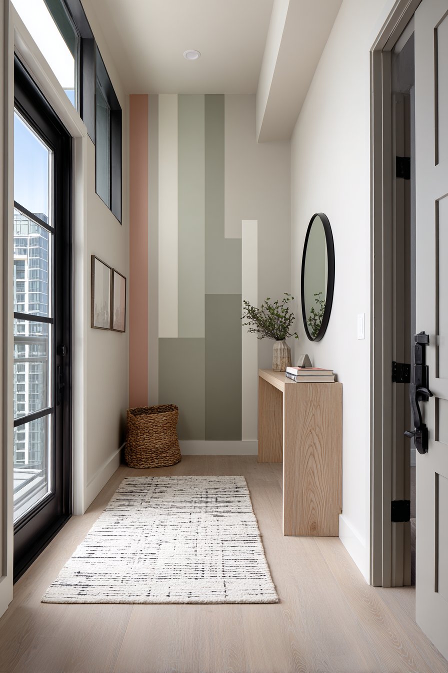 Color-blocking represents a contemporary approach to wall painting that creates striking visual impact through geometric color divisions. This entryway application utilizes vertical stripes in varying widths, featuring a sophisticated palette of sage green, dusty rose, and cream. The technique immediately distinguishes the entry as a designed space worthy of attention, establishing the home’s aesthetic from the moment guests arrive. Vertical orientation visually heightens the space, drawing eyes upward and making narrow entryways feel more generous and considered.
