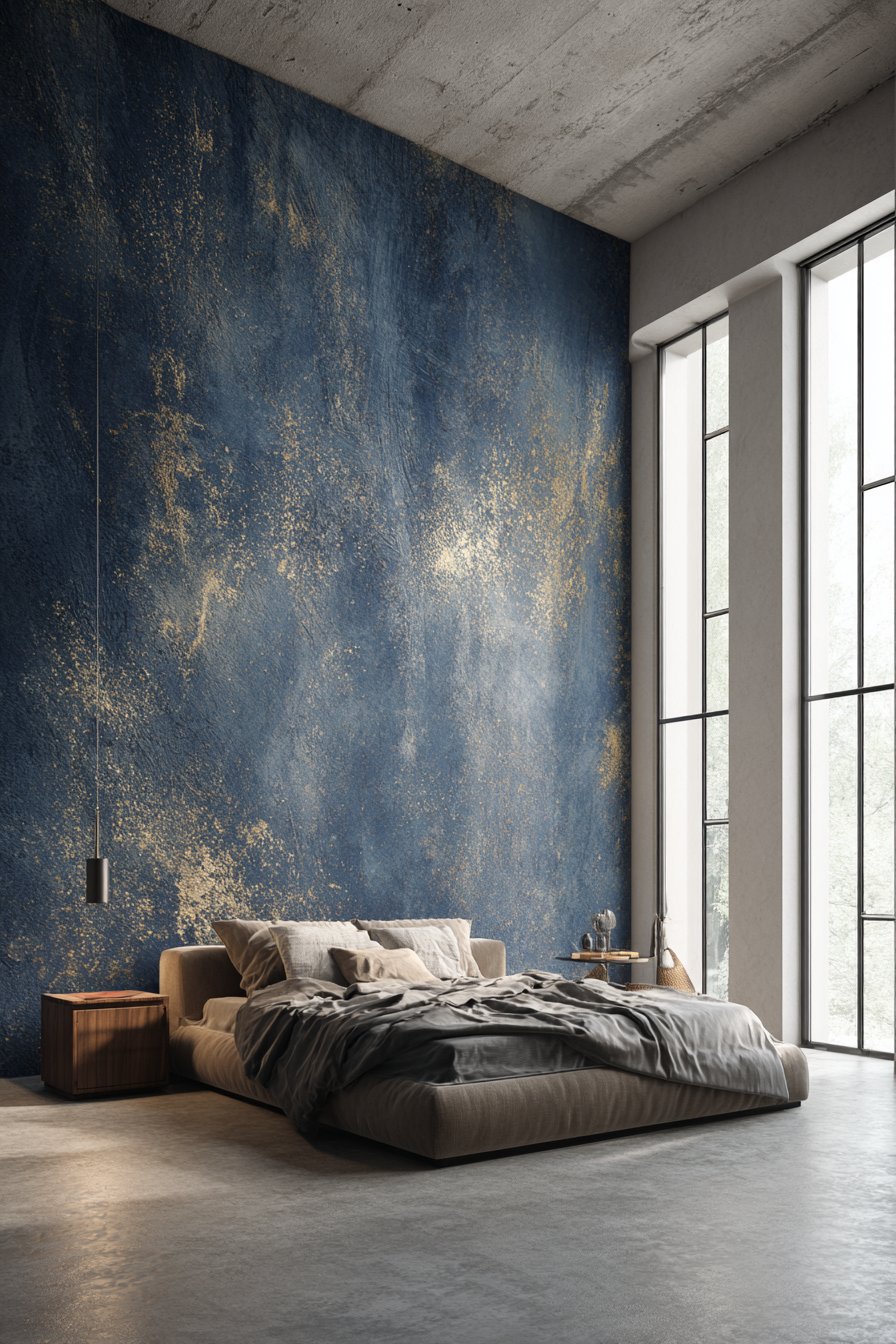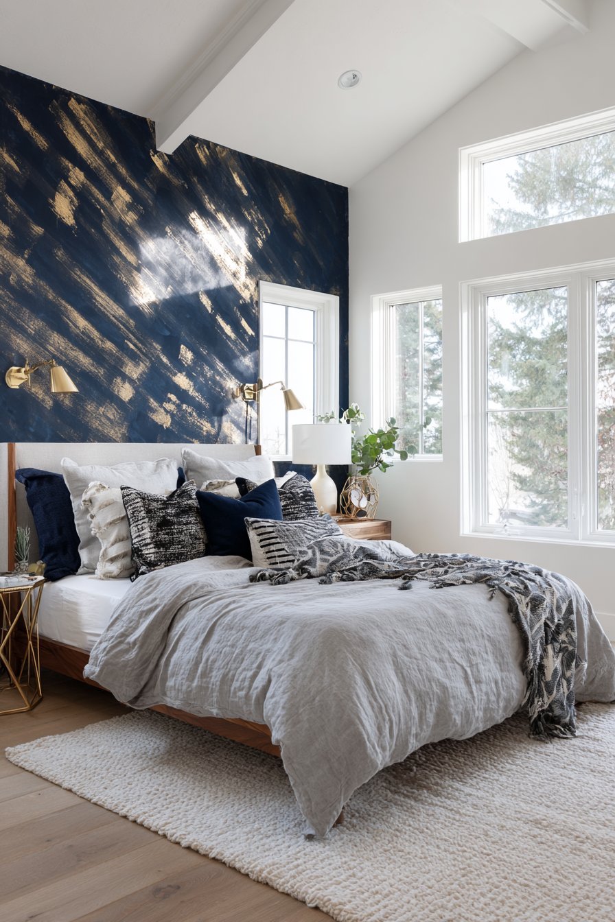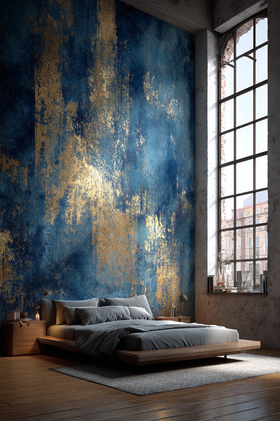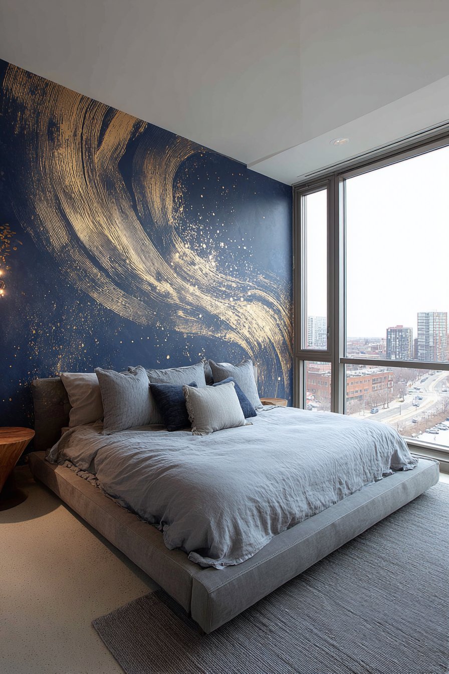 The marriage of deep navy blue with metallic gold creates an instant focal point that commands attention while exuding sophistication. This wall painting idea transforms a bedroom’s accent wall into a piece of living art, where hand-painted abstract brushstrokes in shimmering gold metallic paint dance across a rich navy background. The technique captures the spontaneity of abstract expressionism while maintaining enough restraint to function beautifully in a residential setting. The remaining walls maintain crisp white paint, creating a striking contrast that allows the artistic wall to truly shine without overwhelming the space.