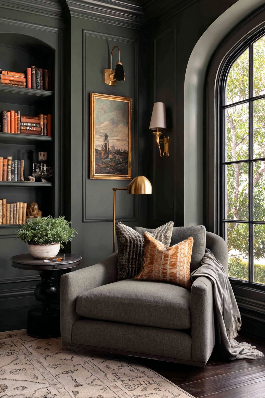 Lighting becomes absolutely critical in dark powder rooms. Recessed lighting, sconces flanking the mirror, or decorative fixtures must provide adequate illumination for grooming tasks while preventing the dark walls from absorbing so much light that the space becomes gloomy. The brass fixtures mentioned serve double duty as decorative elements and light reflectors, adding warm highlights throughout the space.