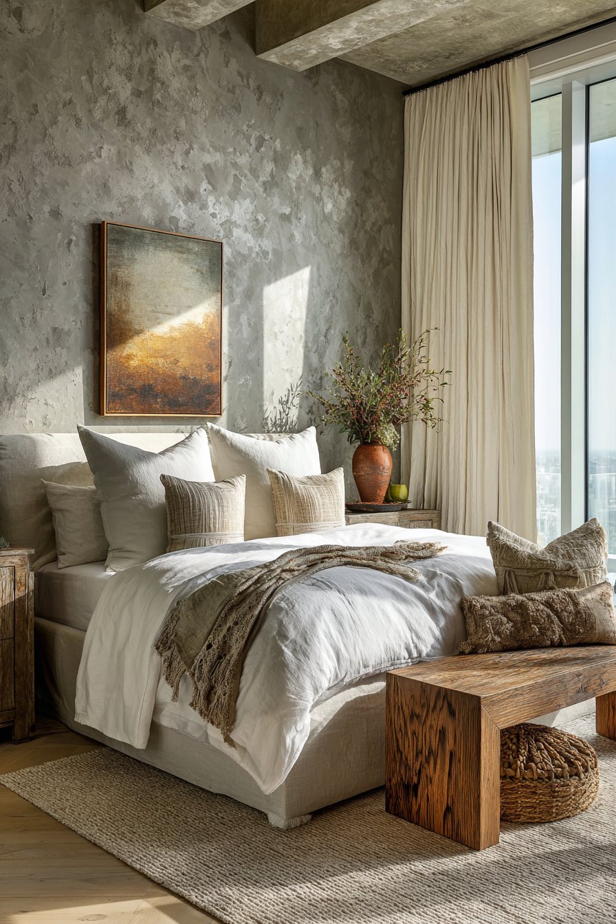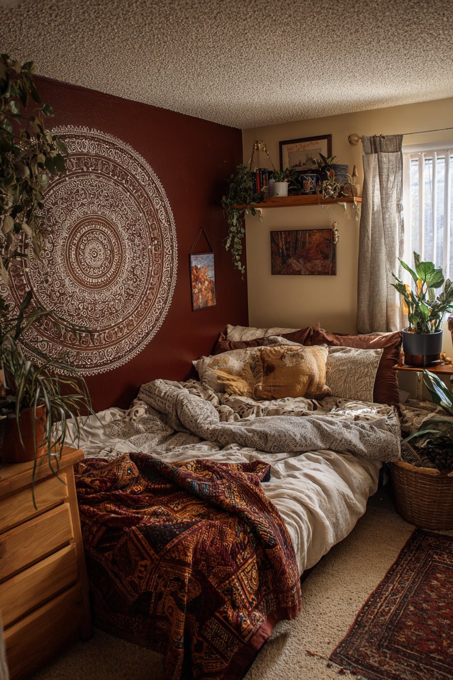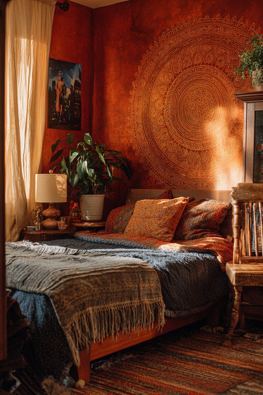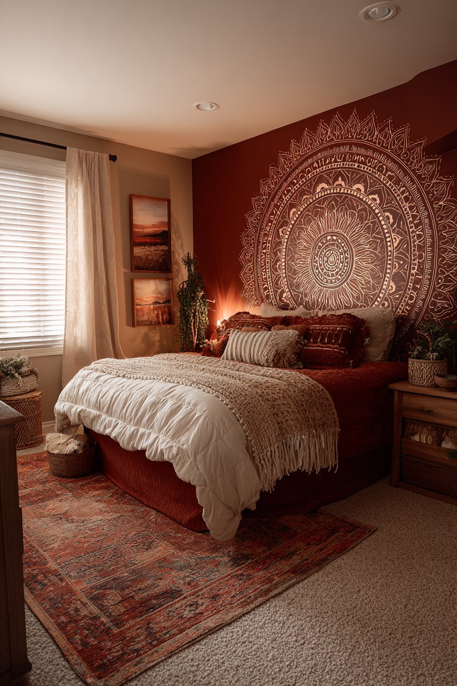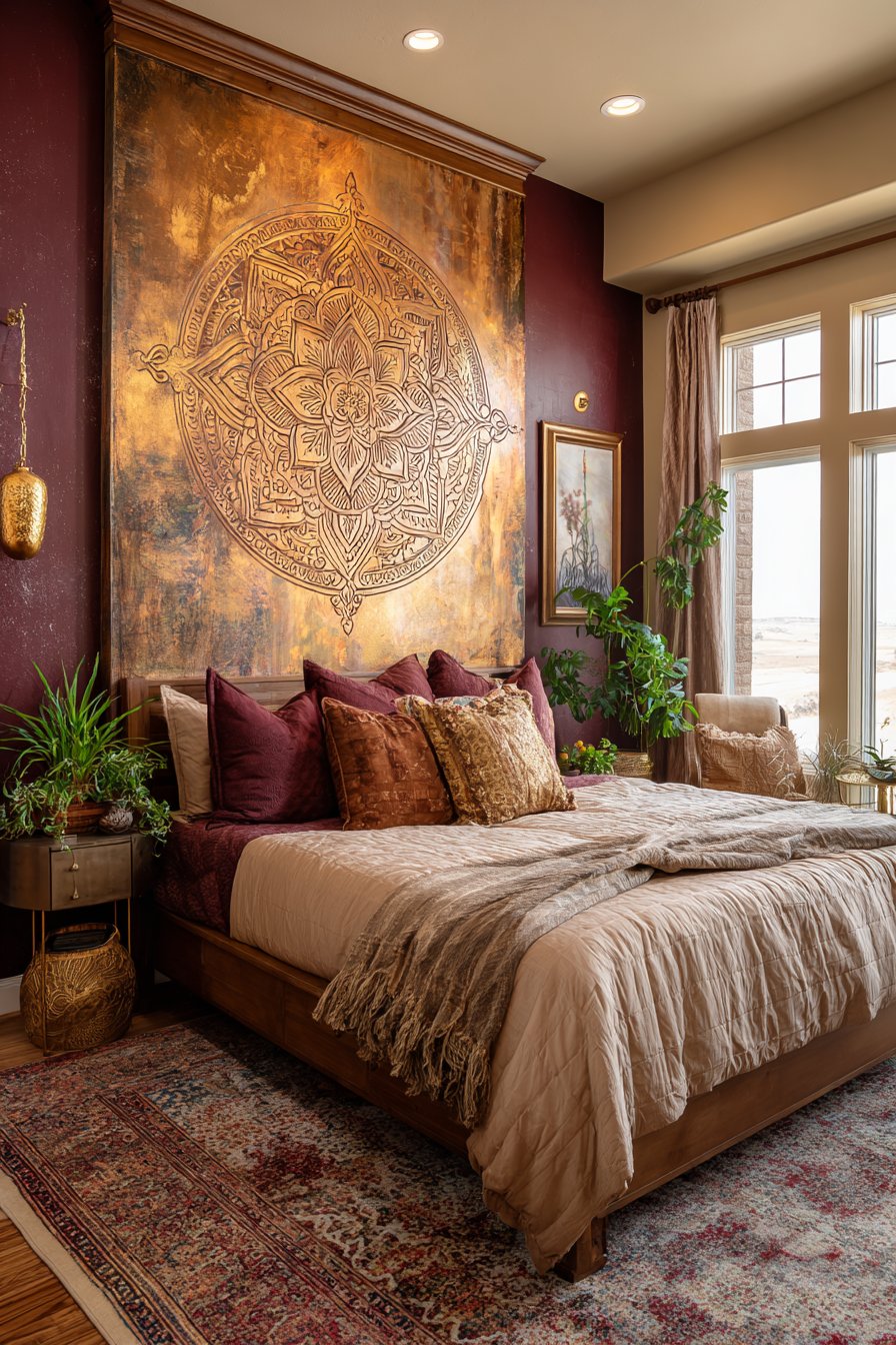 Artistic wall treatments become personal when incorporating hand-painted elements that reflect individual creativity and cultural influences. This bohemian bedroom features a hand-painted mandala design in metallic copper paint on a deep burgundy accent wall behind the bed. The intricate circular pattern functions as an artistic headboard alternative while demonstrating the marriage between artistic expression and interior design. The metallic copper shimmers against the rich burgundy base, creating dynamic visual interest that changes with light throughout the day—catching golden hour sunlight with warm brilliance and maintaining subtle presence under evening lamplight.