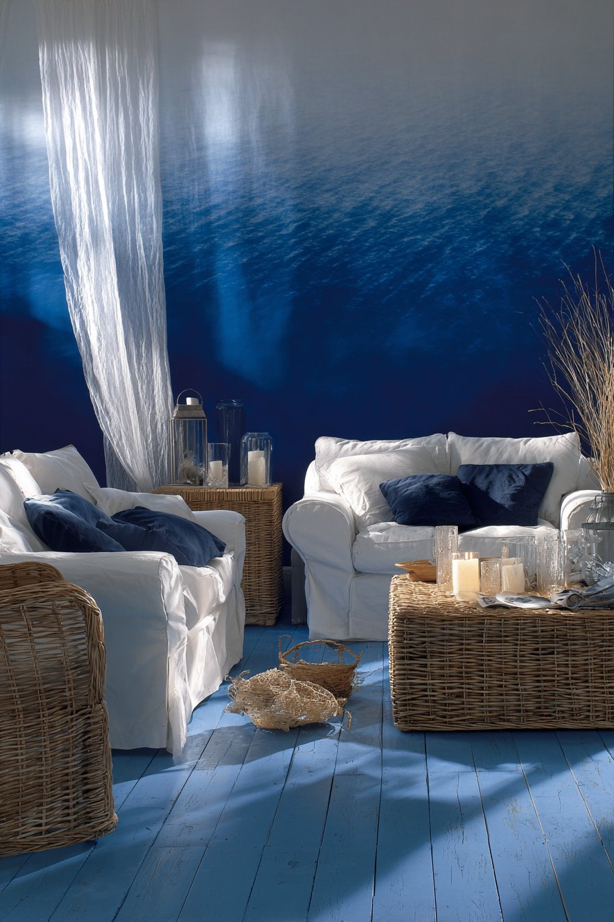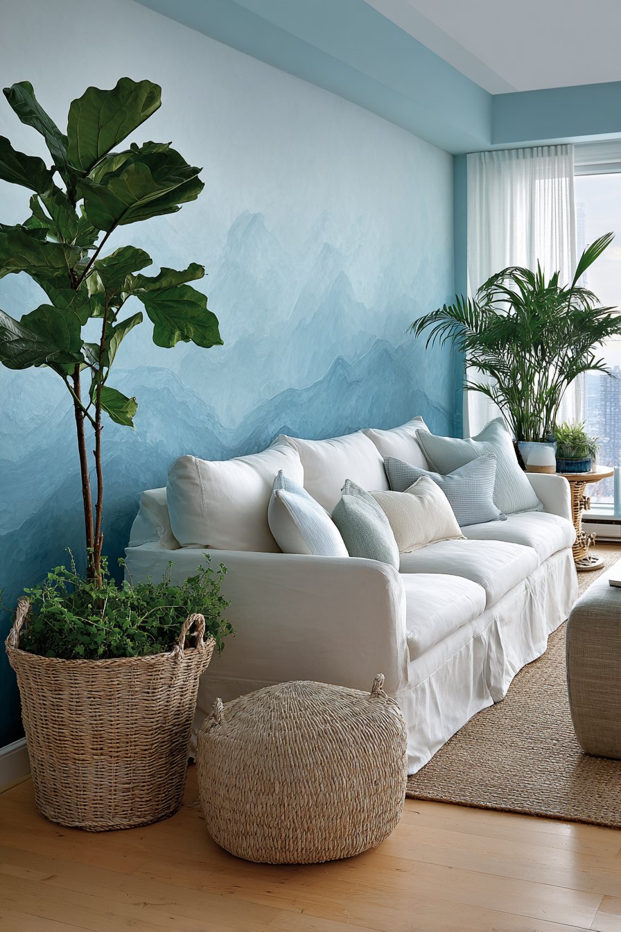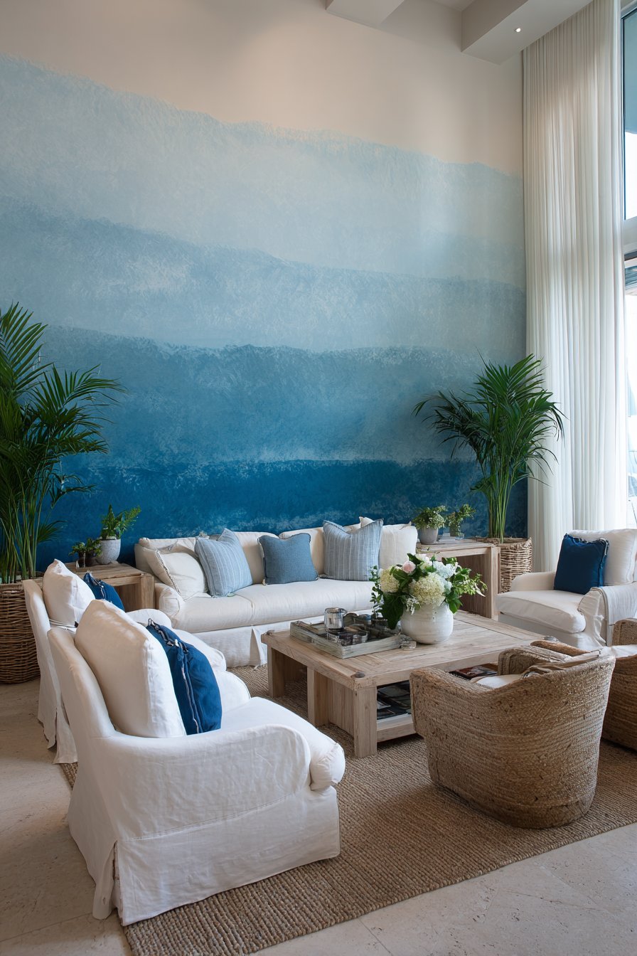 Supporting elements enhance the ocean-inspired wall treatment. White slipcovered furniture mimics sea foam and sandy beaches, while natural textures like jute, linen, and weathered wood reinforce the coastal aesthetic without veering into literal or kitschy nautical decoration. The walls become the hero element that establishes the room’s entire design direction.