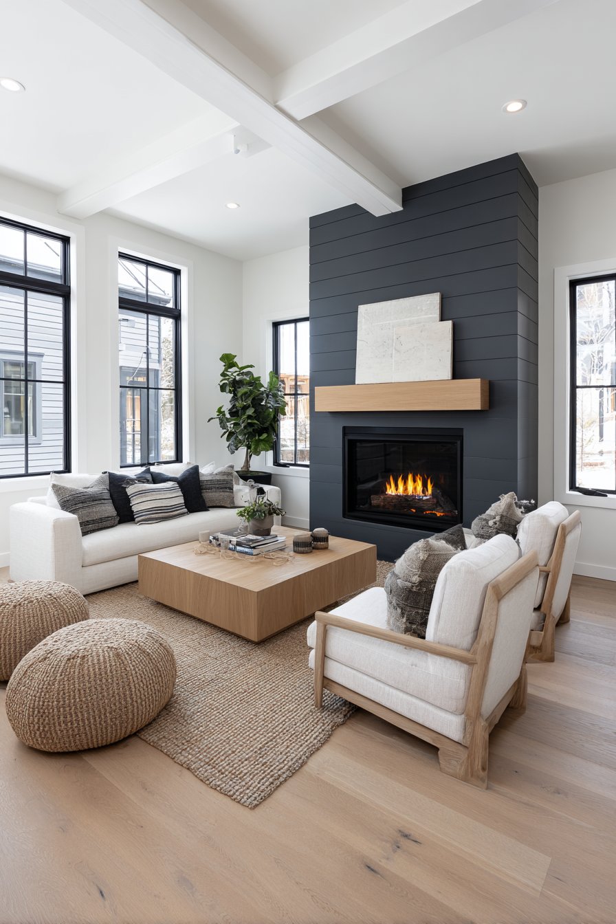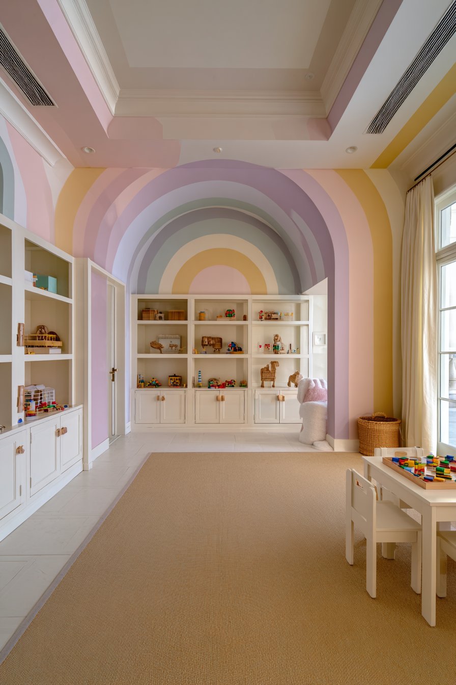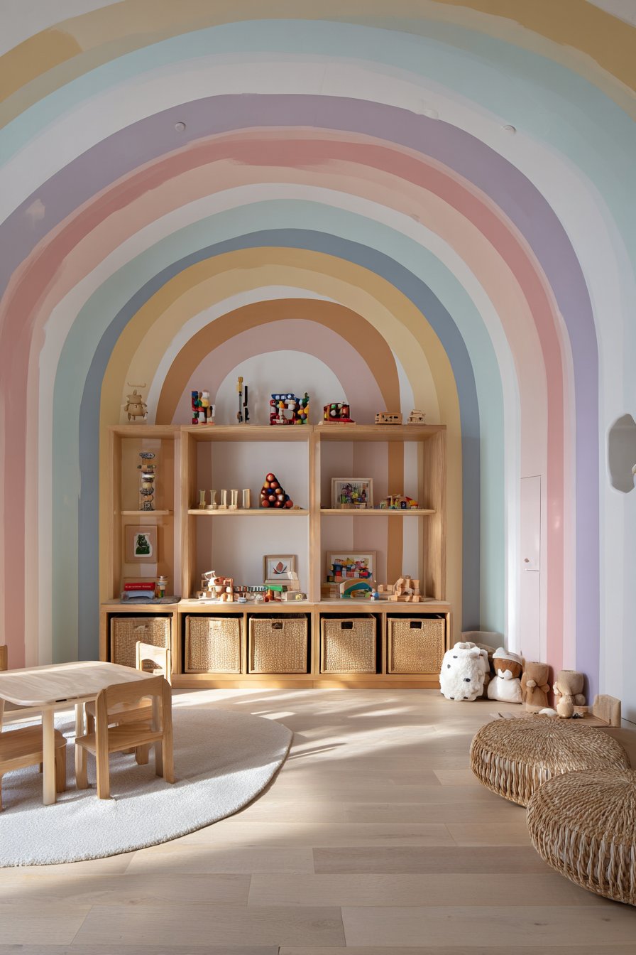 Supporting elements enhance the ocean-inspired wall treatment. White slipcovered furniture mimics sea foam and sandy beaches, while natural textures like jute, linen, and weathered wood reinforce the coastal aesthetic without veering into literal or kitschy nautical decoration. The walls become the hero element that establishes the room’s entire design direction.