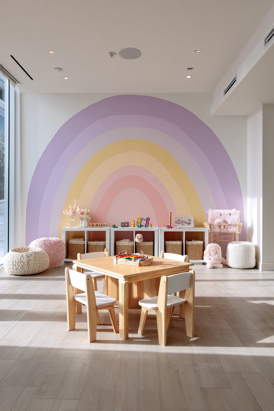 Placement and scale considerations significantly impact this mural’s effectiveness. Positioning it on the wall behind a seating area creates a natural focal point that guests’ eyes gravitate toward, while keeping the mural at a scale proportionate to the room prevents it from overwhelming the space. The coordination between mural colors and existing furnishings ensures cohesion, with neutral seating allowing the wall art to shine without color competition.
