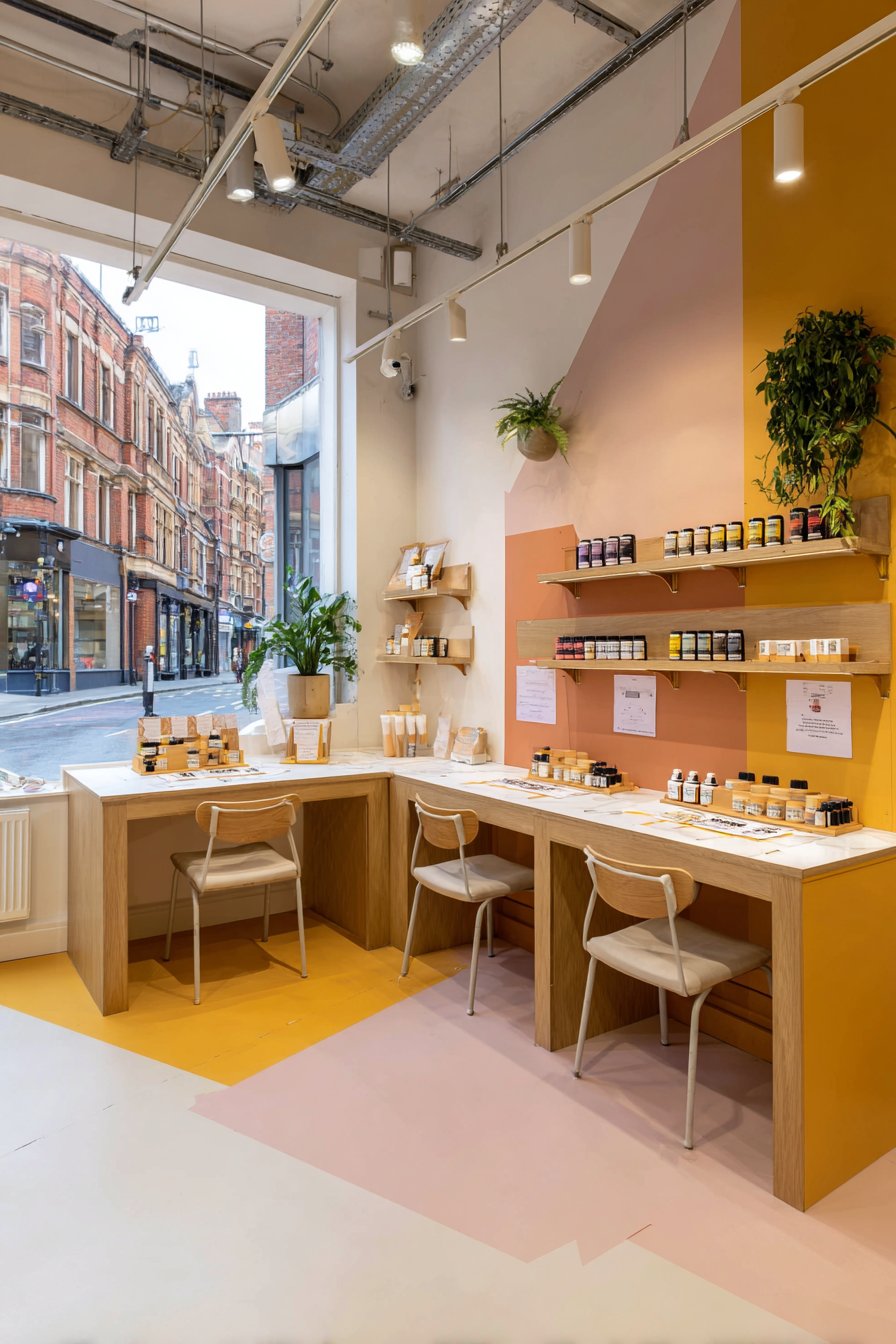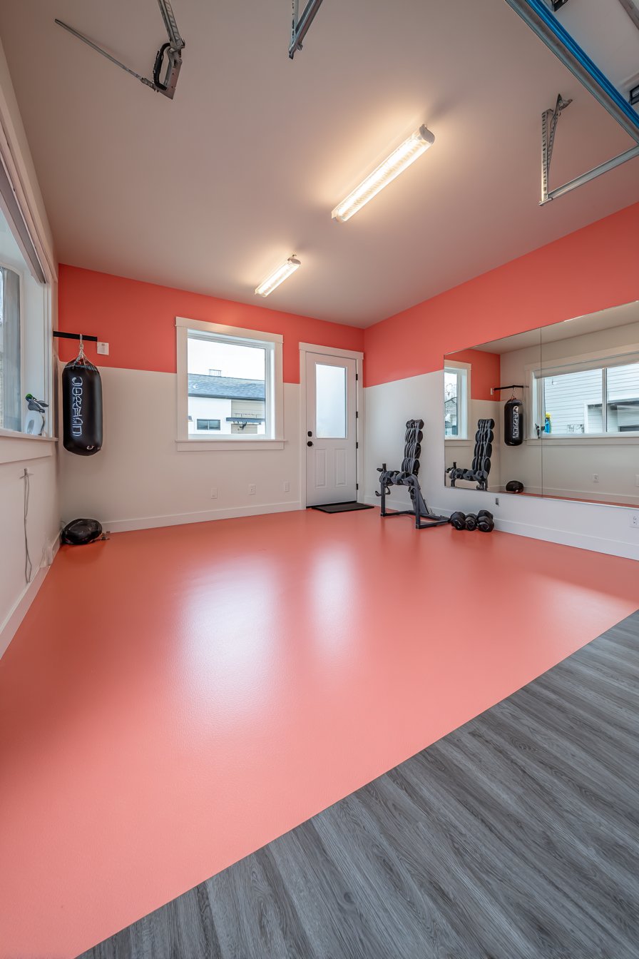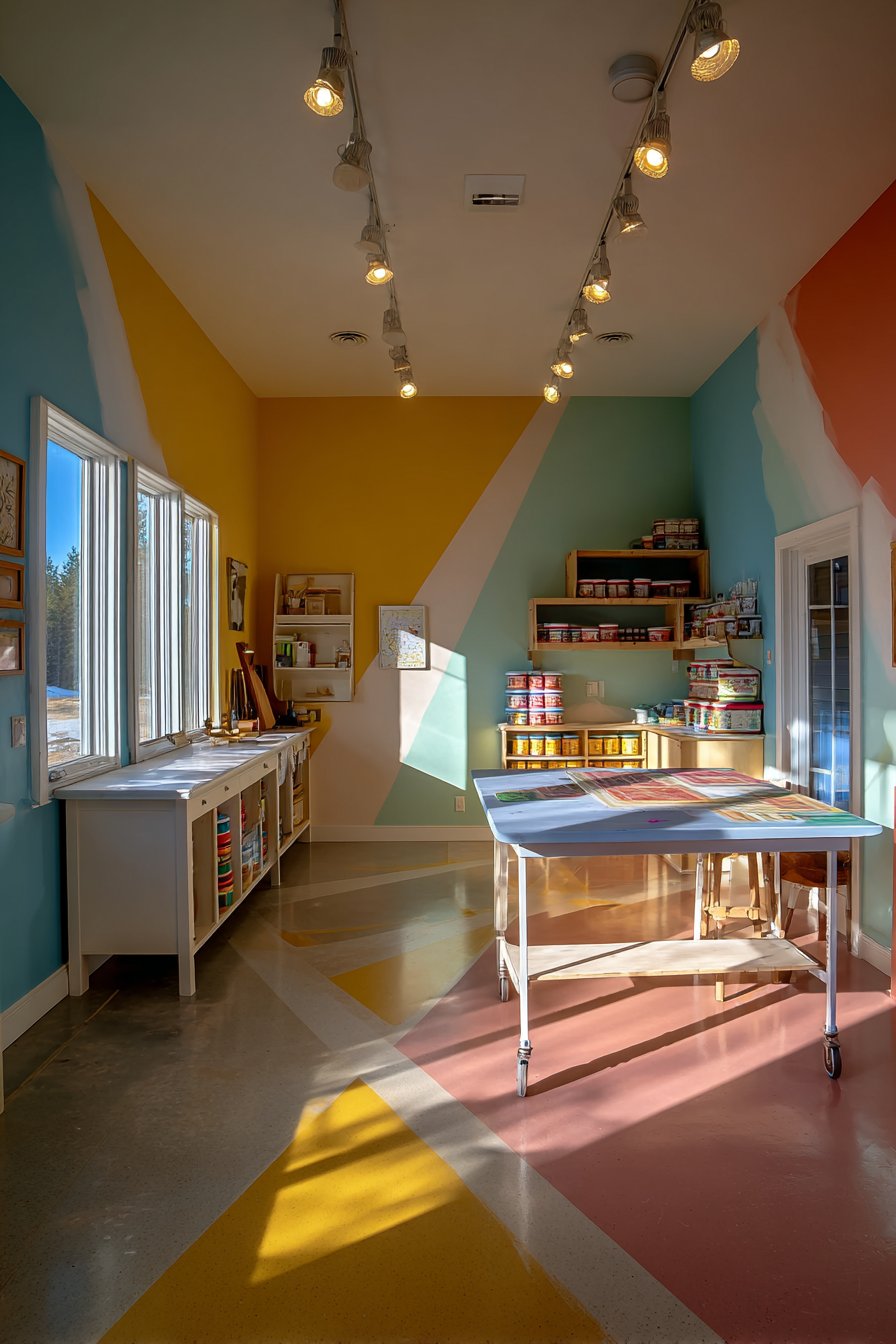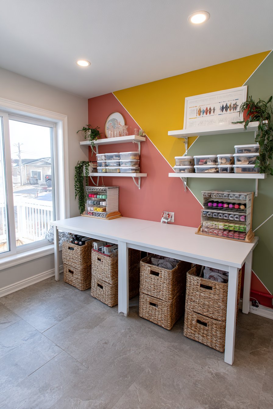 Color-blocking reaches its full potential when multiple colors create geometric compositions that feel both bold and balanced. This craft room features four distinct sections in complementary shades—mustard yellow, terracotta, dusty pink, and sage green—meeting at precise angles for a modern geometric effect. The contemporary approach to color-blocking differs from traditional two-tone walls by embracing complexity and creating almost quilt-like patterns that provide visual stimulation appropriate for creative workspaces. Each color occupies roughly equal space, creating balance without symmetry.