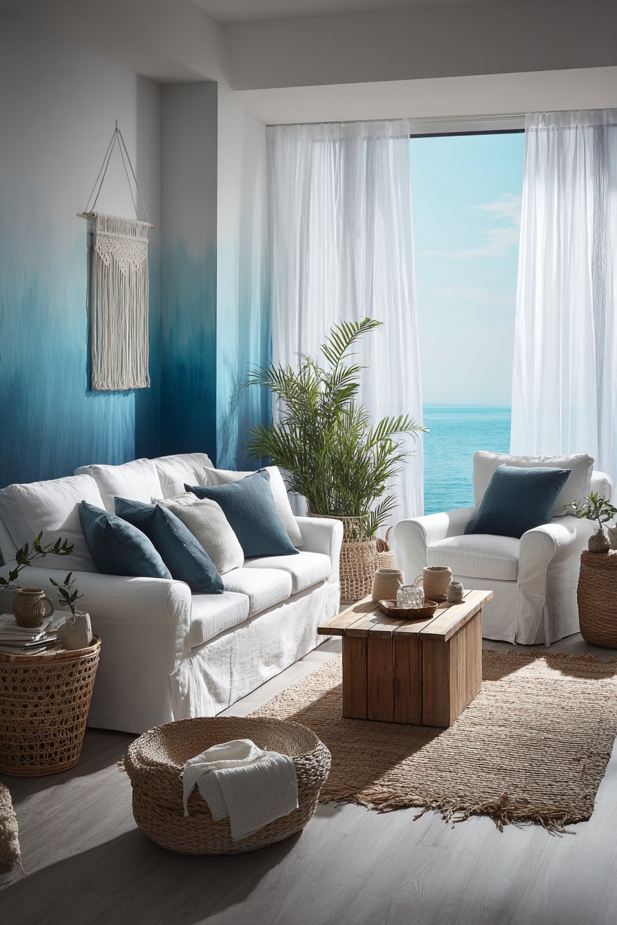 Nature provides endless inspiration for interior color palettes, and this coastal living room captures ocean depths through carefully graduated shades of blue. The horizontal drift pattern progresses from deep navy at the bottom through medium blues to sky blue at the top, mimicking the way ocean water appears darker in the depths and lighter toward the surface. This sophisticated interpretation of ombre technique creates serene atmosphere perfect for relaxation and coastal living while demonstrating more color complexity than simple two-tone treatments.