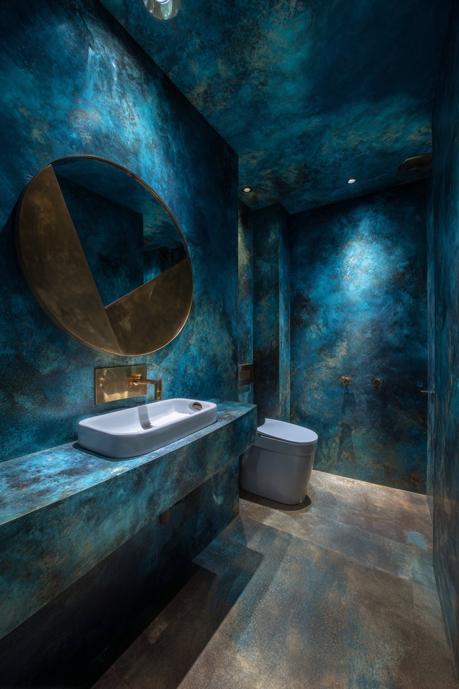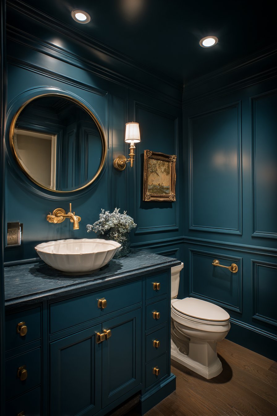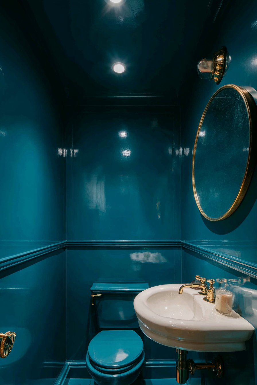 The all-over application, including the ceiling, proves crucial to this approach’s success. Stopping the dark color at the ceiling line would create a truncated, incomplete feeling, whereas continuing the teal overhead creates full immersion in the color. This technique works because powder rooms, as guest bathrooms without showers, function as brief-visit spaces where dramatic color creates impact without the potential fatigue of living with very dark colors in primary rooms.