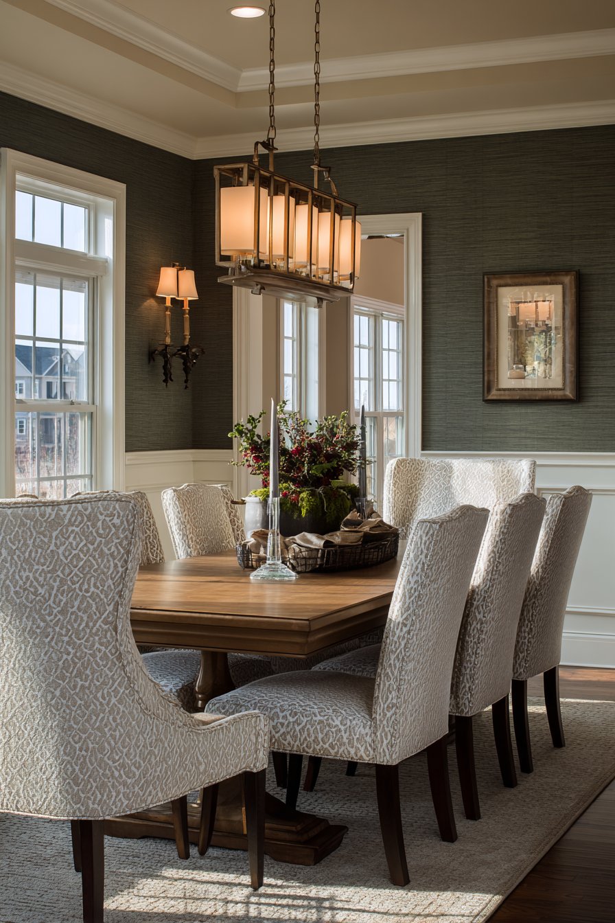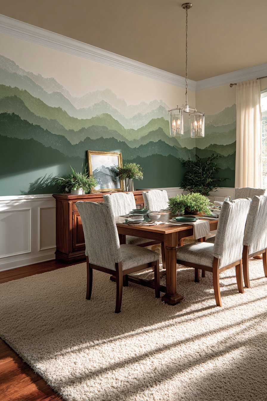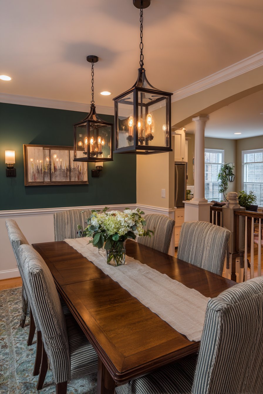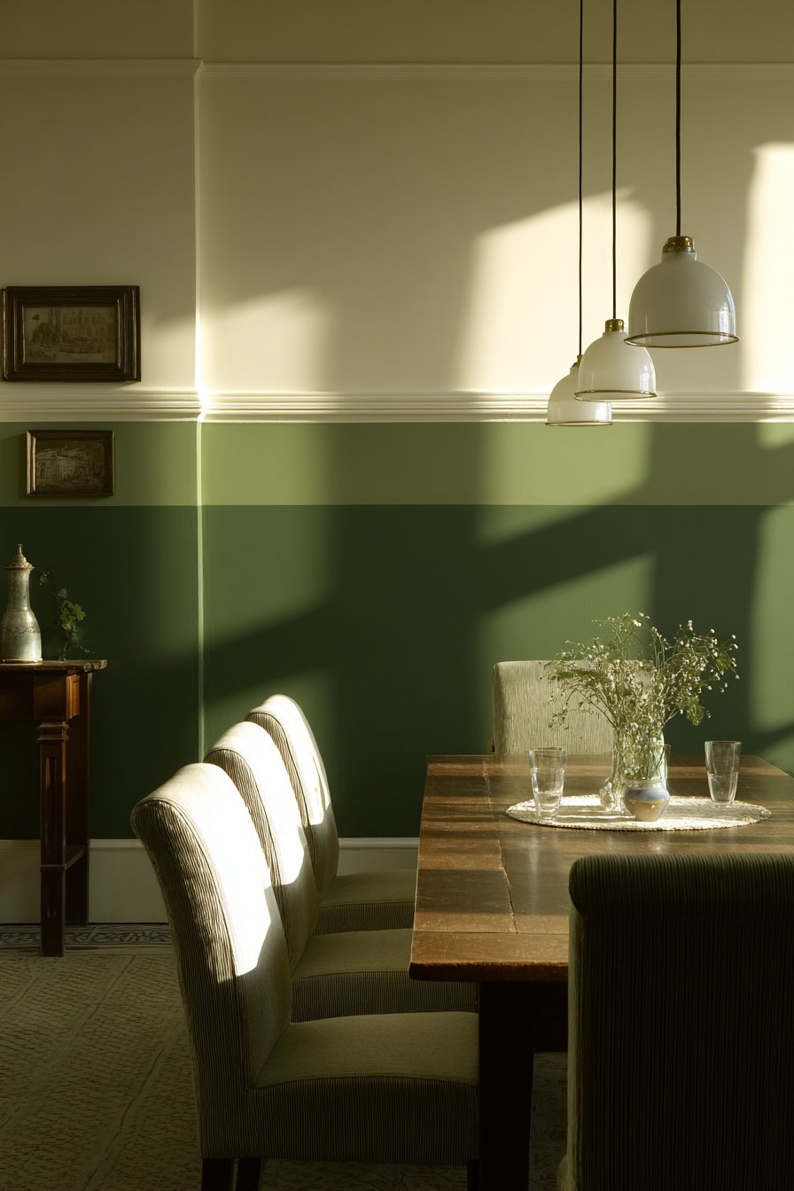 The two-tone wall treatment represents a timeless approach to adding architectural interest and visual sophistication to dining spaces. This particular execution features deep forest green on the lower portion of walls, paired with warm cream above, with the transition marked by classic white picture rail molding. The forest green receives a subtle color-washing technique that introduces depth and texture, preventing the darker color from appearing flat or oppressive. This layered approach to paint application creates visual complexity that rewards closer inspection while maintaining elegance from a distance.