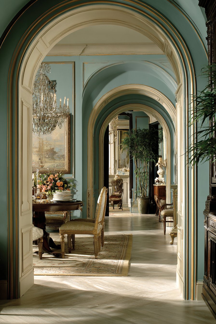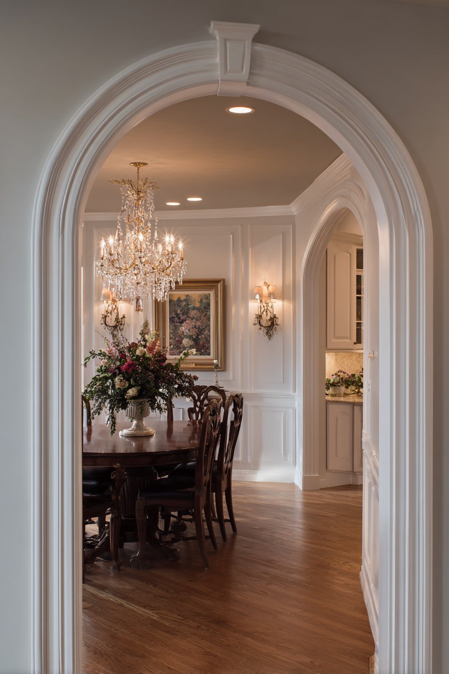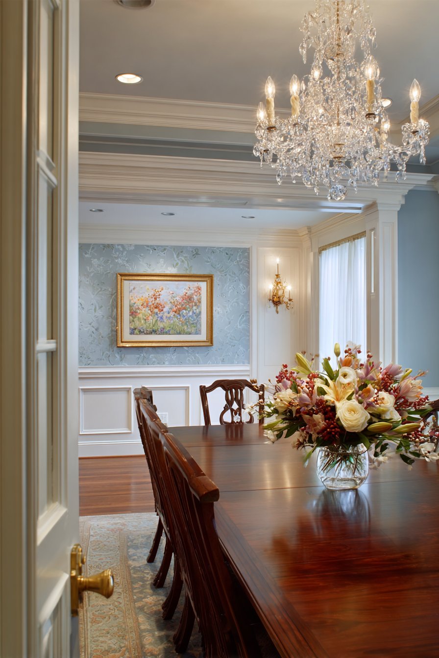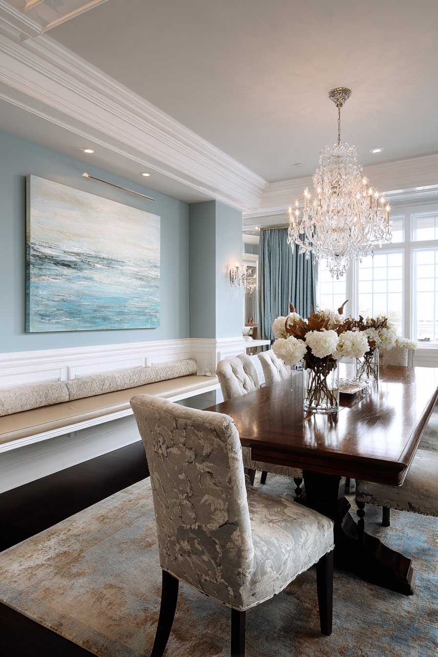 Traditional architectural elements gain fresh relevance when executed with contemporary color choices. This dining room showcases classic picture frame molding painted in a sophisticated two-tone style—frames outlined in crisp white against walls painted in Wedgwood blue. The architectural paint treatment adds elegance and dimension while referencing historical design traditions, making it perfect for transitional spaces that bridge traditional and contemporary aesthetics. The raised molding creates subtle shadows that add depth and interest, while the color contrast ensures the architectural detail reads clearly from across the room.