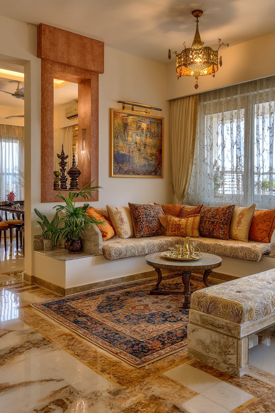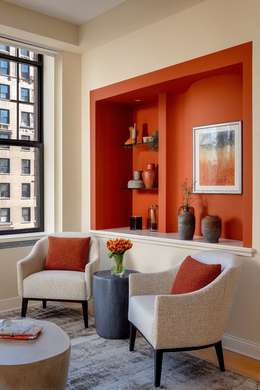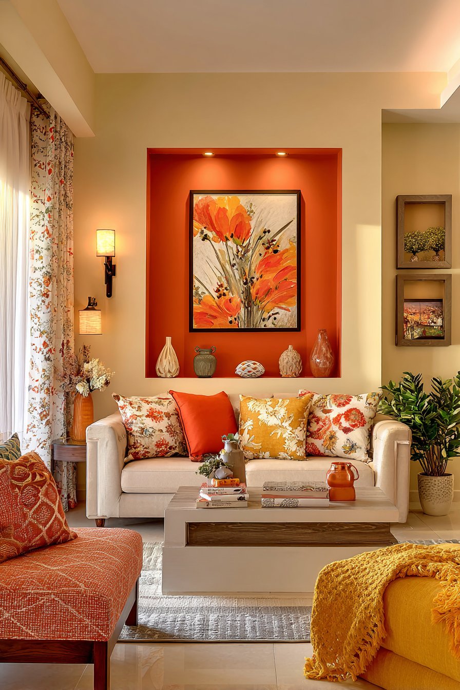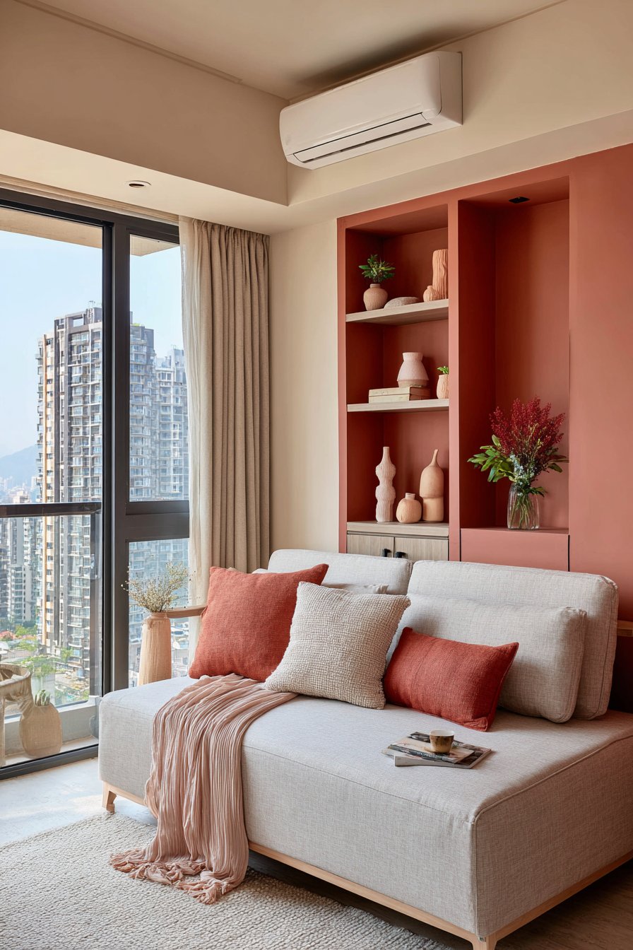 Creative paint techniques can define architectural features that don’t physically exist, adding dimension and interest to flat walls. This small apartment living room demonstrates this concept through a painted accent niche—a recessed wall area painted in warm terracotta to create a display alcove effect against surrounding cream walls. While the wall remains physically flat, the contrasting color convincingly suggests a recessed area, providing focal points for decorative objects and creating the visual complexity typically achieved through actual architecture. This technique proves particularly valuable in apartments and condos where architectural modification isn’t permitted.