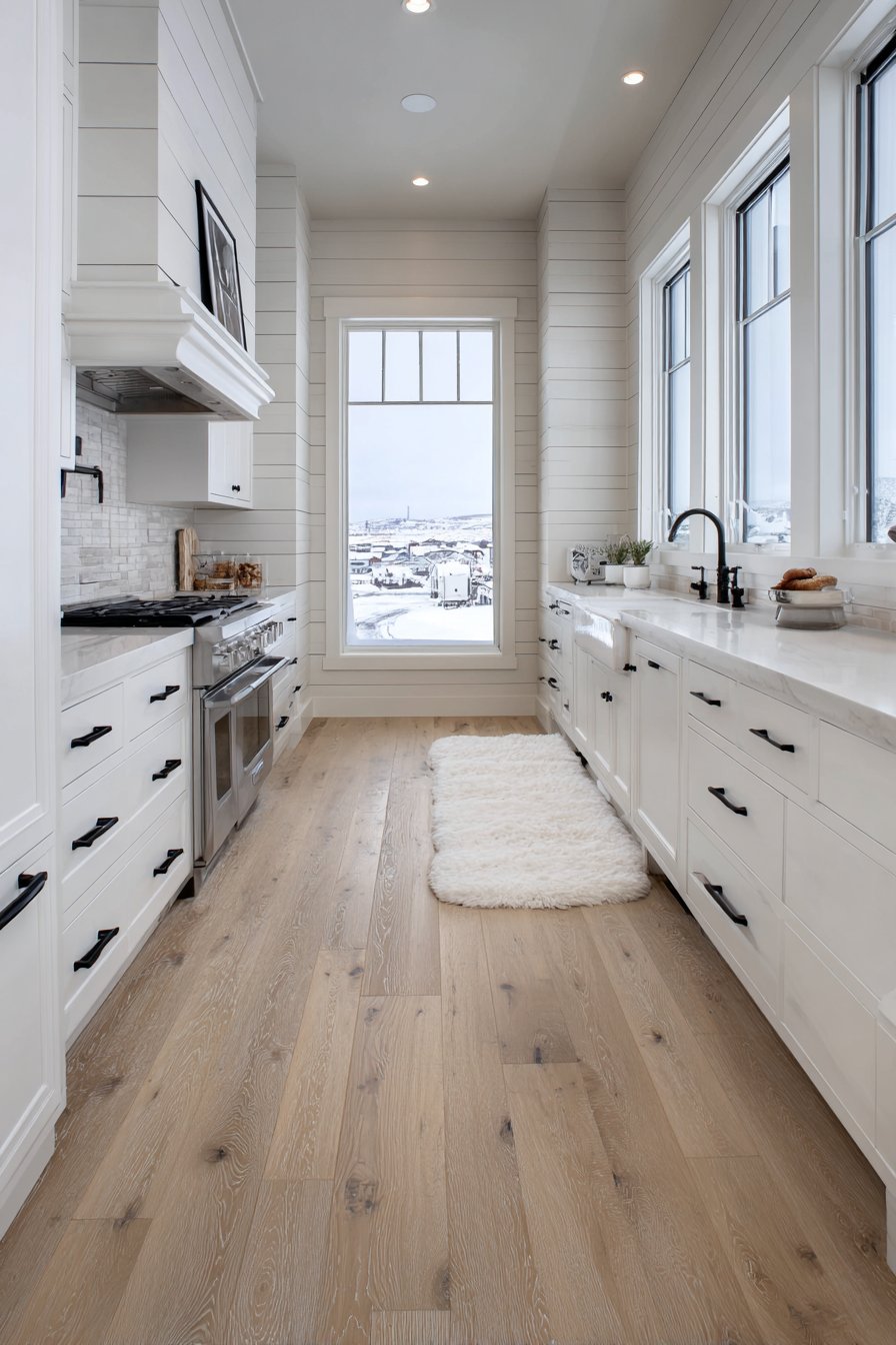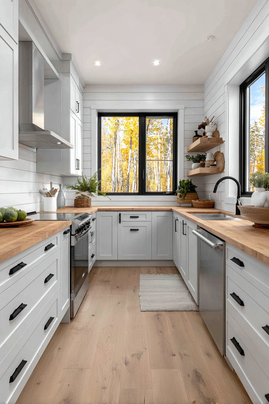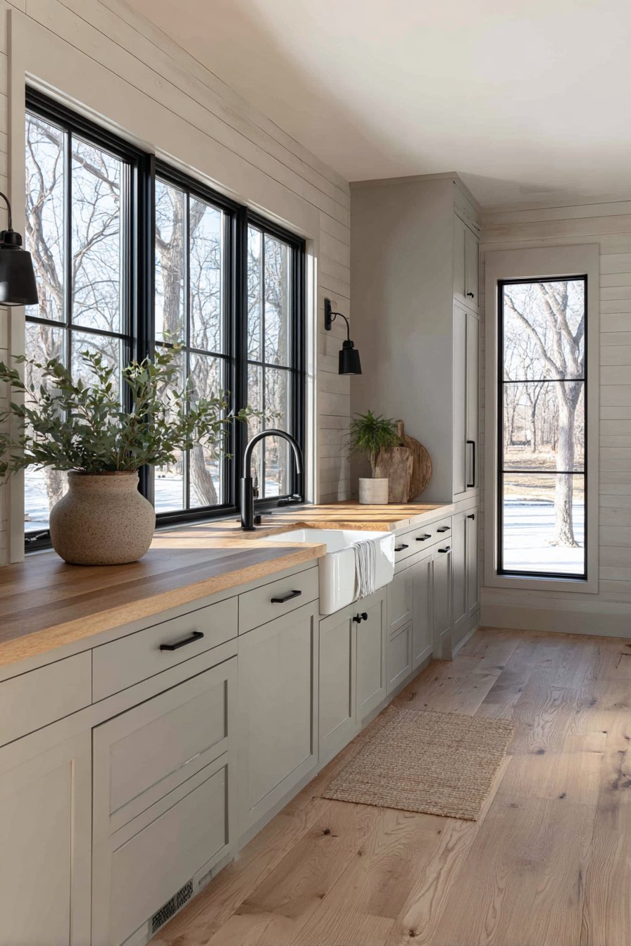 Achieving the look of architectural elements through paint alone represents both economical practicality and creative problem-solving. This farmhouse kitchen demonstrates faux-textured shiplap walls painted in soft dove gray, where paint application emphasizes horizontal lines to create texture effects without actual wood planks. The technique delivers shiplap’s characteristic horizontal rhythm and farmhouse appeal without the expense, installation complexity, or moisture concerns of actual wood. The subtle texture adds visual interest while maintaining the clean, uncluttered aesthetic that defines modern farmhouse style.