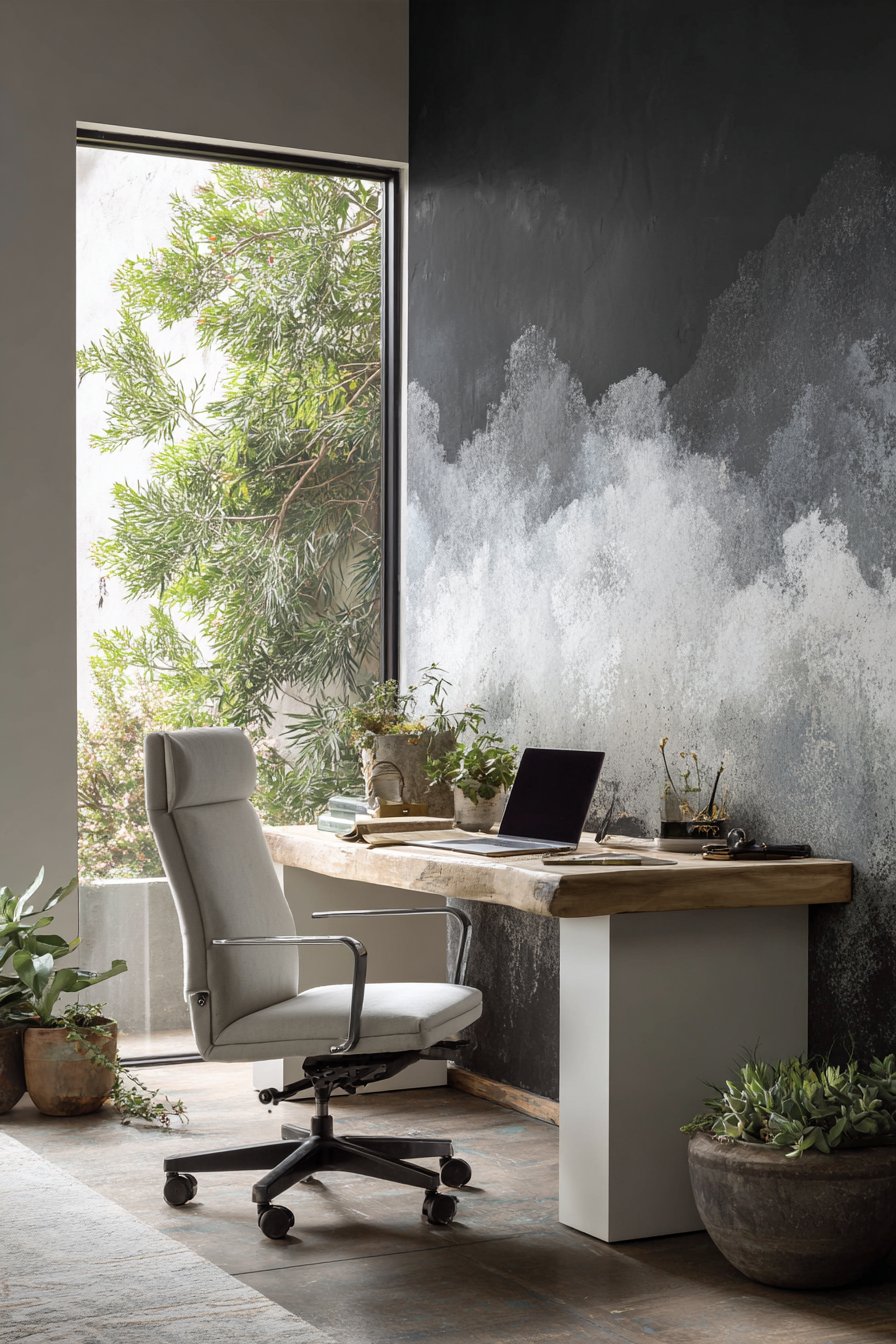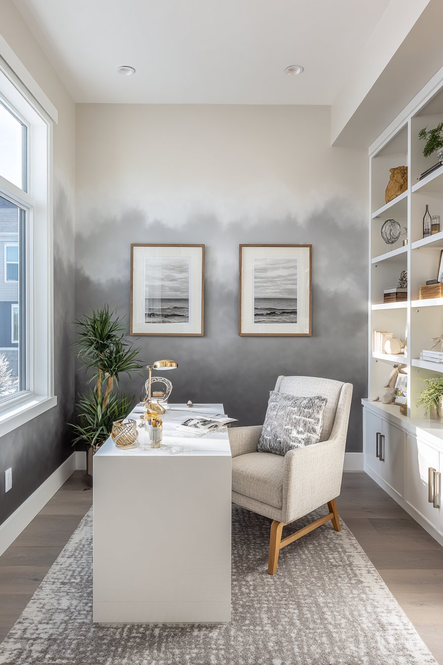 Ombre effects have transcended their origins in fashion and hair styling to become a compelling wall painting technique that creates dramatic visual interest through seamless color transitions. This home office application demonstrates the technique’s versatility, progressing from deep charcoal gray at the floor to luminous light silver at the ceiling. The gradual transition creates an illusion of height, making the room feel more spacious while establishing a contemporary aesthetic that complements modern work environments. Unlike abrupt color changes, the smooth gradient requires careful blending and patience, resulting in a custom artistic effect impossible to achieve with standard paint applications.