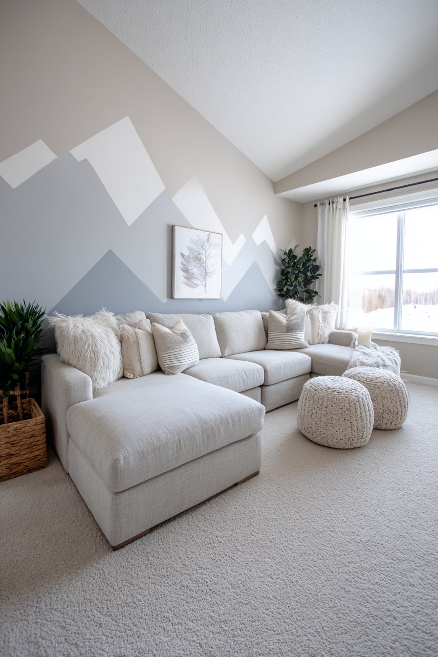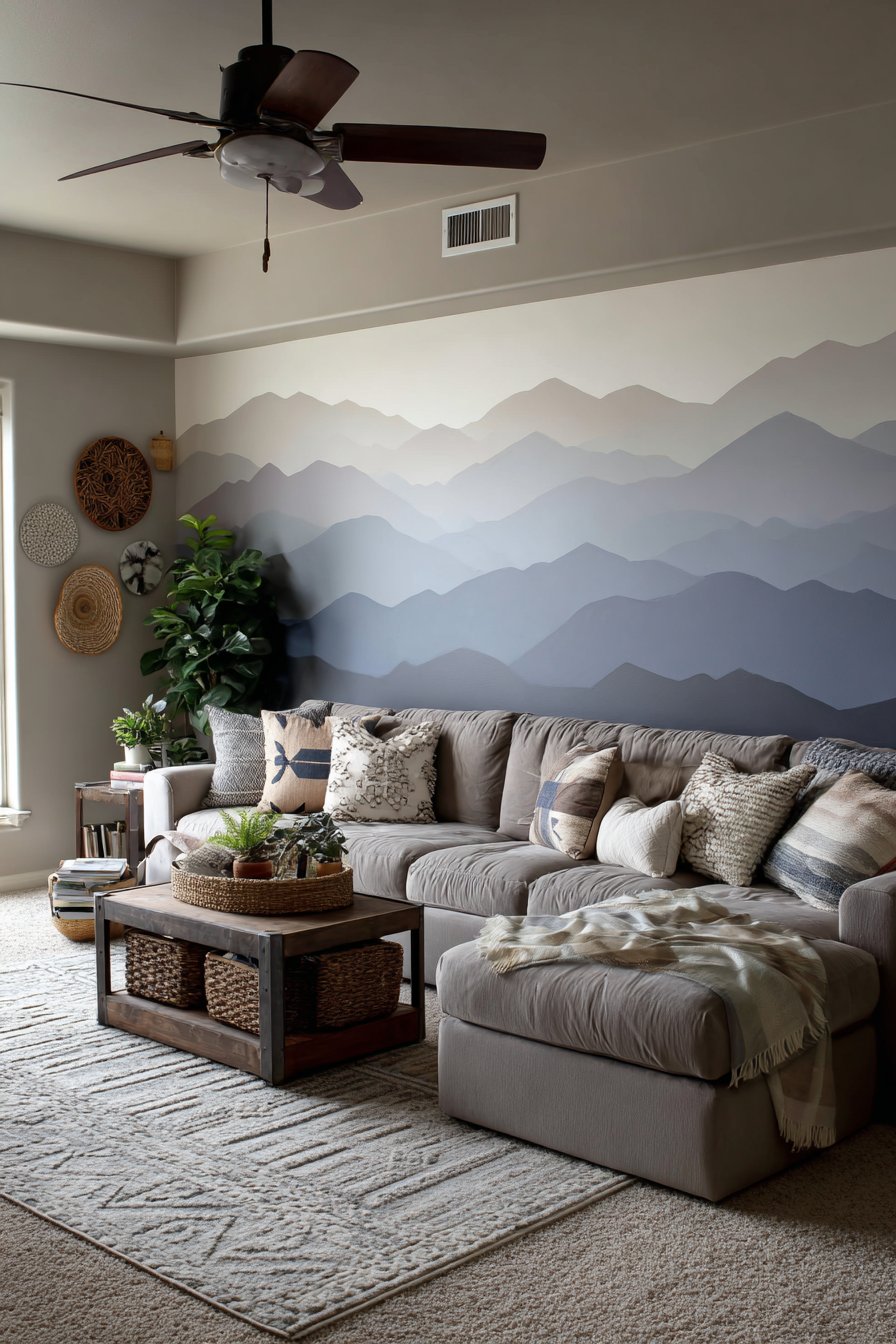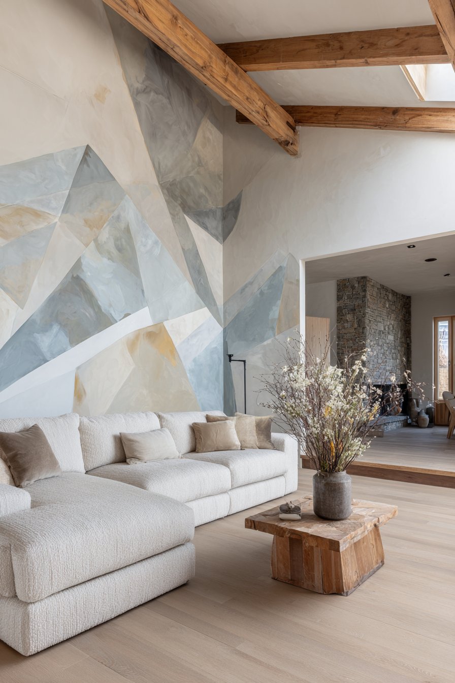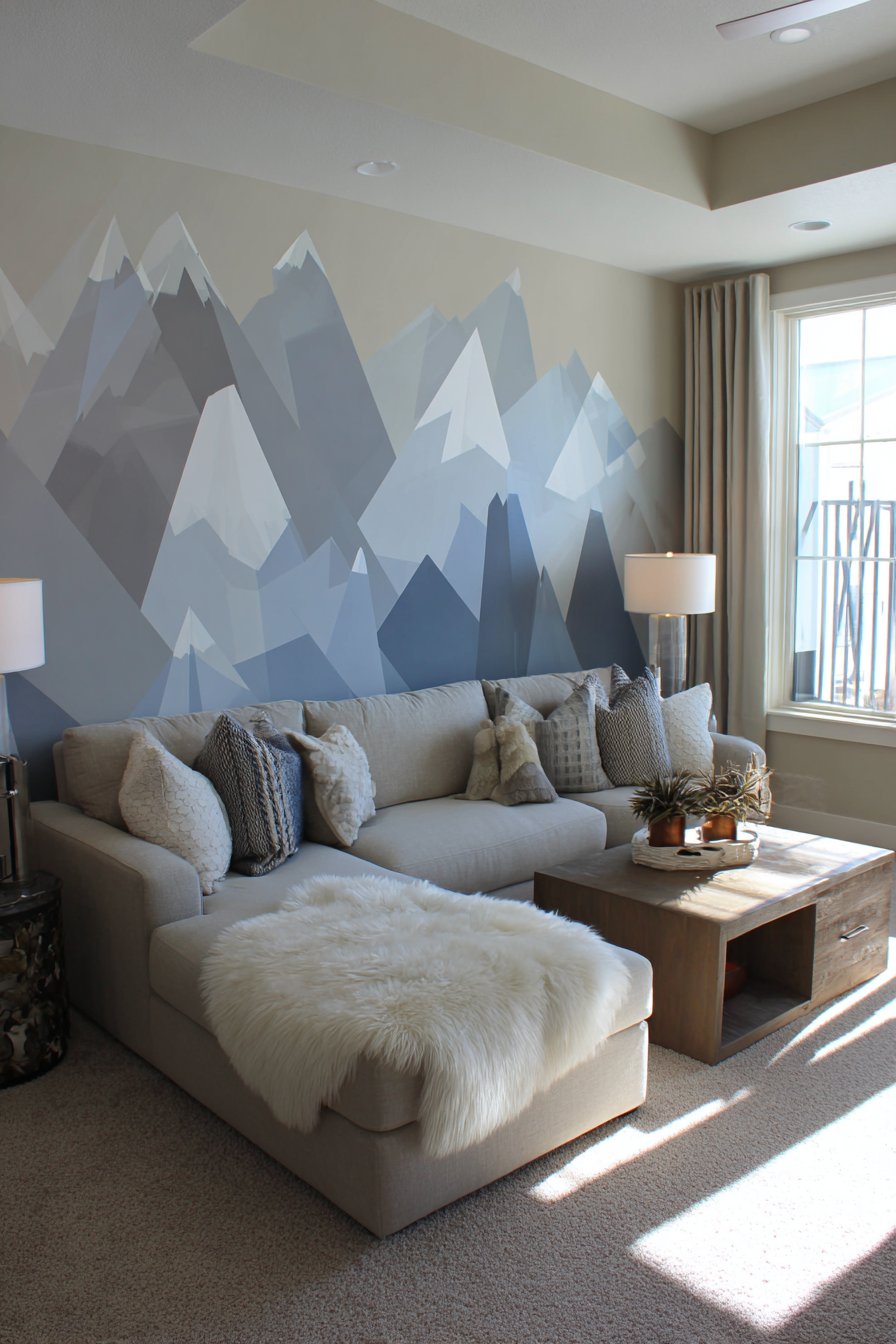 Murals have evolved from purely decorative elements to sophisticated design features that anchor spaces with artistic intention. This geometric mountain range approach offers a contemporary take on landscape art, translating natural forms into angular, stylized peaks rendered in a harmonious palette of gray, taupe, and soft blue. The muted color scheme ensures the mural enhances rather than dominates the living room, creating a calming focal point that serves as both art and backdrop. The geometric interpretation of mountains strikes an ideal balance between recognizable imagery and abstract design, making it sophisticated enough for mature spaces while remaining accessible and universally appealing.