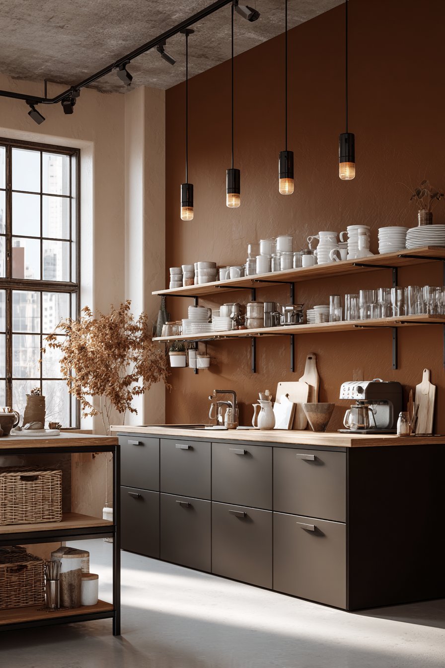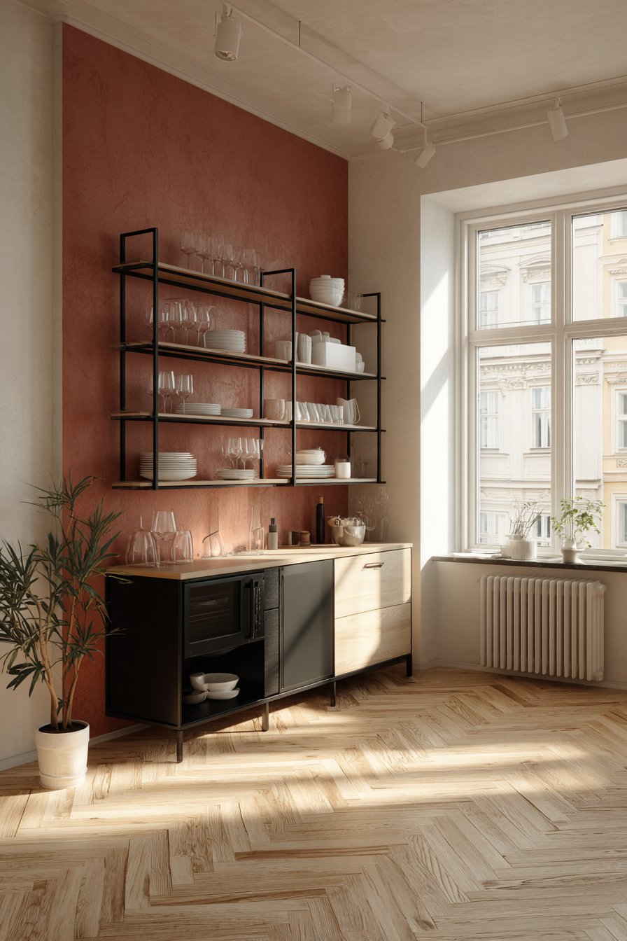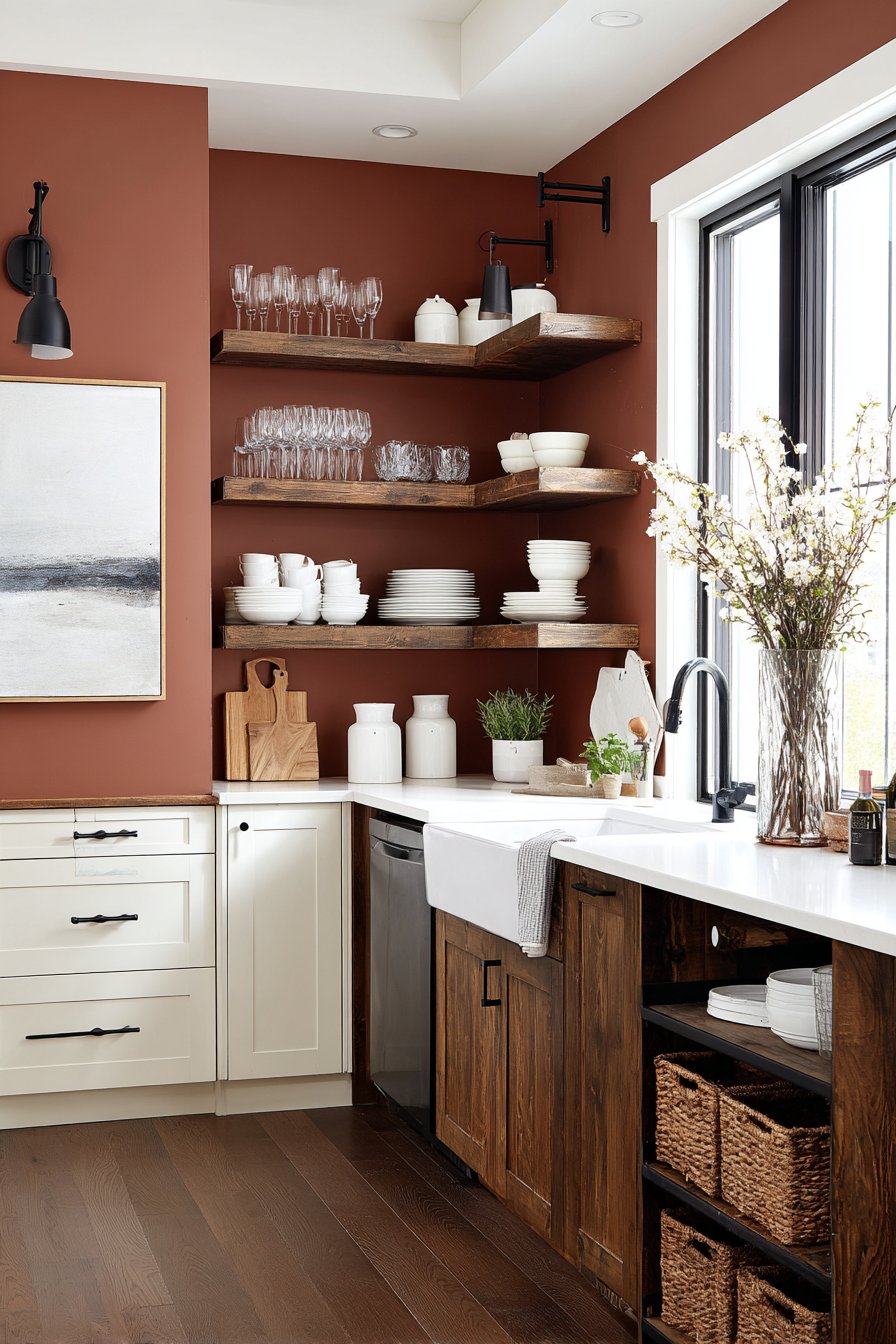 Kitchens increasingly serve as design showcases rather than purely functional spaces, with homeowners recognizing opportunities to inject personality into these hardworking rooms. A bold terracotta accent wall behind open shelving creates an immediate warmth and earthiness that contrasts beautifully with modern kitchen elements. The rich, sunset-inspired hue brings energy and appetite appeal—appropriate for spaces centered around food and gathering—while remaining sophisticated enough for contemporary design sensibilities. Against this warm backdrop, white dishes and glassware on open shelves pop dramatically, creating a curated display that functions as both storage and visual interest.
