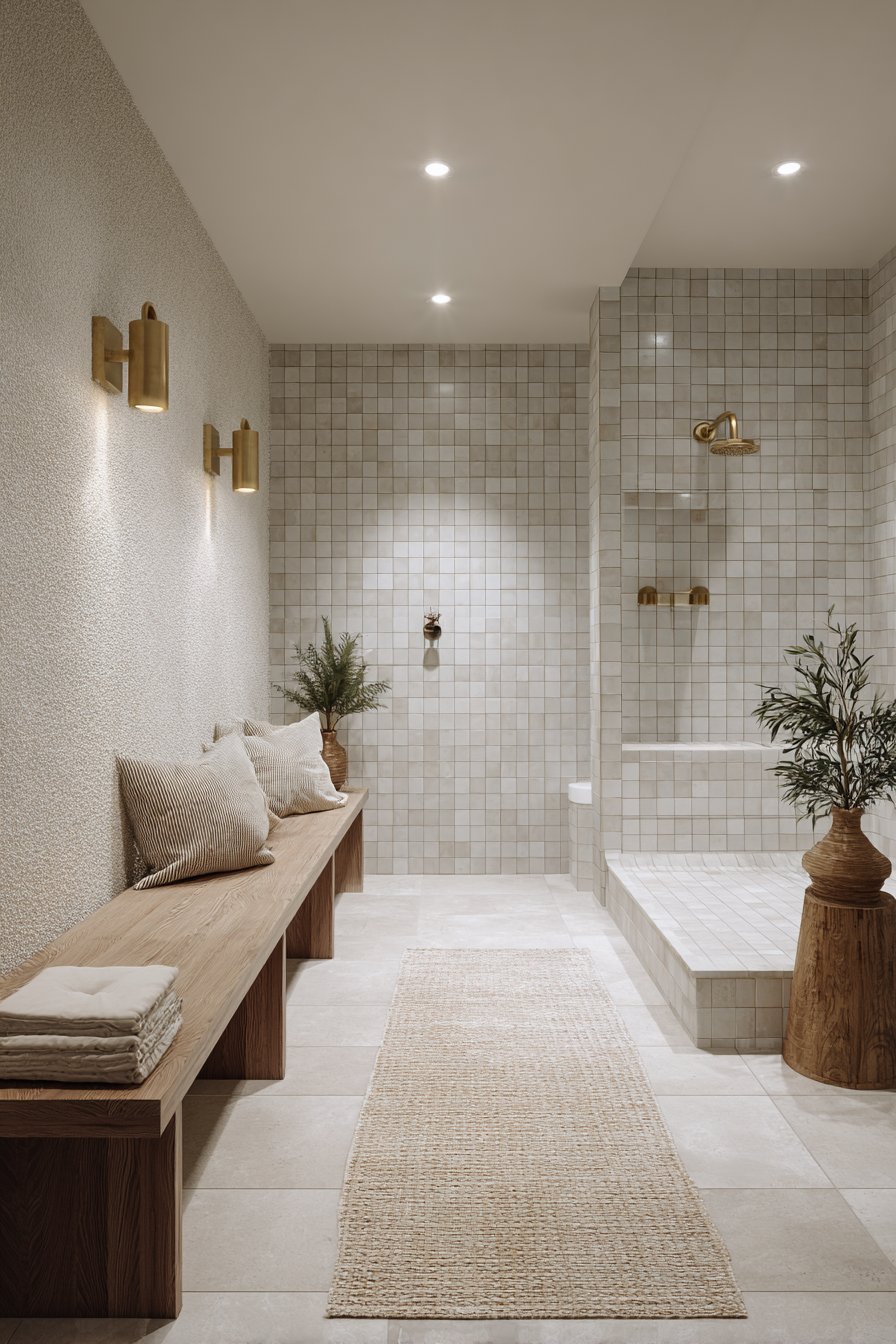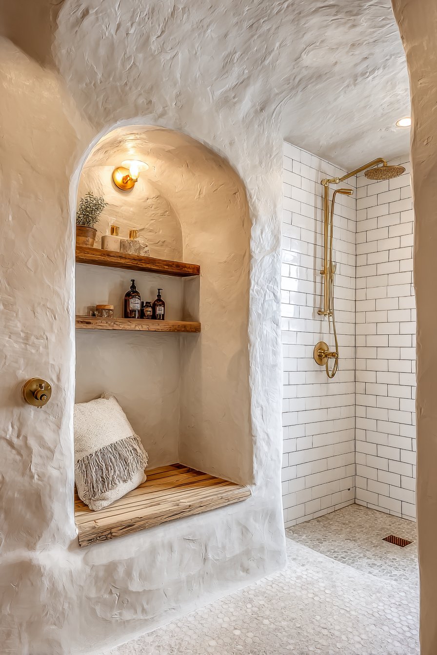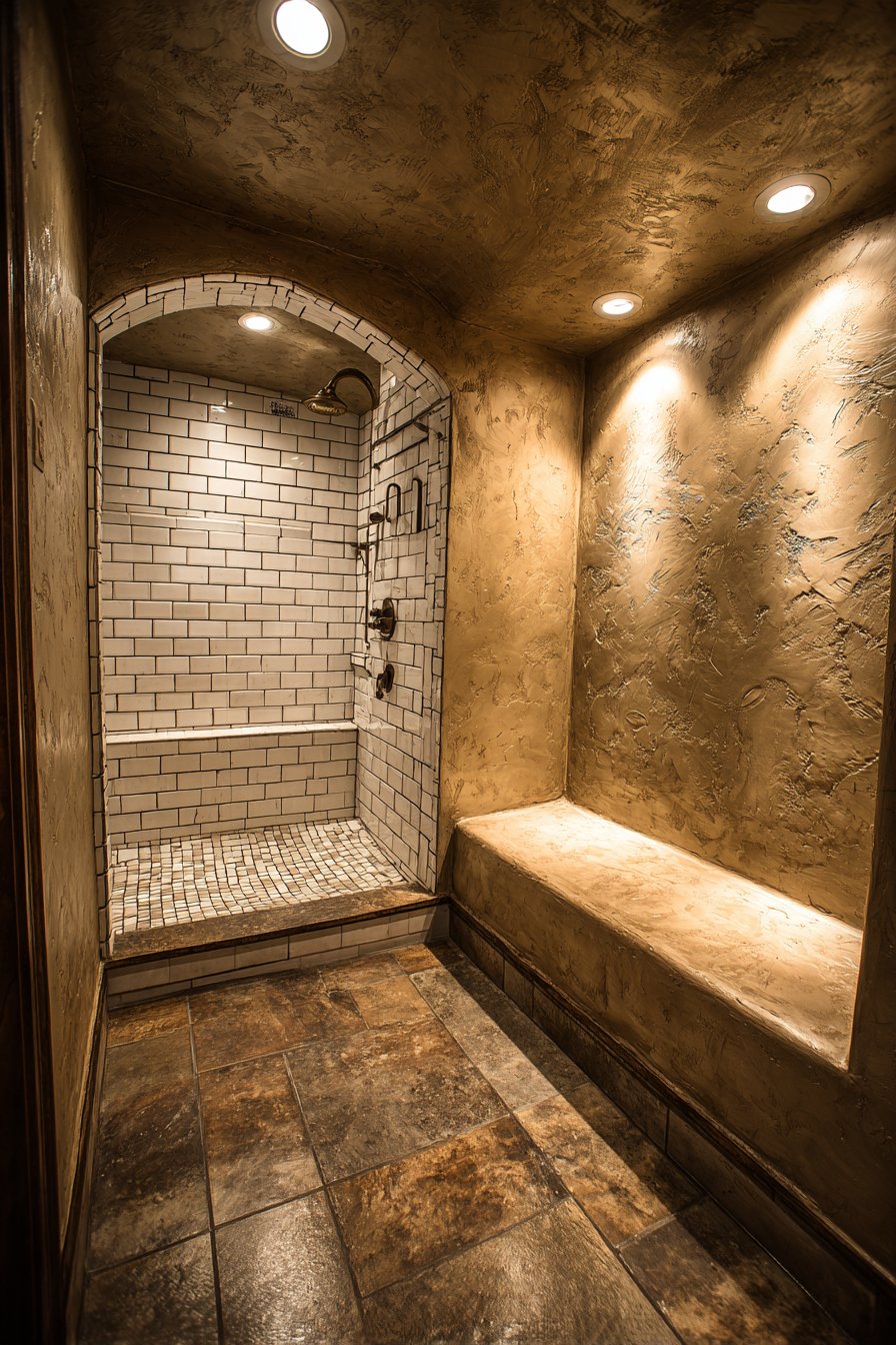 Texture in wall finishes adds a tactile dimension that elevates spaces beyond what smooth, flat paint can achieve. This bathroom treatment employs a textured stucco-effect paint technique in warm sand tones, evoking Mediterranean villas and European coastal retreats. The dimensional surface catches and reflects light irregularly, creating ever-changing shadow patterns throughout the day that add vitality and interest to what might otherwise be a static bathroom design. The organic, handcrafted quality of textured finishes introduces warmth and character that contrasts beautifully with the smooth, hard surfaces typical of bathrooms—tile, glass, porcelain, and metal.