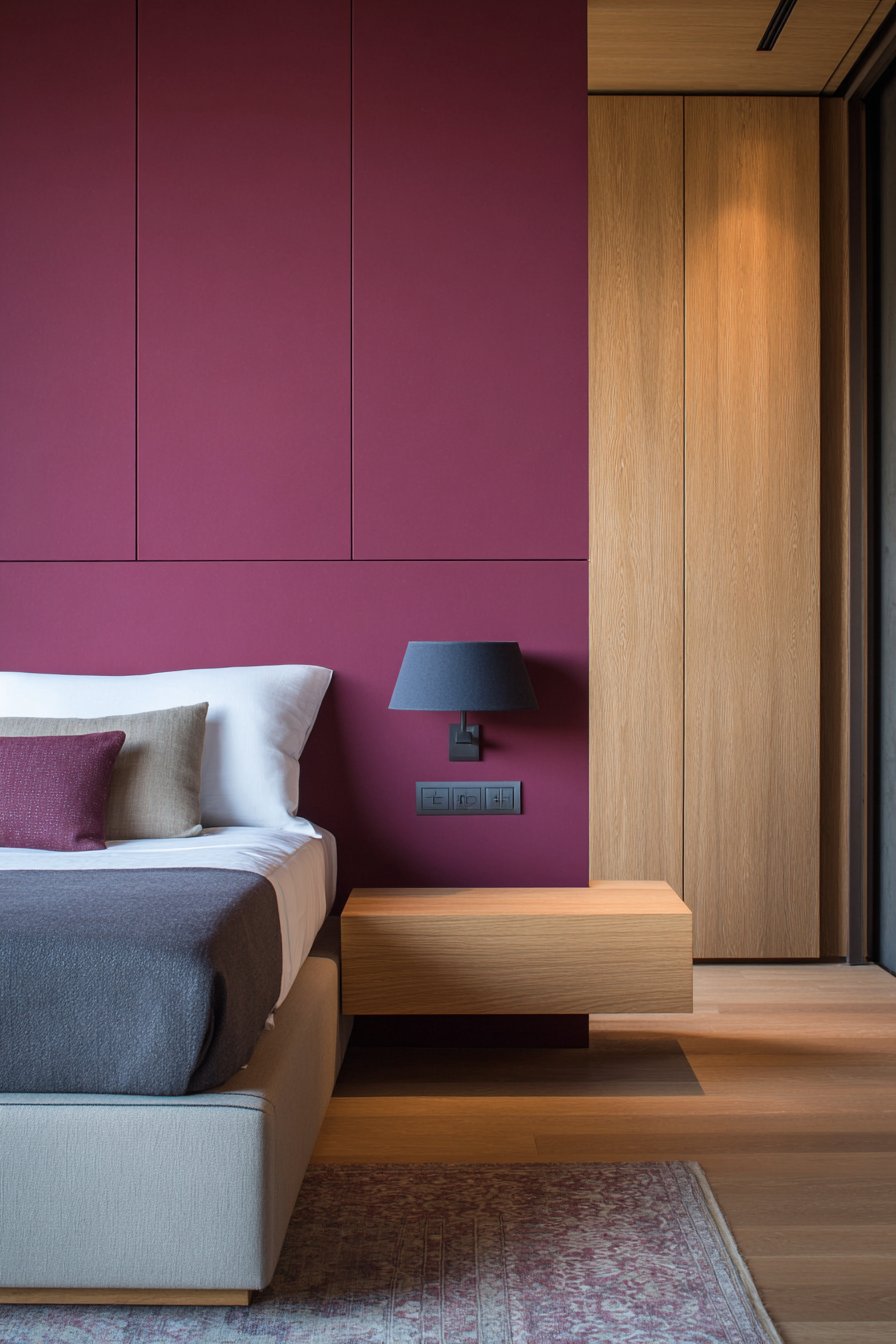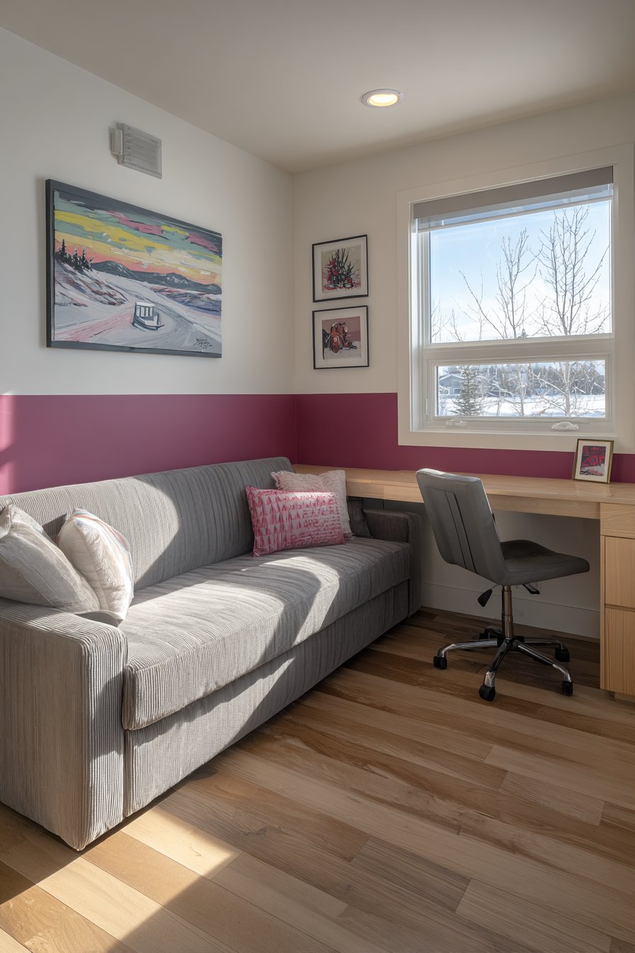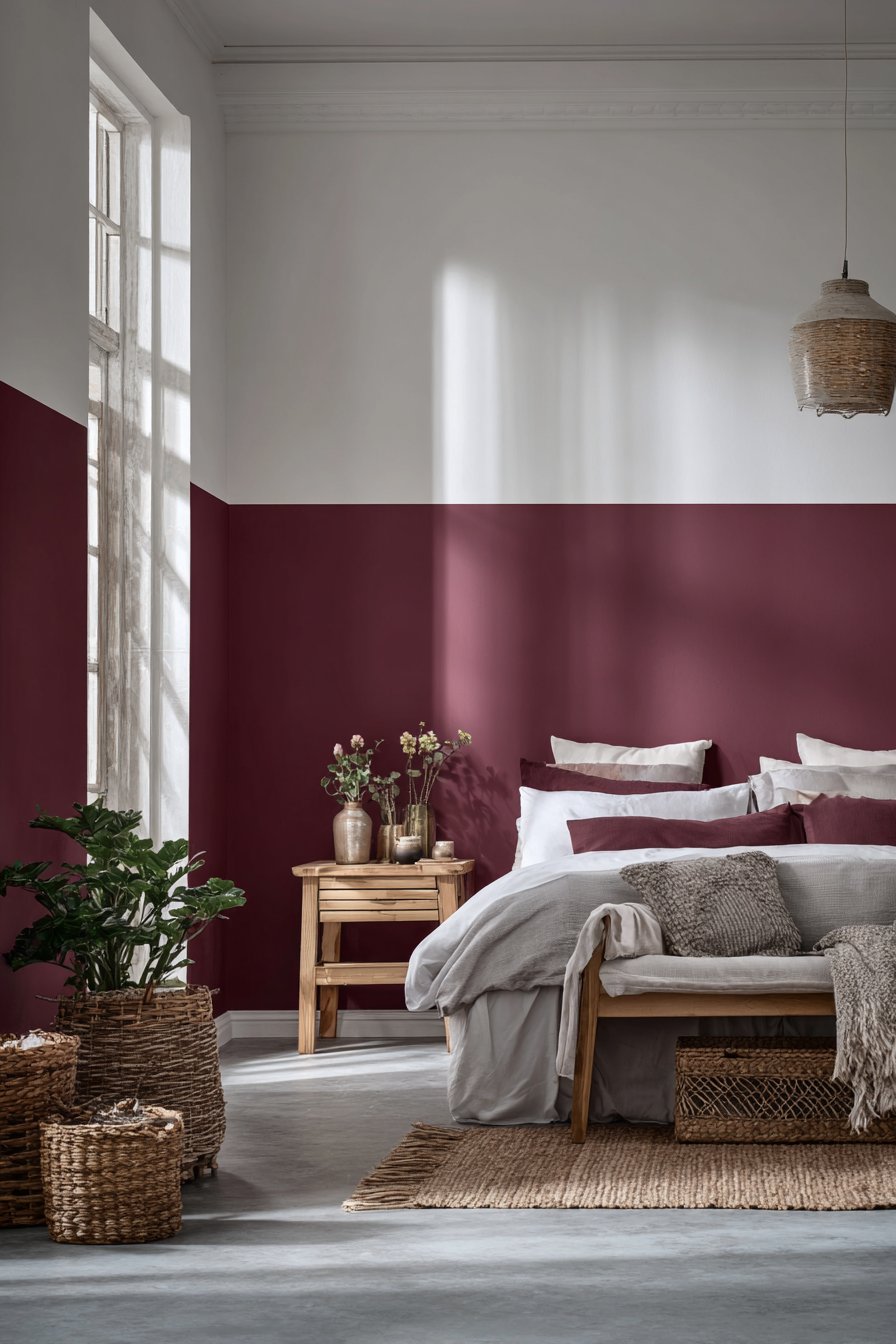 The color-dipped technique offers a fresh, contemporary approach to wall painting that creates bold statements without overwhelming spaces. This teen bedroom application features deep plum paint extending approximately three feet up from the floor, creating a striking horizontal band with crisp, clean edges against the white walls above. The effect resembles objects dipped in paint or dye—hence the name—producing a modern, graphic quality that appeals to younger sensibilities while remaining sophisticated enough to age gracefully as tastes mature.