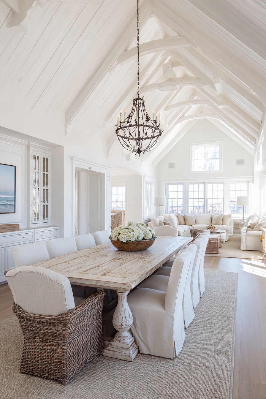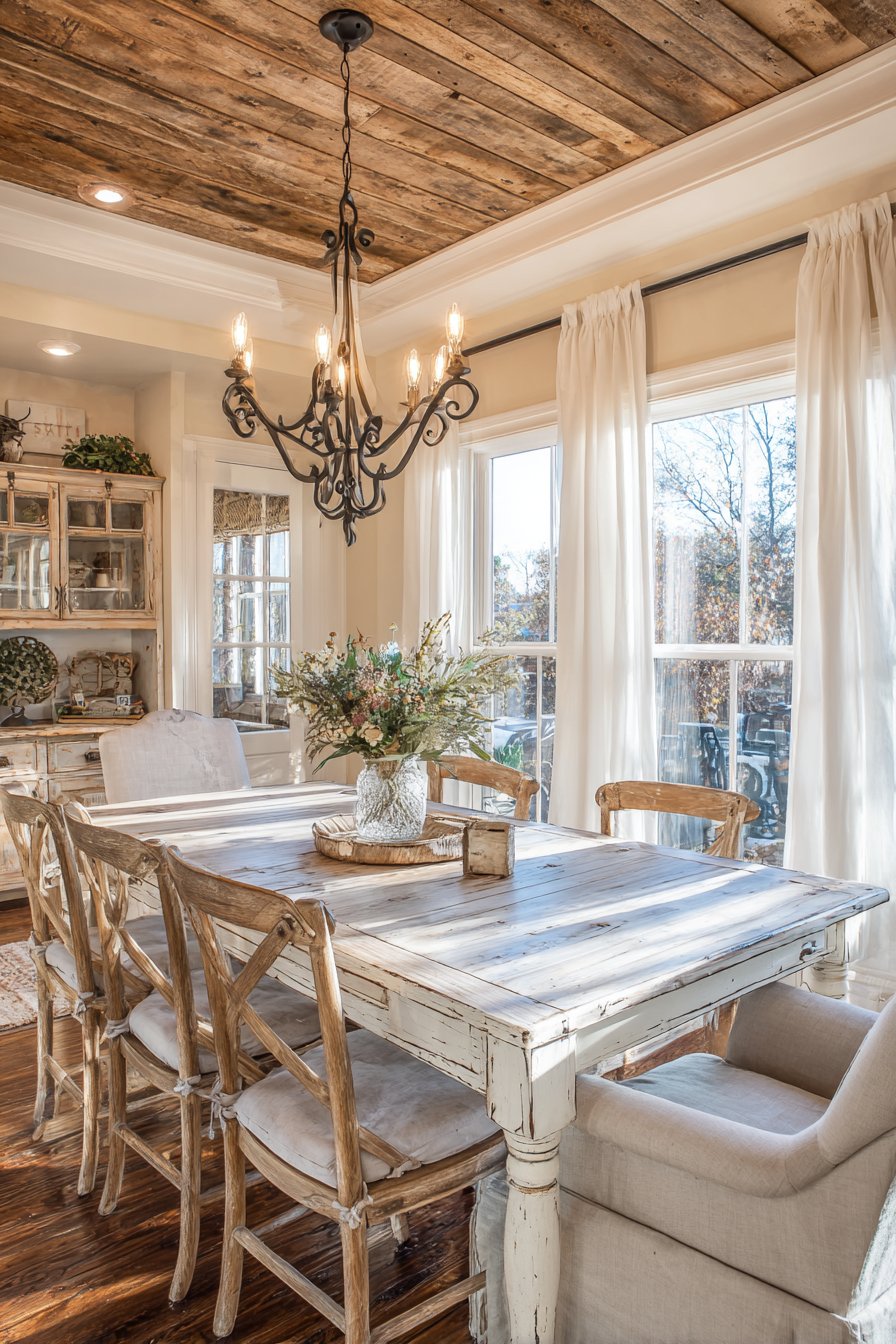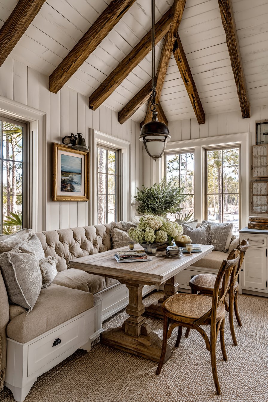 Open ceiling construction featuring painted white beams contrasting against natural wood tongue-and-groove planking creates dramatic architectural interest in this cottage dining room. The exposed structure adds height and volume to the space while the white beams prevent the ceiling from feeling too dark or heavy. This treatment showcases the home’s construction in a way that adds rather than detracts from the finished space.