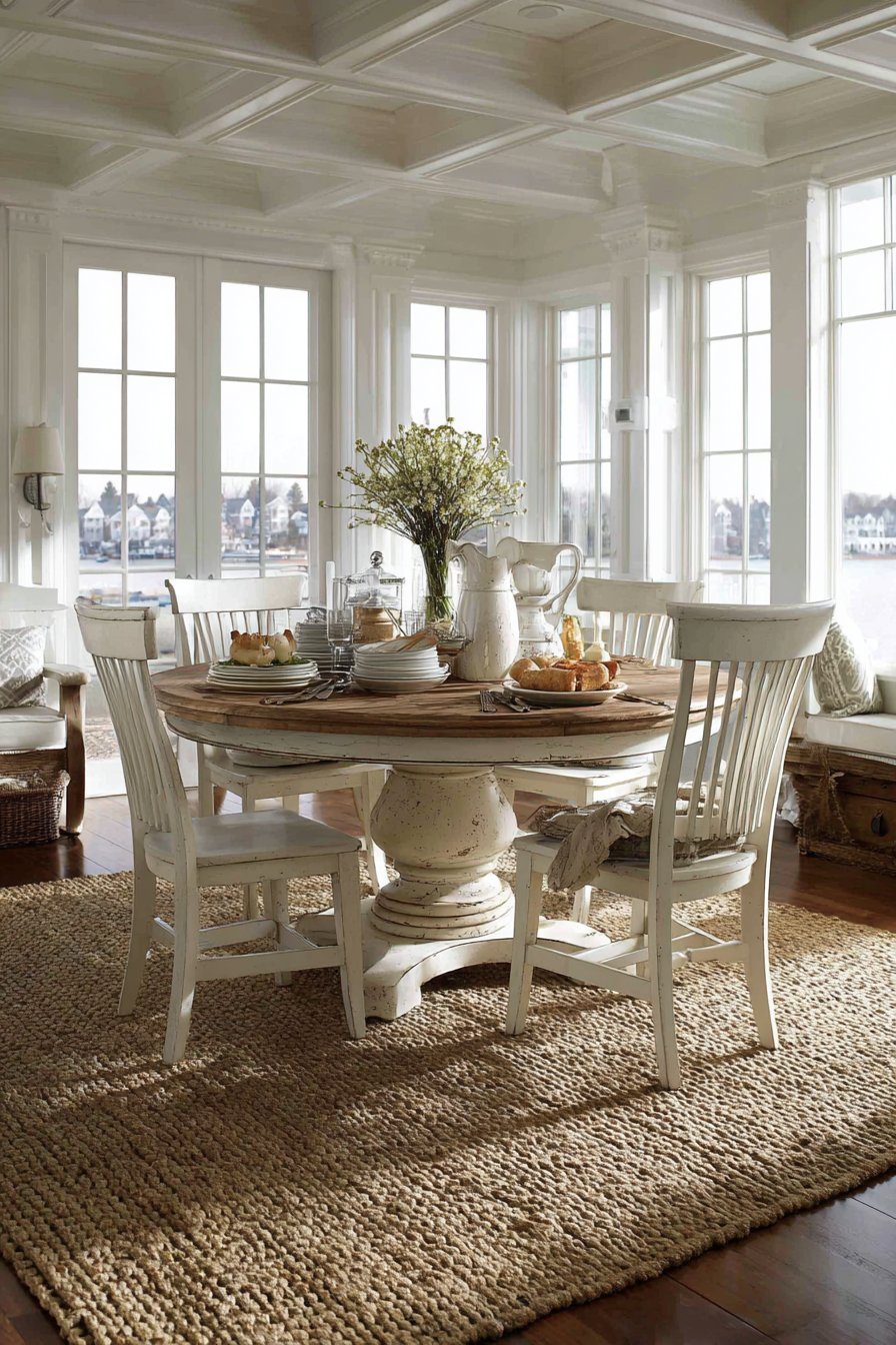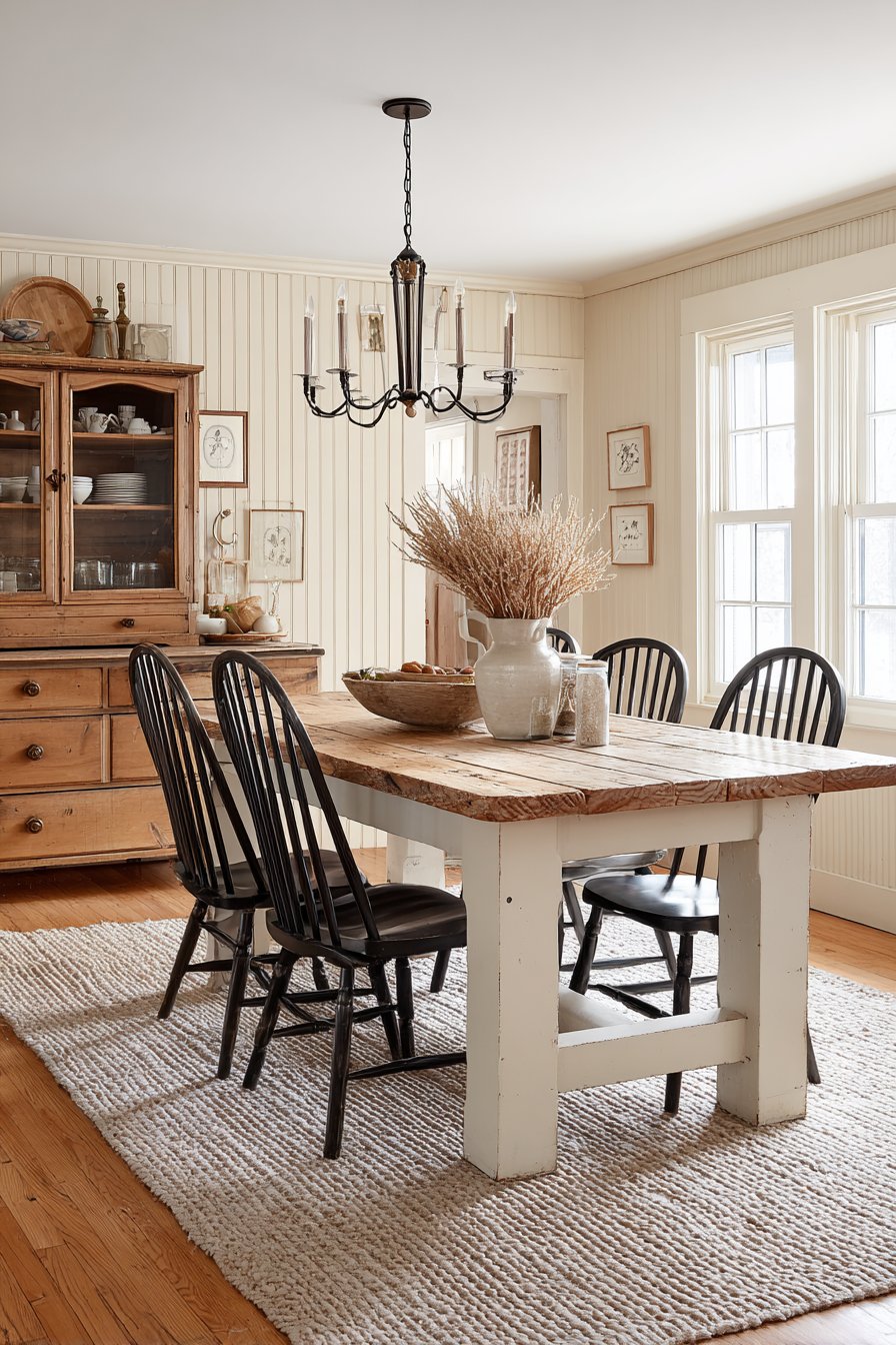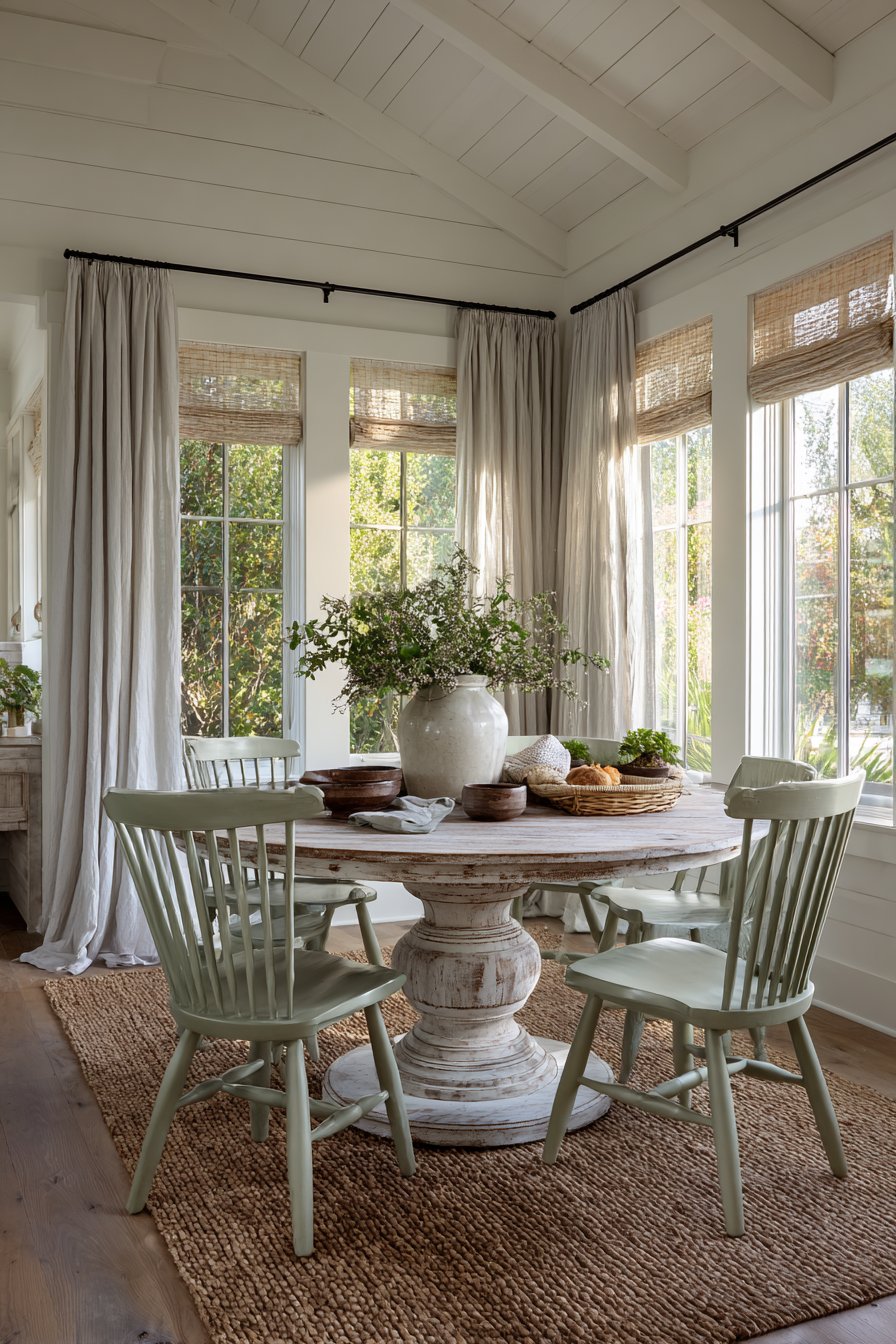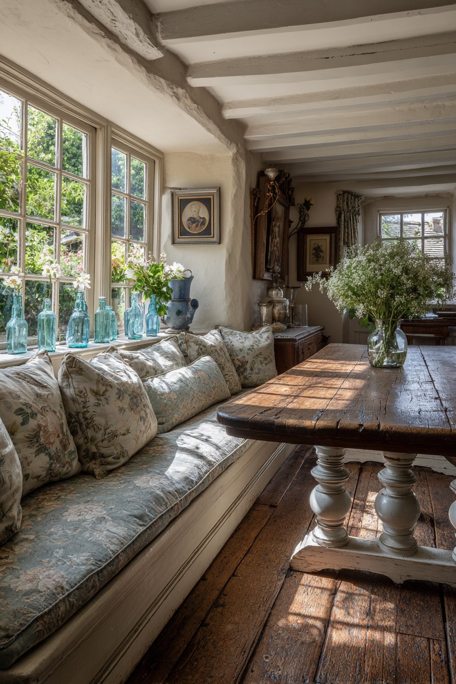 The furniture selections in these cottage dining rooms exemplify quality over quantity, choosing substantial pieces built to last generations rather than disposable furnishings. Farmhouse tables, trestle bases, Windsor chairs, and pedestal tables represent furniture forms perfected over centuries of use, their designs proven through time. The combination of painted and natural wood finishes adds depth and visual interest while the acceptance of distressed surfaces and authentic wear marks celebrates real life rather than showroom perfection. This approach creates dining spaces that welcome use and gathering rather than demanding careful preservation.