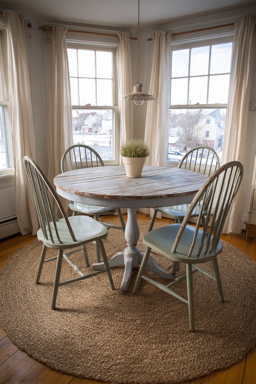 A braided rag rug adds color and pattern beneath the table, its concentric circles of recycled fabric representing cottage resourcefulness and handcraft traditions. The rug’s soft texture provides comfort underfoot while protecting floors from chair movement. The varied colors within the rug help tie together disparate elements throughout the room.