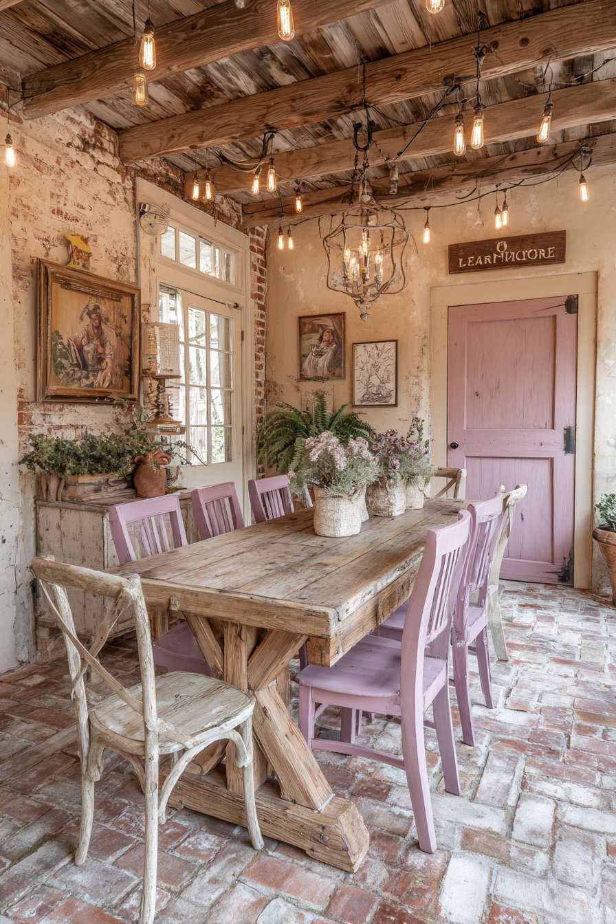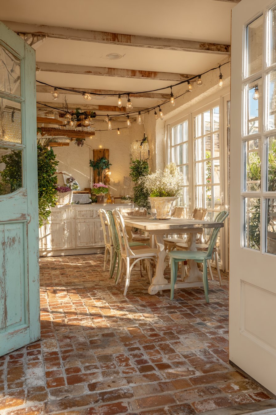 String lights with vintage-style bulbs crisscross overhead, their warm glow creating enchanting ambiance for evening meals and gatherings. This casual lighting approach adds whimsy and romance while providing functional illumination. Brick flooring with a worn patina adds authentic cottage character underfoot, its irregular surface and aged appearance contributing to the room’s rustic charm.