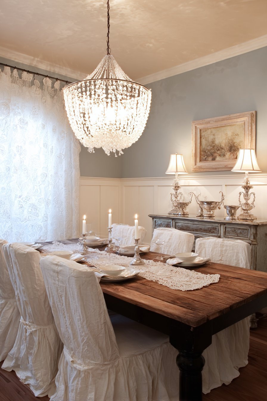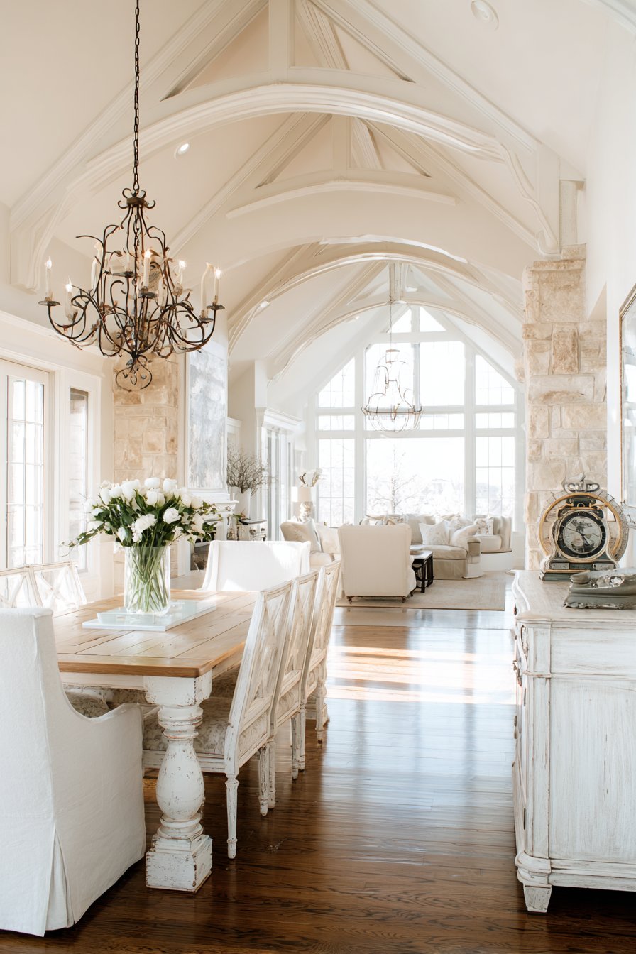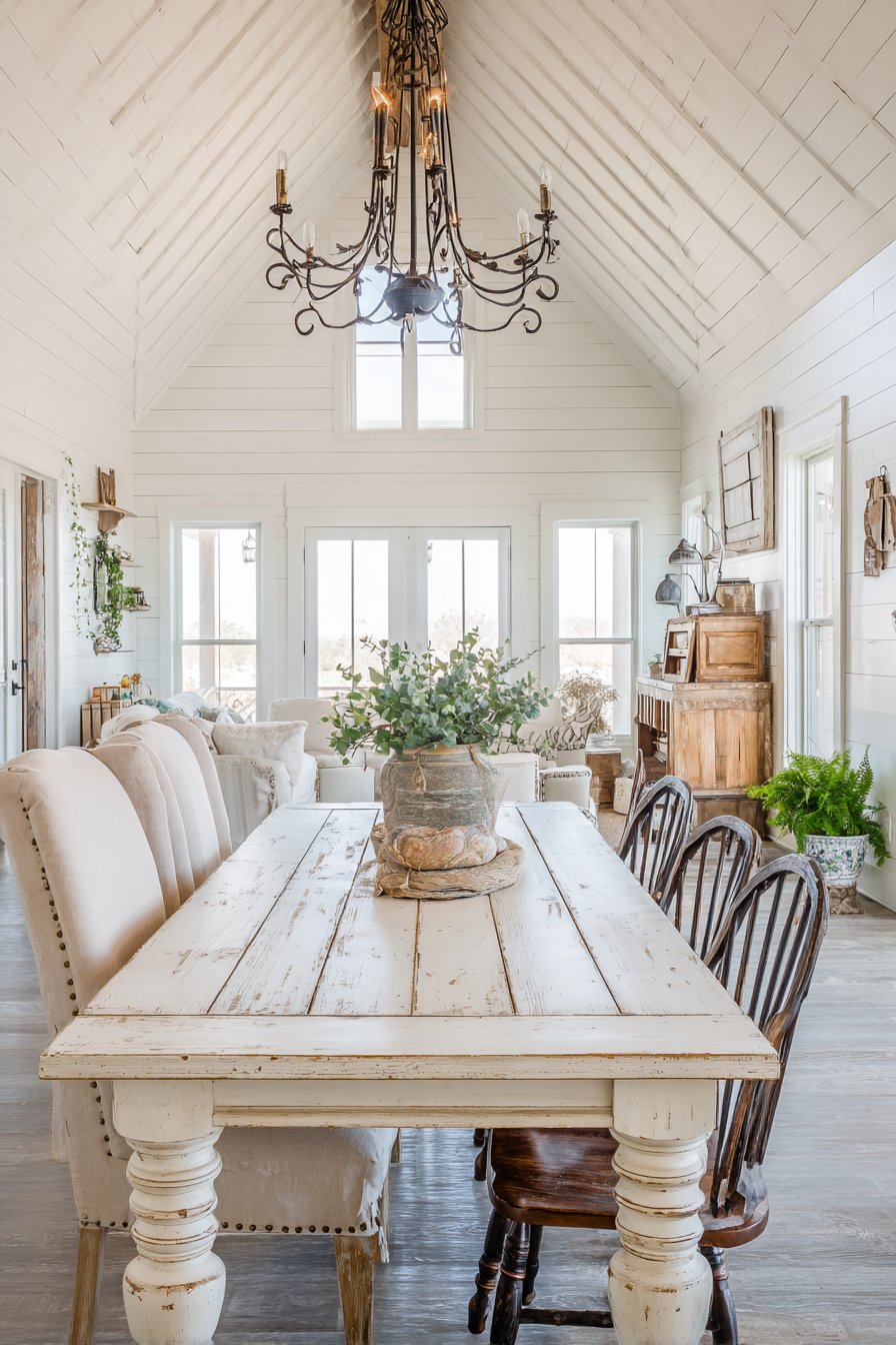 A farmhouse table with turned legs in distressed white finish centers beneath a wrought iron chandelier, the traditional elements combining to create classic cottage aesthetic. The turned legs add decorative detail that elevates the simple table form, while the distressed finish suggests generations of family use. The wrought iron chandelier’s substantial scale matches the room’s height while its traditional candelabra form references historical lighting.