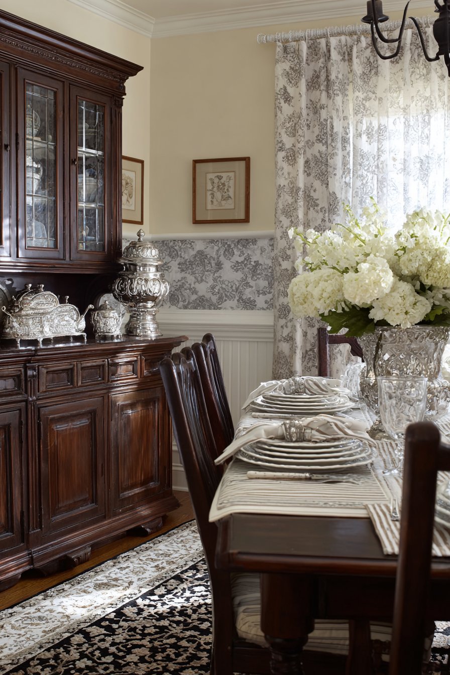 Wainscoting painted in dove gray below chair rail molding creates elegant contrast with cream walls above, establishing sophisticated two-tone treatment in this refined cottage dining room. The gray lower portion adds depth while providing practical protection against chair backs and daily wear. The simple chair rail molding serves as the dividing line between colors, adding architectural detail that elevates basic painted walls into something special.