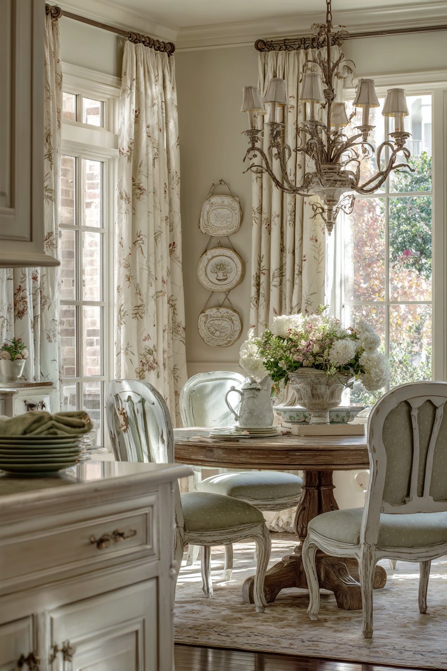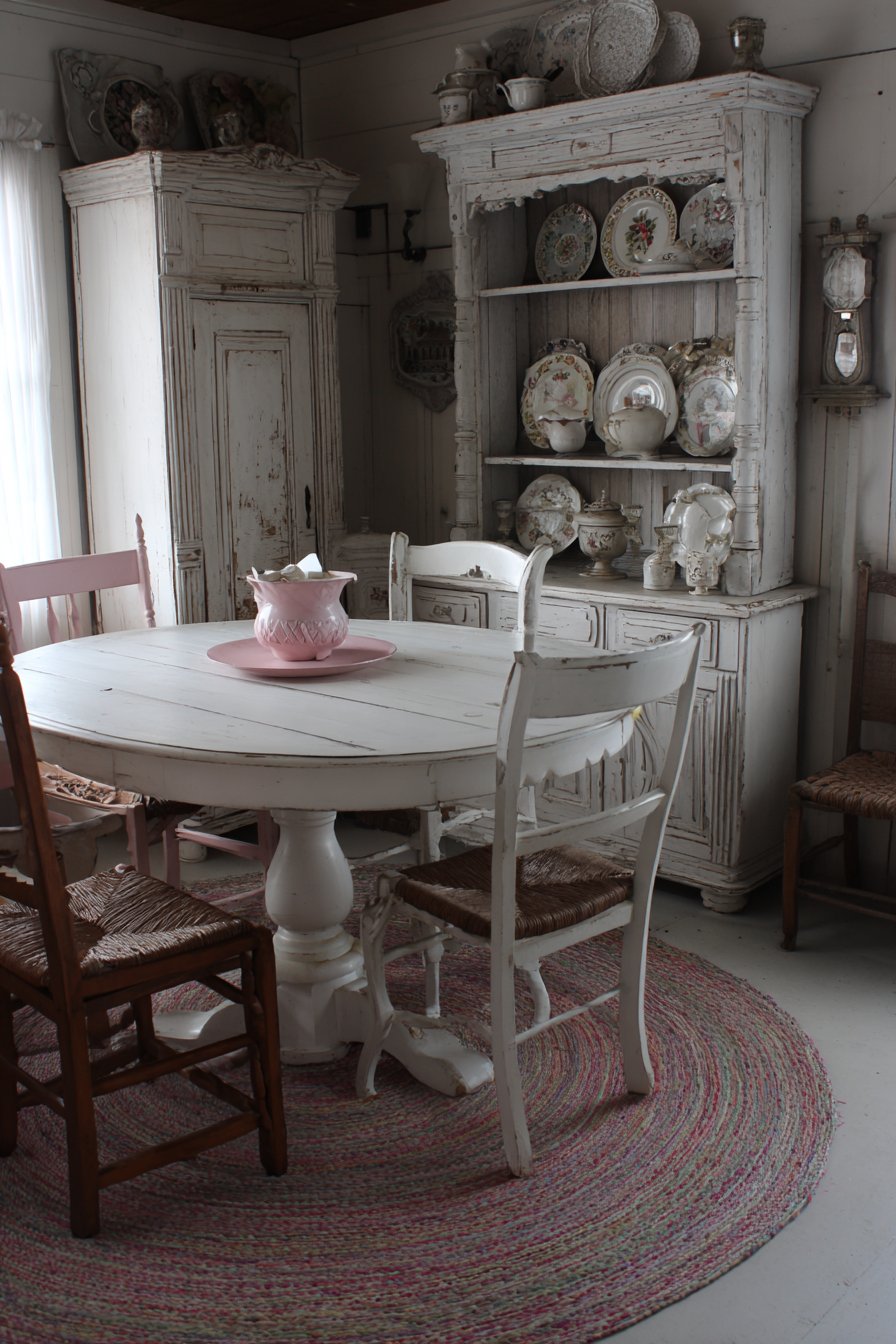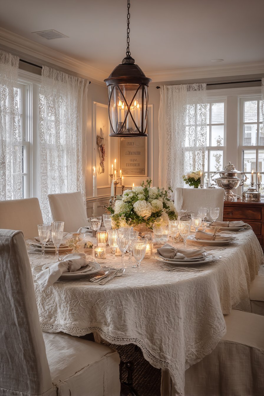 An antique sideboard displays vintage silver serving pieces, their tarnished patina adding to rather than detracting from their beauty in the cottage aesthetic. These functional art pieces represent family history and traditional entertaining, standing ready for special occasions while adding decorative interest daily. Soft diffused lighting filters through lace curtains, creating romantic ambiance that enhances the room’s gentle color palette.
