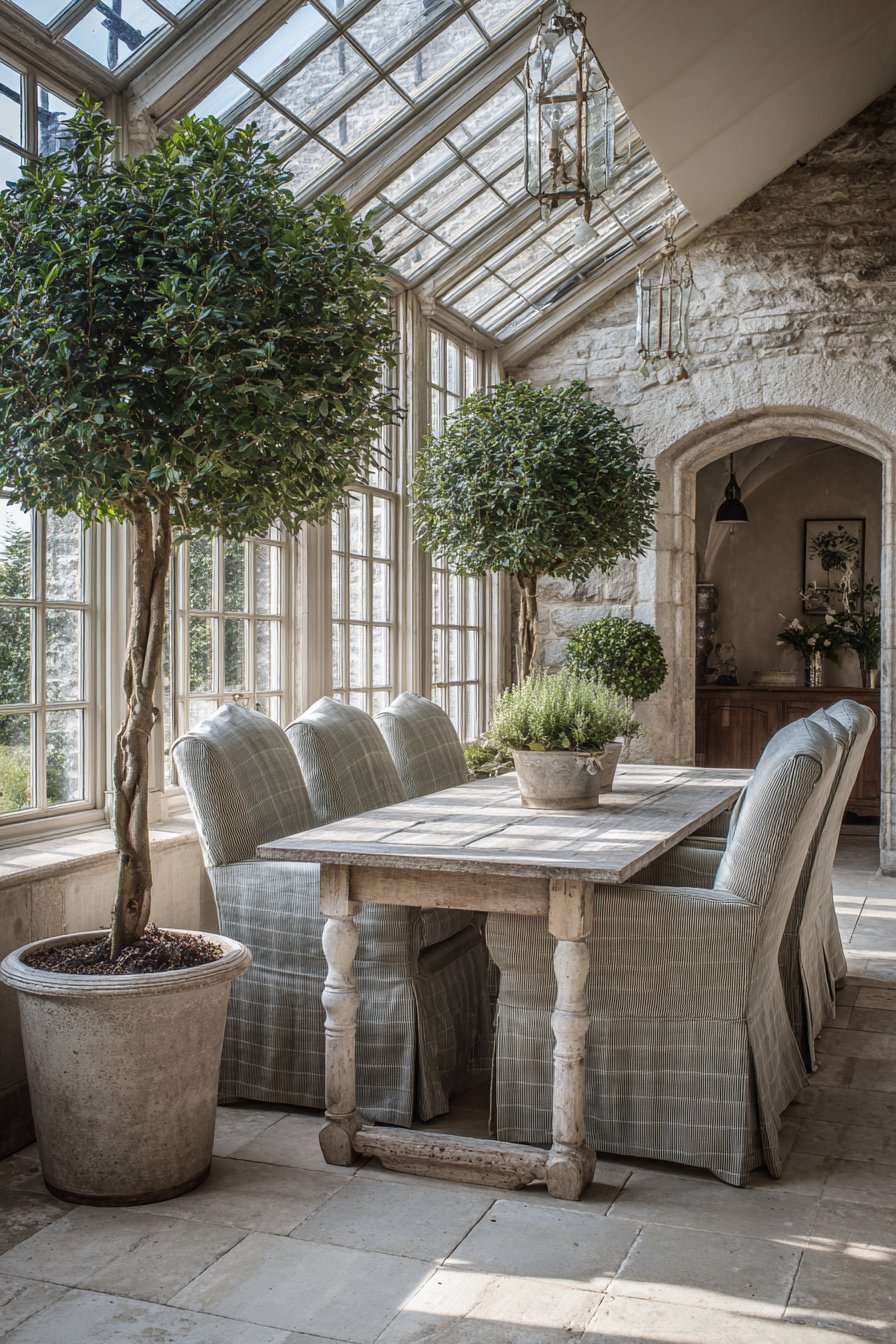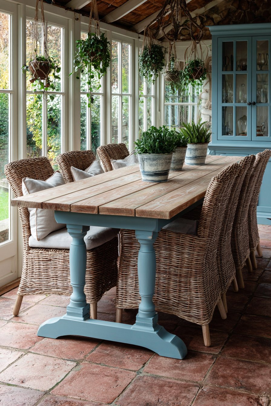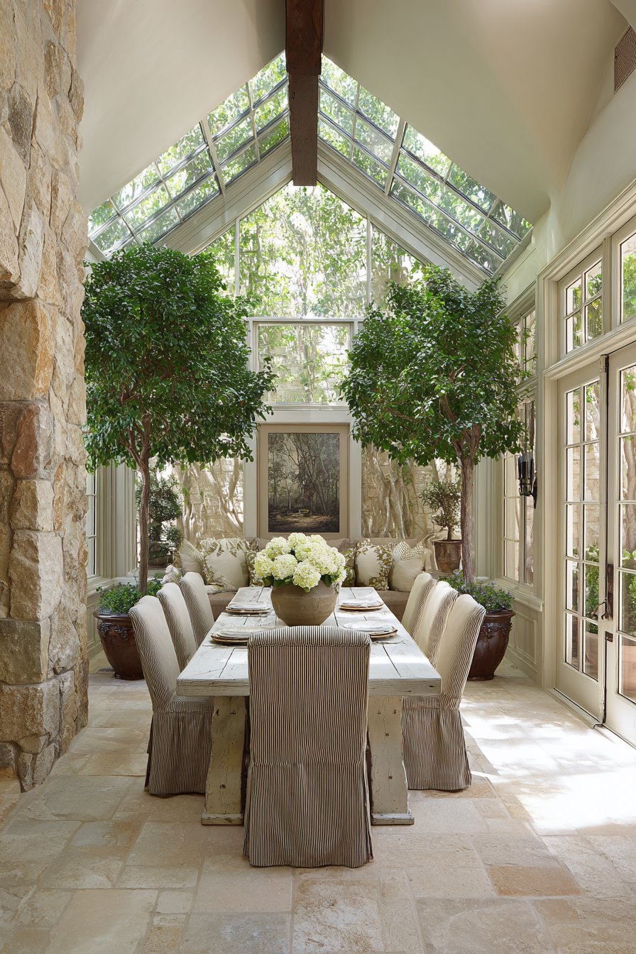 The connection to nature maintained throughout these cottage dining rooms—through abundant windows, fresh flowers, potted herbs, botanical prints, and natural materials—enhances wellbeing and creates life-filled spaces. This biophilic approach recognizes humans’ innate connection to the natural world and designs environments that support this relationship. The changing seasons become part of the interior experience through shifting light patterns, seasonal flowers, and views to gardens and landscapes.