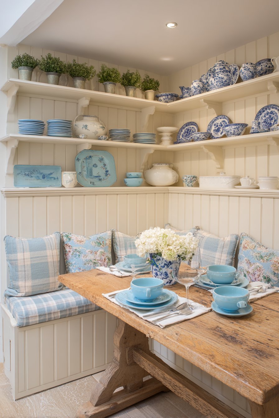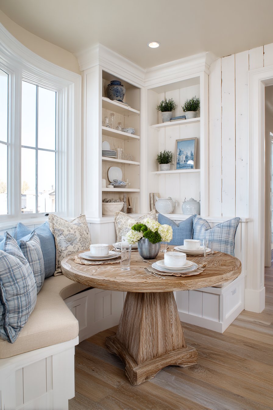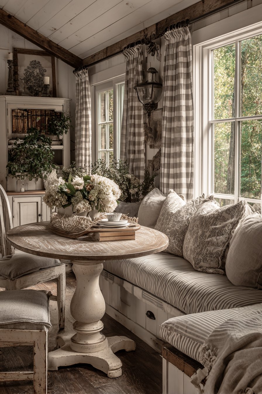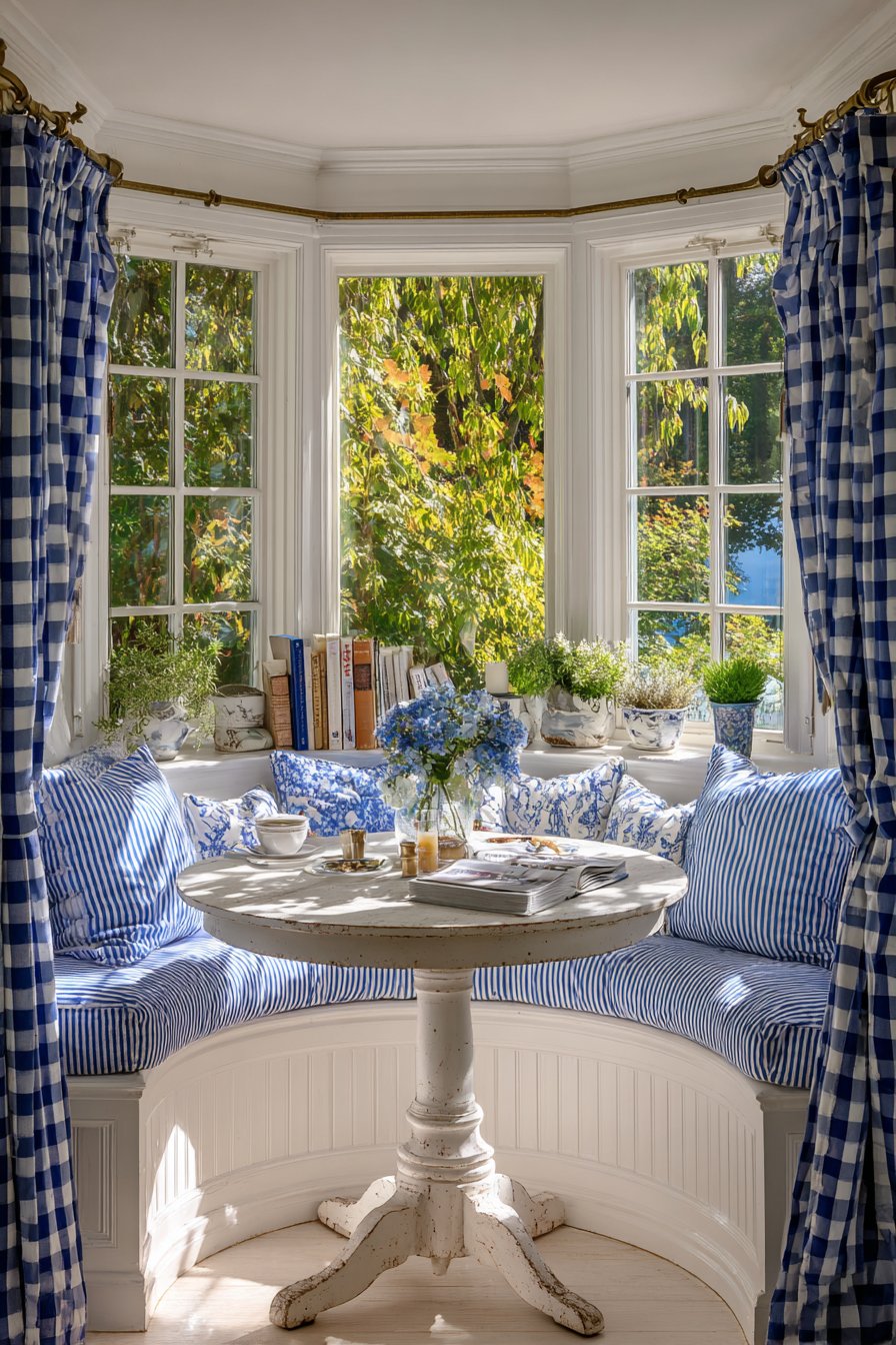 Gingham curtains in coordinating blue and white frame multiple windows, their cheerful pattern reinforcing the cottage aesthetic while filtering natural light into a soft, diffused glow. The gathered curtains add softness to the architectural lines and create rhythm through their repeated pattern. This breakfast nook demonstrates how even the smallest dining areas can achieve big cottage charm through thoughtful design and attention to detail.