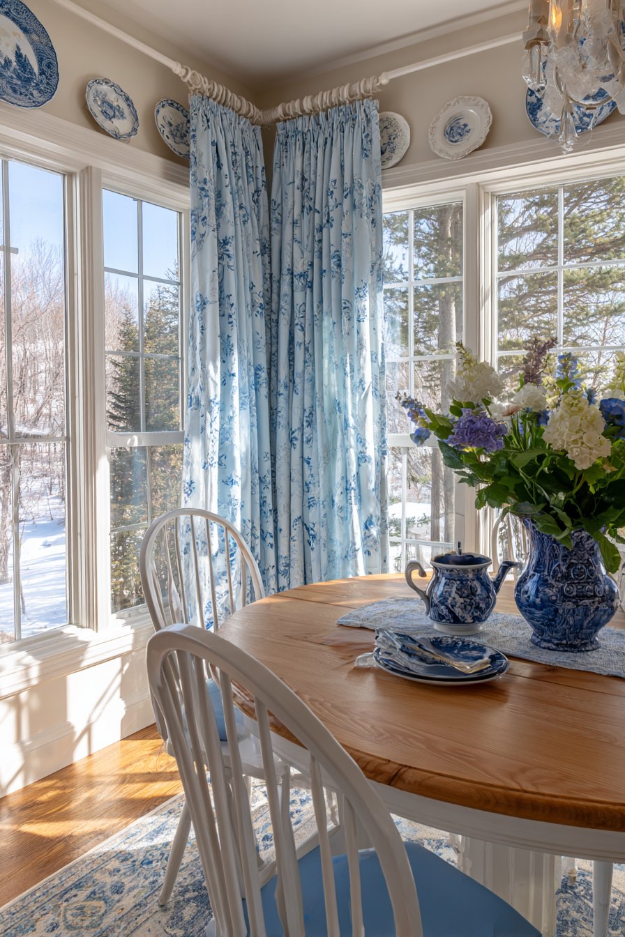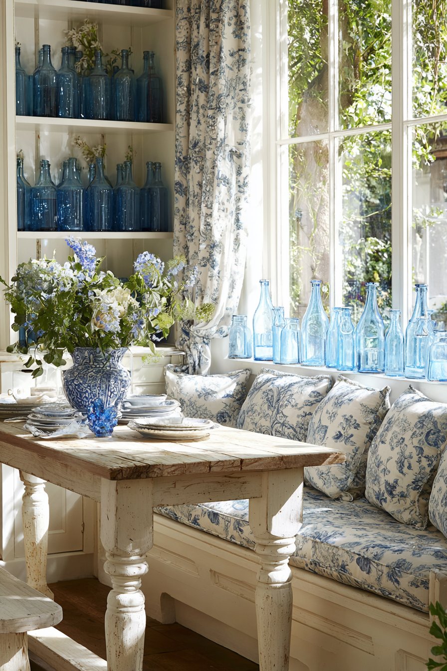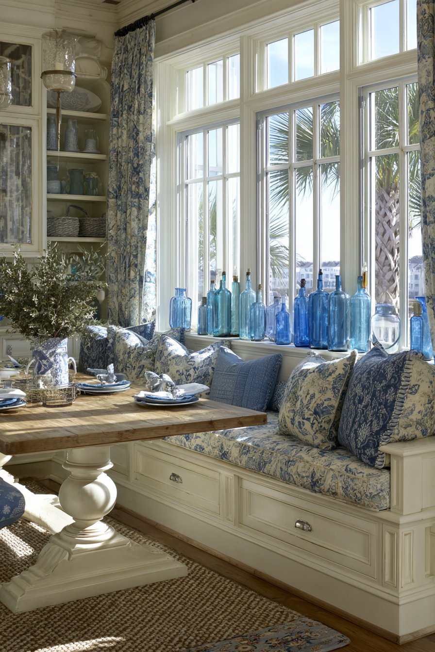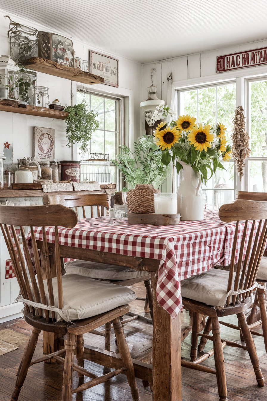 Gingham curtains in coordinating blue and white frame multiple windows, their cheerful pattern reinforcing the cottage aesthetic while filtering natural light into a soft, diffused glow. The gathered curtains add softness to the architectural lines and create rhythm through their repeated pattern. This breakfast nook demonstrates how even the smallest dining areas can achieve big cottage charm through thoughtful design and attention to detail.