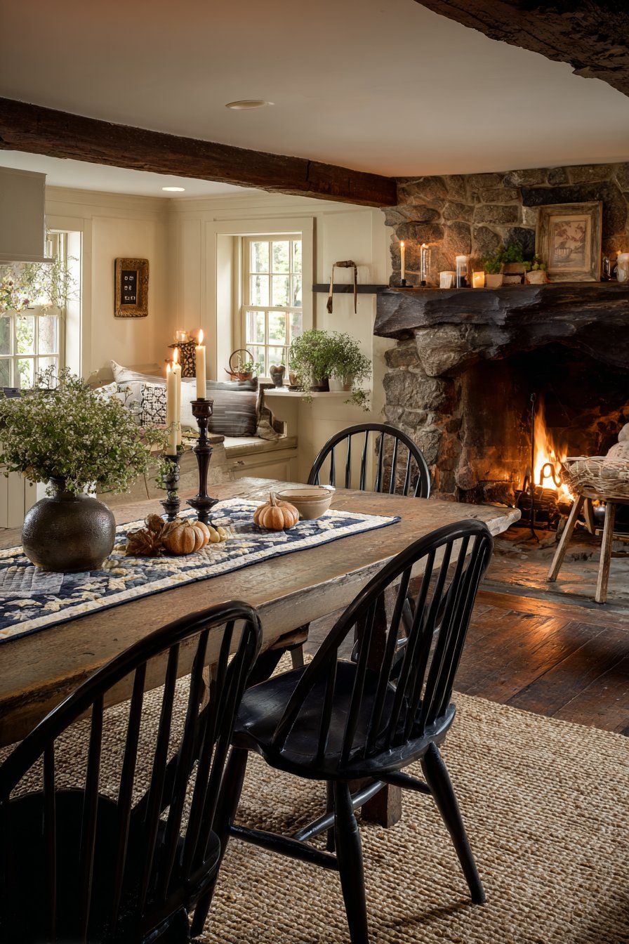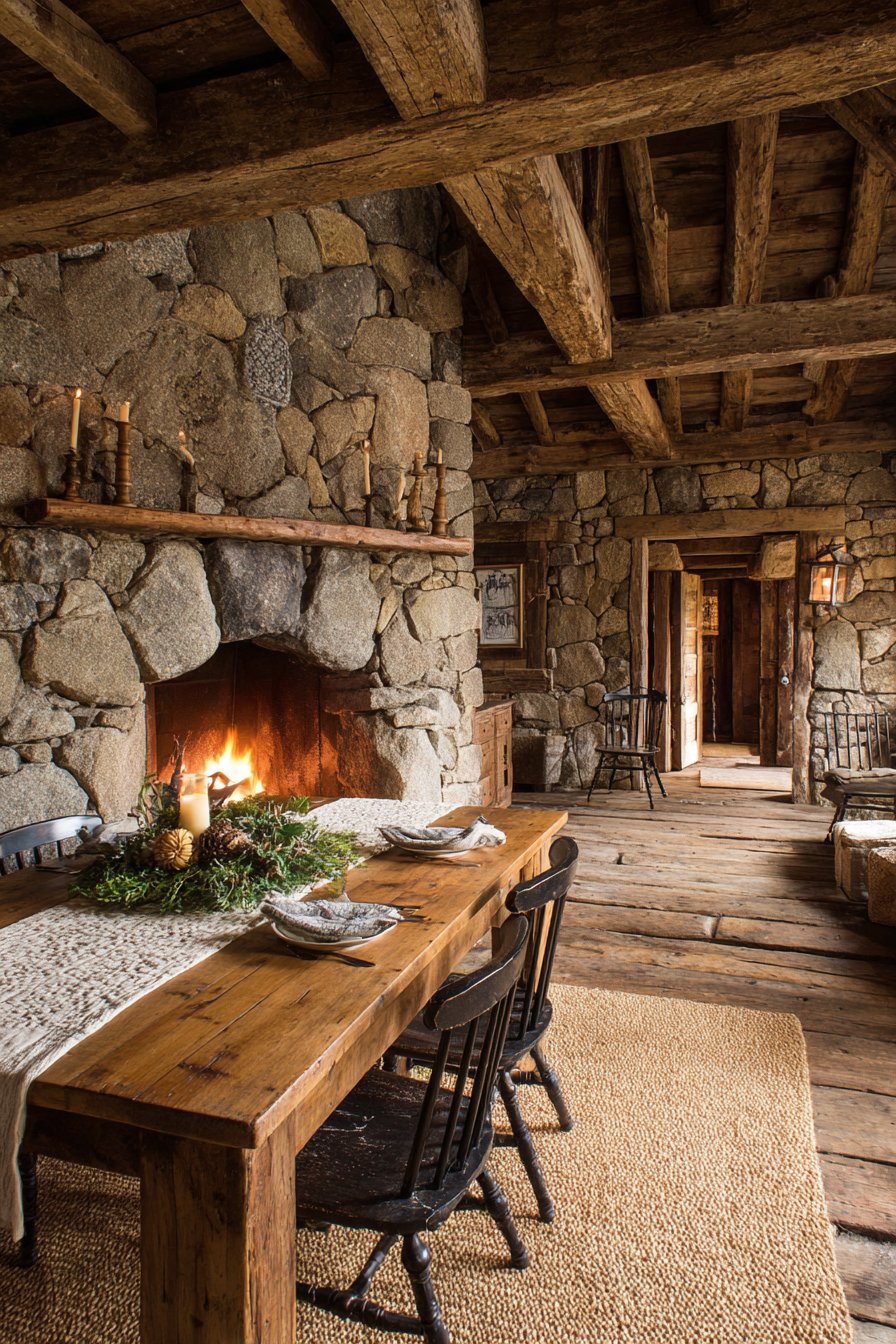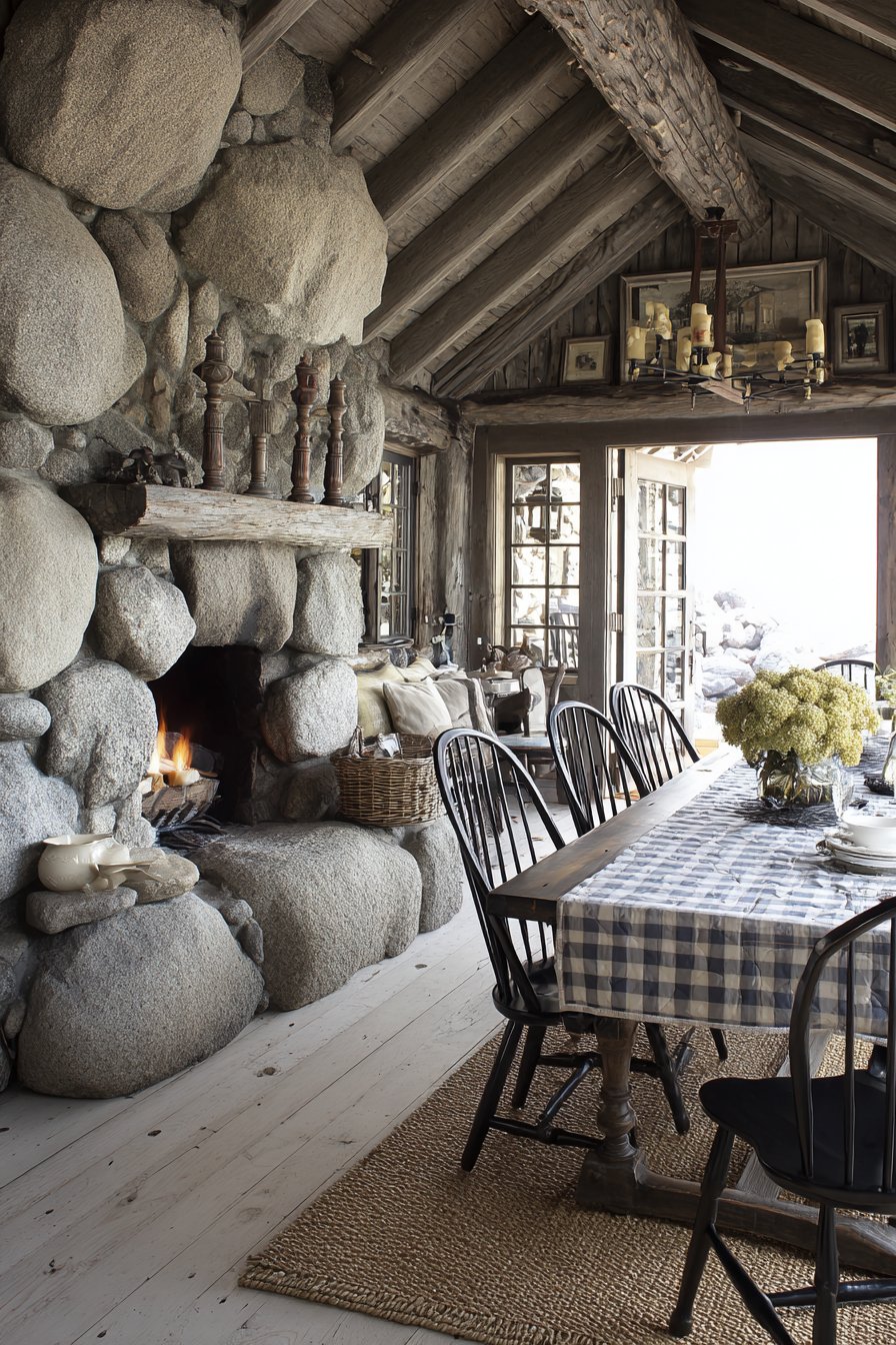 A stone accent wall featuring natural stacking creates dramatic texture in this cottage dining room where the varied earth tones and irregular surfaces add organic beauty. The dry-stacked appearance—stones fitted together without visible mortar—showcases the mason’s skill while creating shadow lines that change throughout the day with moving light. This natural material brings outdoor elements inside while providing visual weight that anchors the space.
