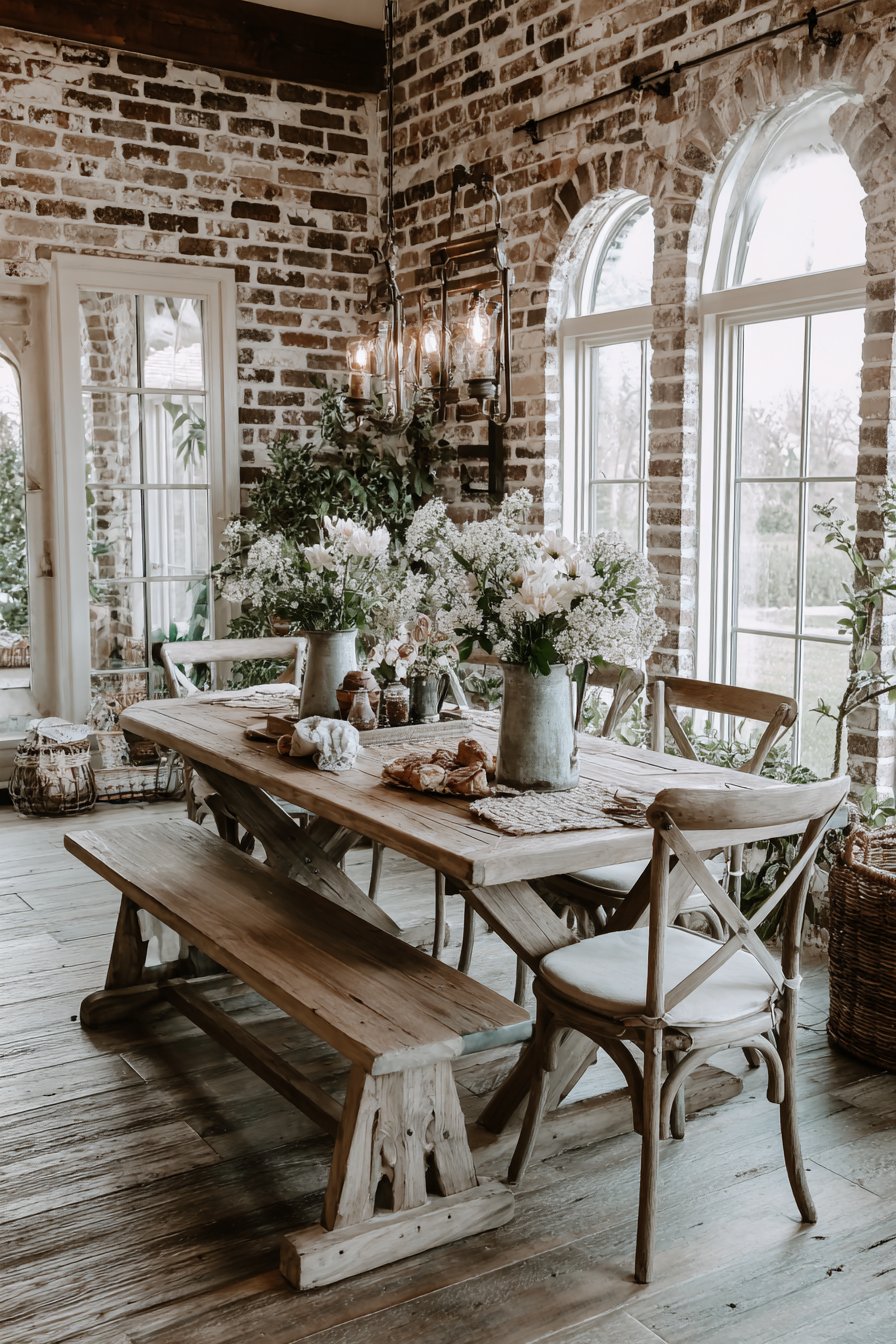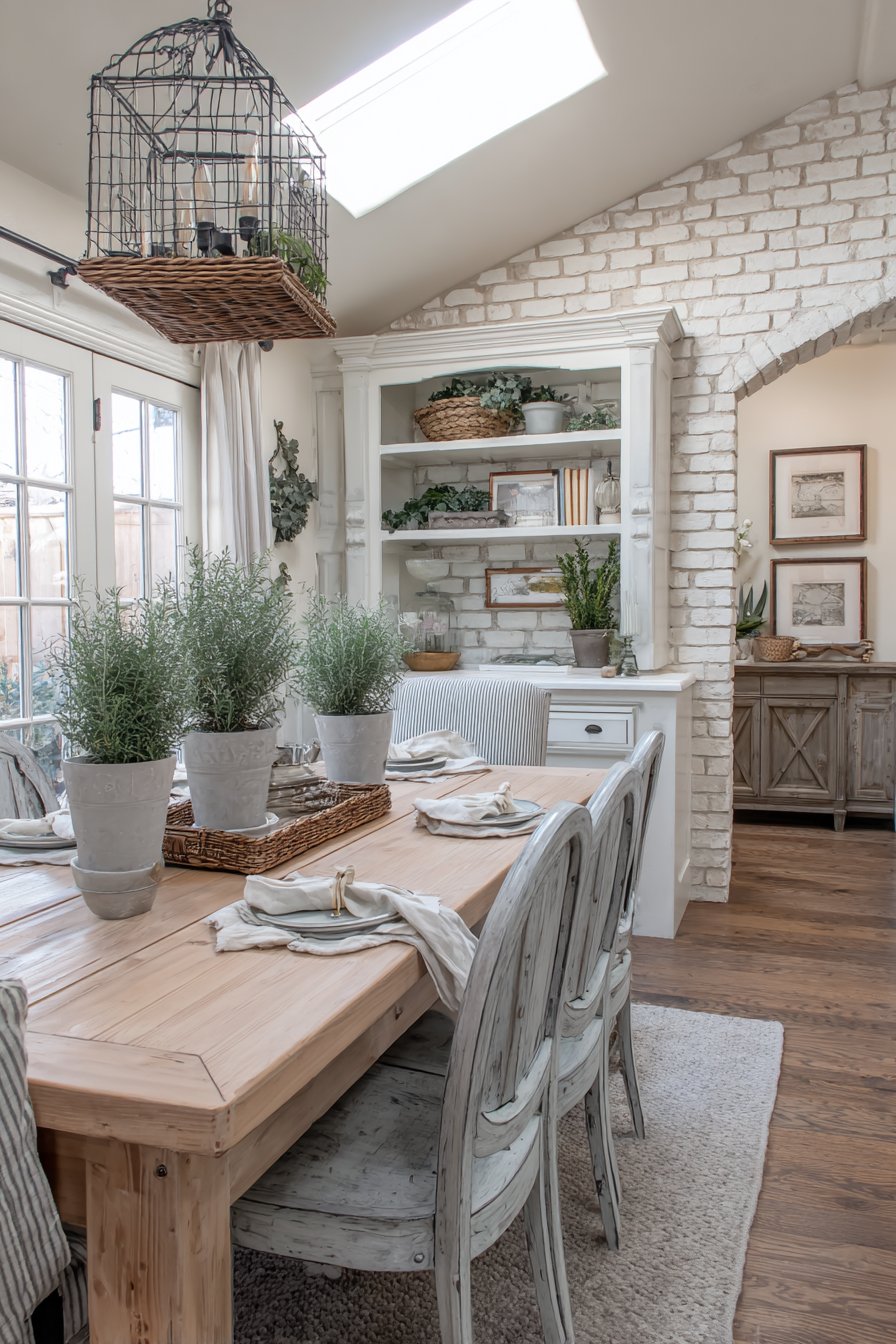 Exposed brick painted in a soft whitewash creates stunning texture in this cottage dining room, where the slightly irregular surface adds depth and visual interest that flat walls cannot achieve. The whitewashing technique allows the brick’s natural variations to show through while lightening the overall appearance, preventing the wall from feeling too heavy or industrial. This treatment strikes the perfect balance between rustic character and cottage refinement.