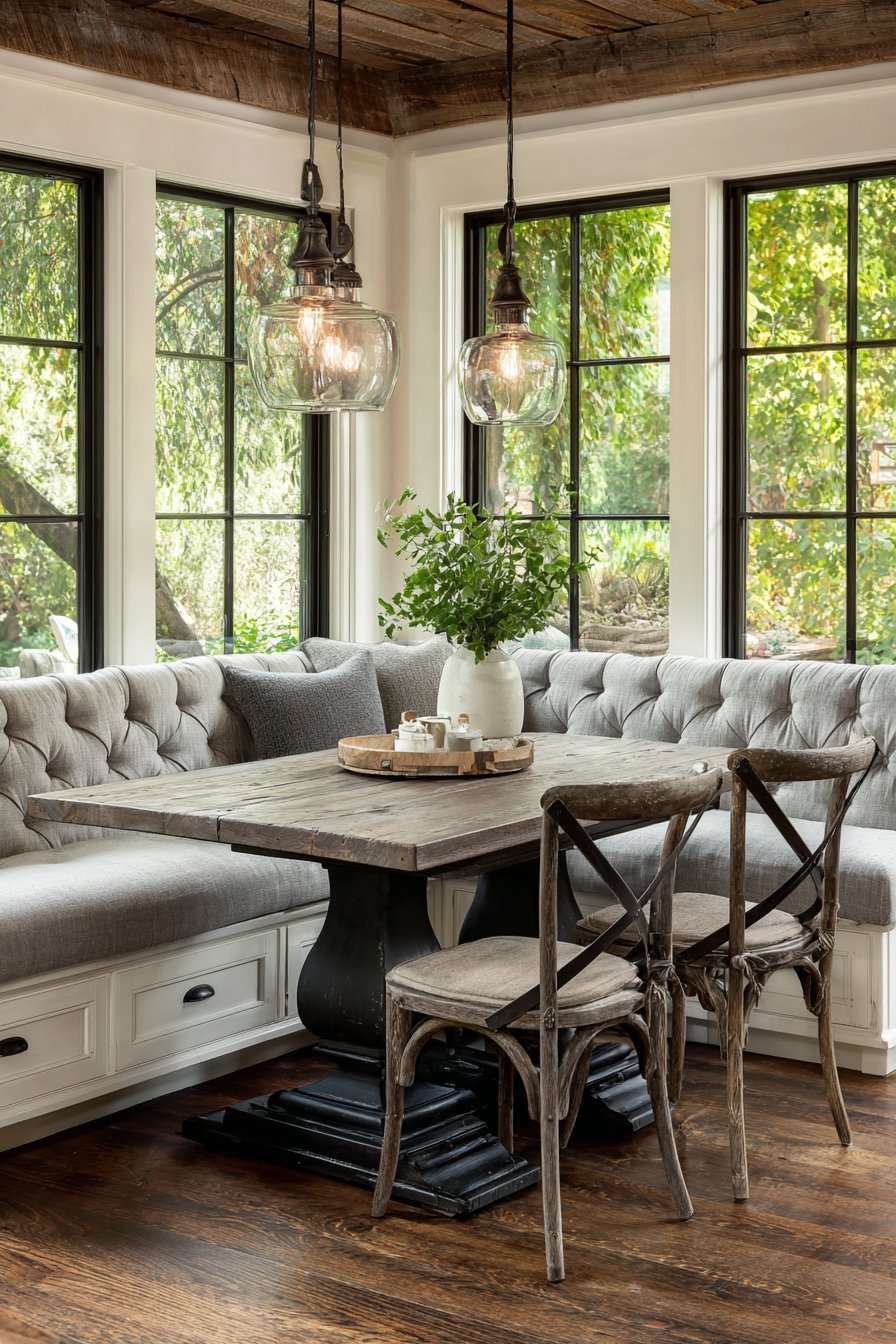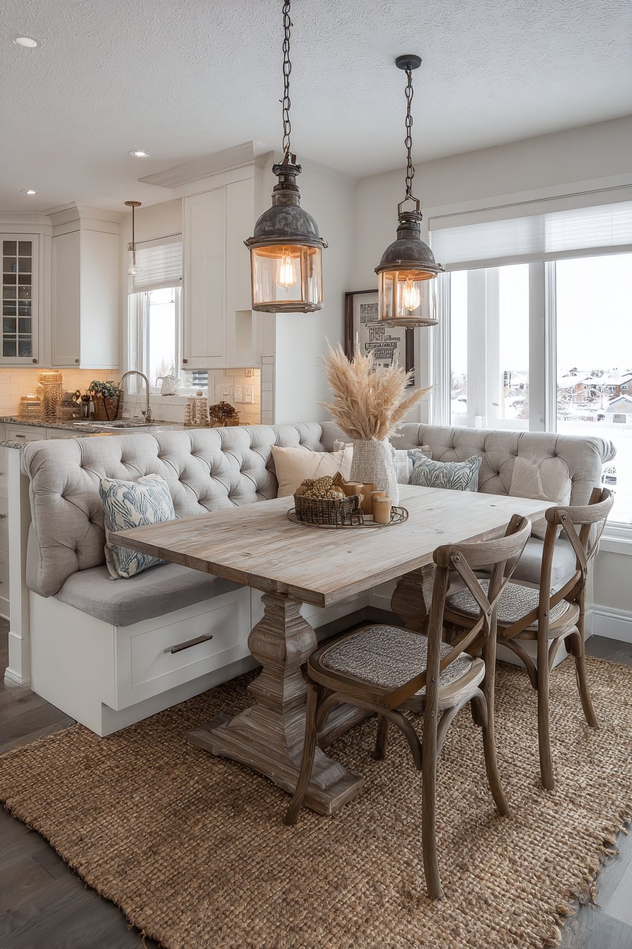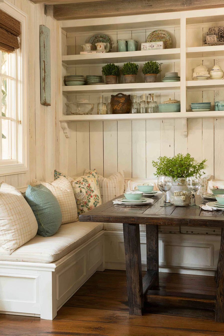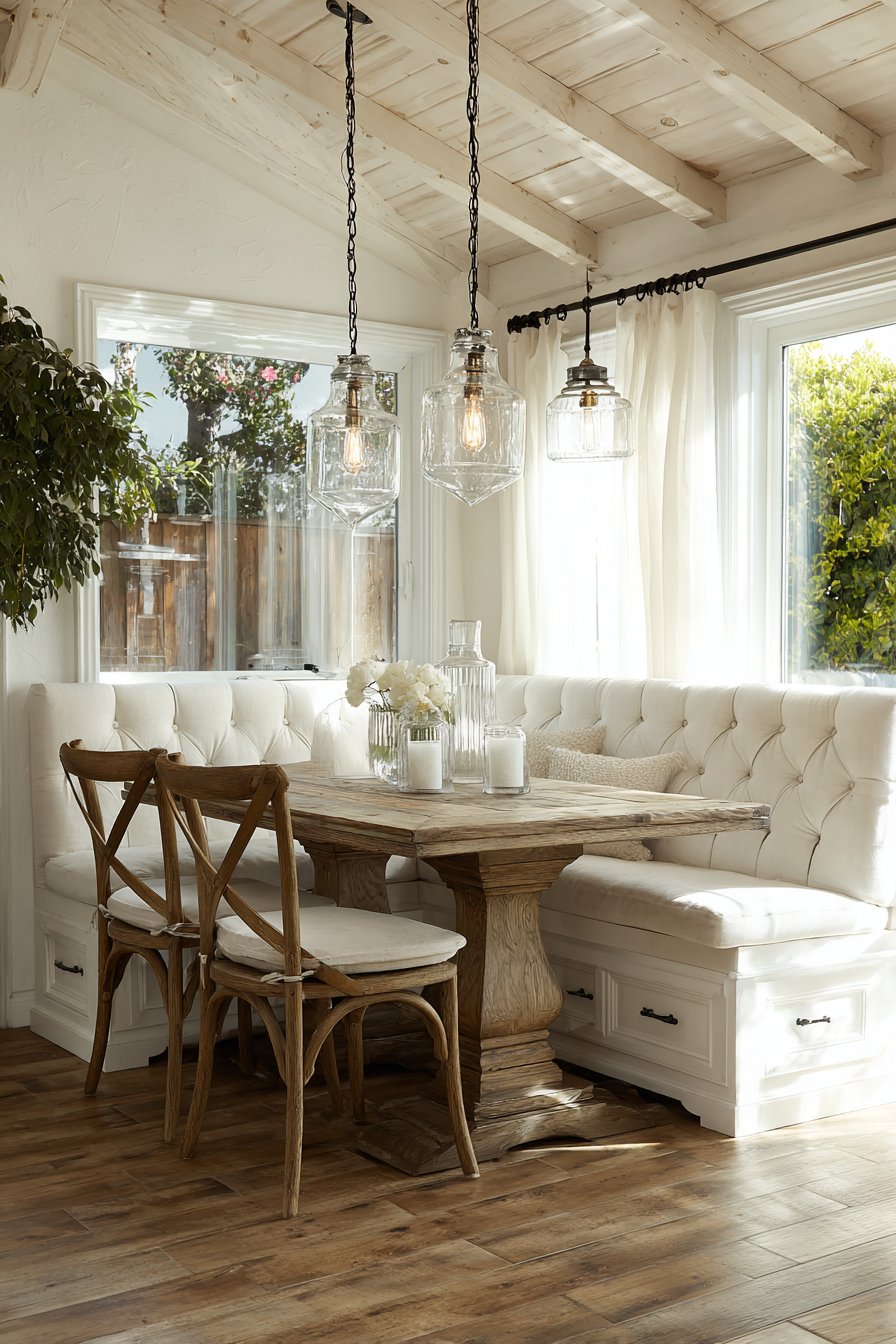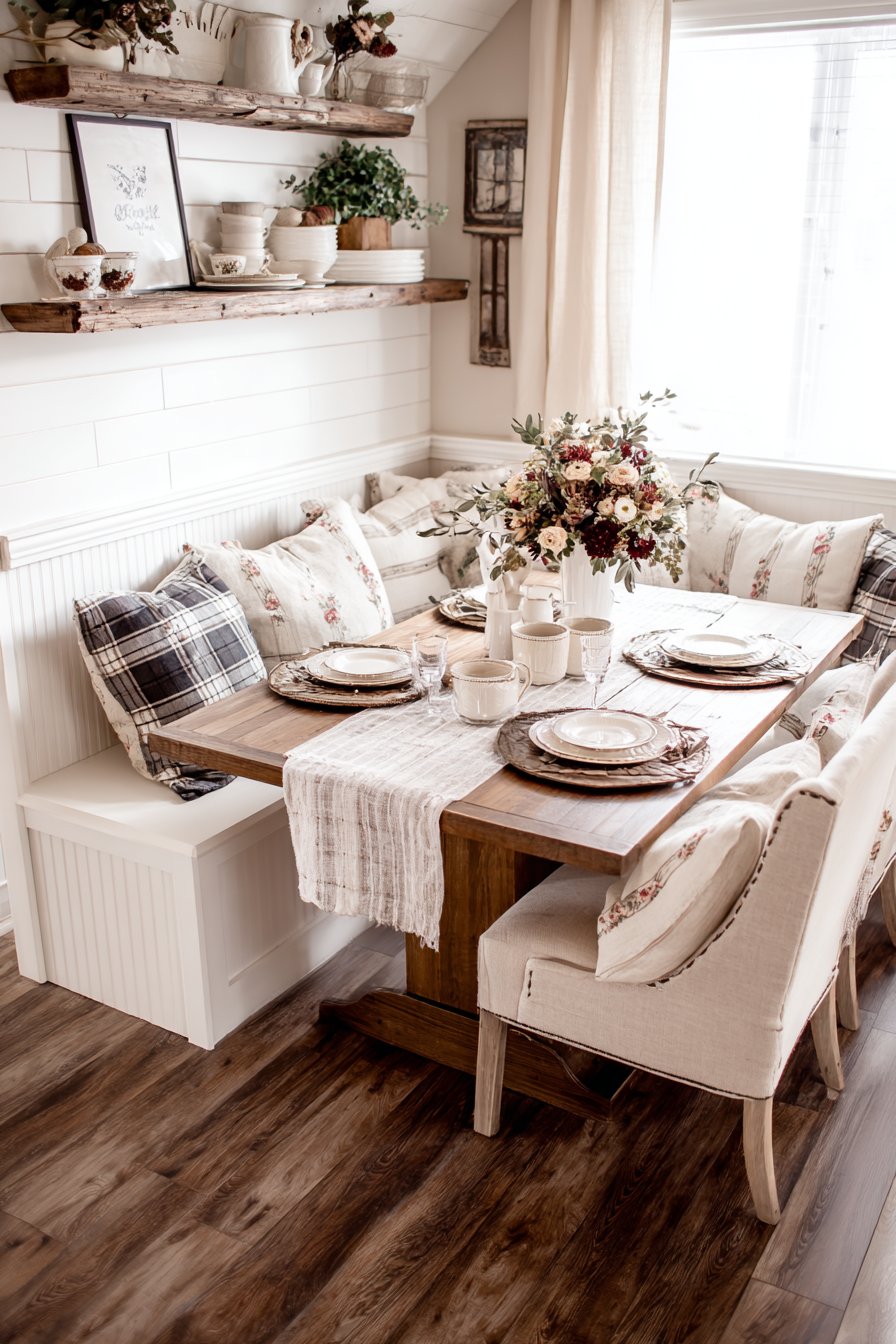 This space-efficient cottage dining room maximizes functionality through a built-in corner bench with beadboard backing painted in warm white, creating both seating and architectural interest. The L-shaped banquette wraps around a rustic wooden table, providing comfortable accommodations for four to six diners while conserving floor space—an ideal solution for smaller homes or open-concept layouts. Plaid cushions in muted blues and creams offer comfort and pattern, while vintage floral throw pillows add softness and cottage charm.