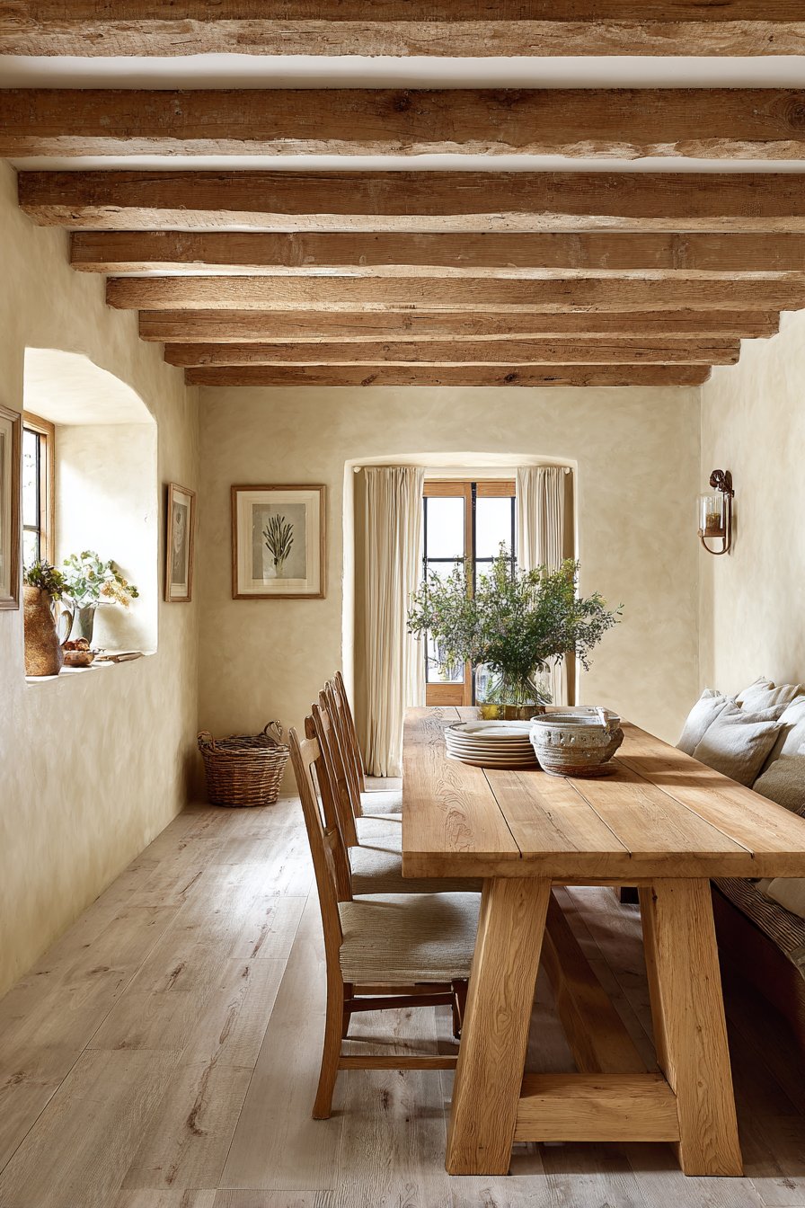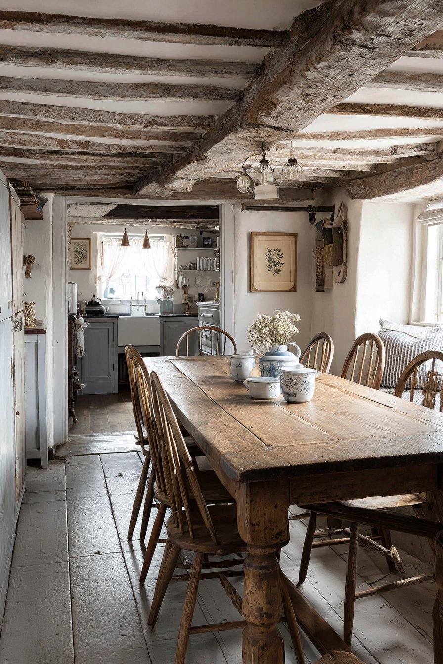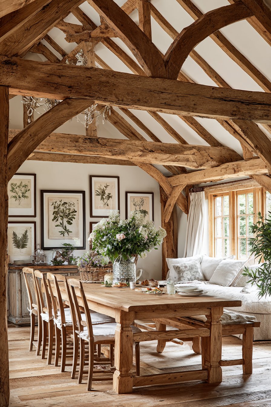 Rough-hewn ceiling beams in natural wood contrast dramatically with white plaster walls in this cottage dining room that successfully bridges traditional and contemporary aesthetics. The substantial beams showcase wood’s natural edge and character while the pristine white walls provide clean backdrop. This combination honors cottage’s historic roots while creating space that feels fresh and current.