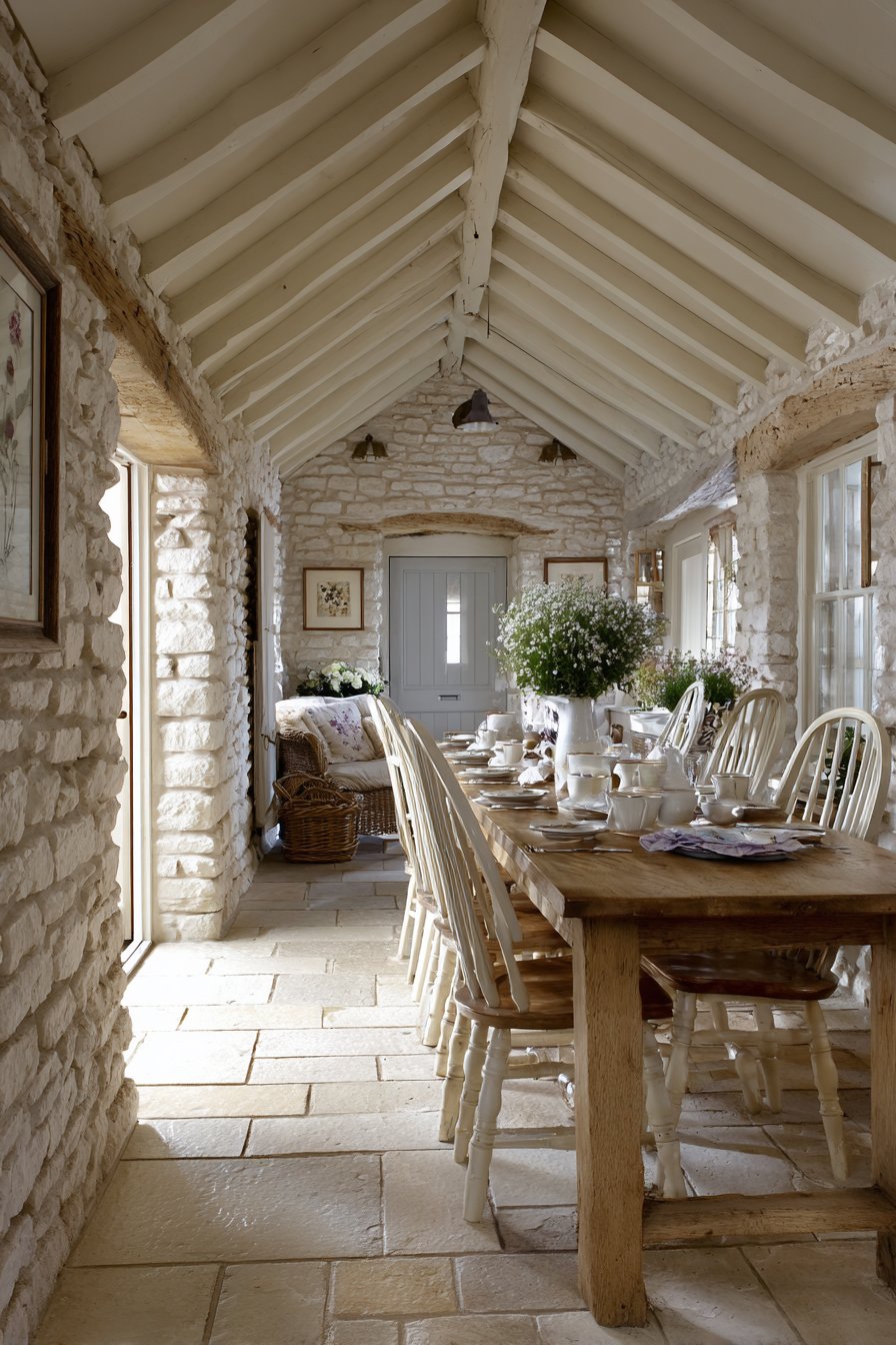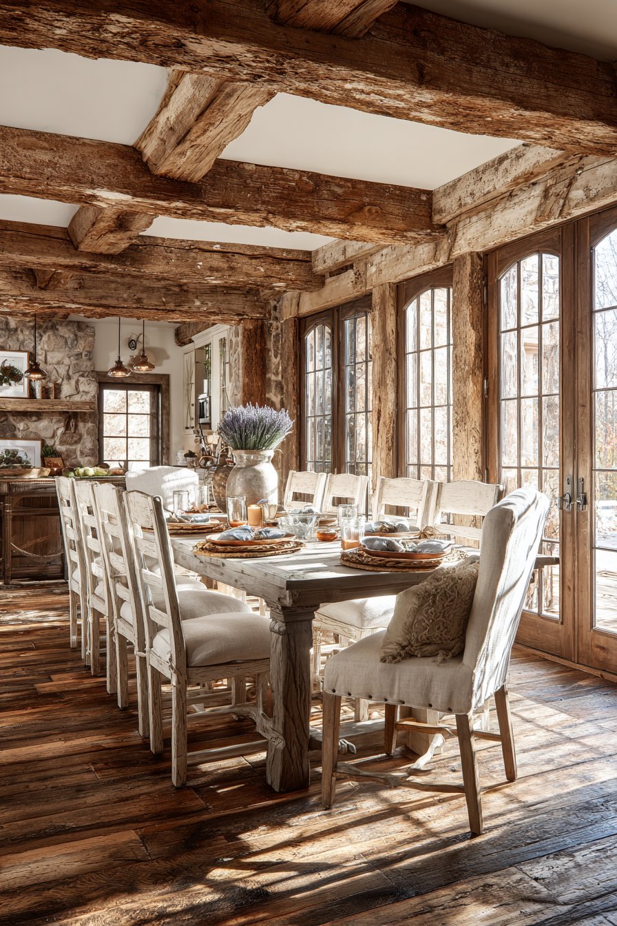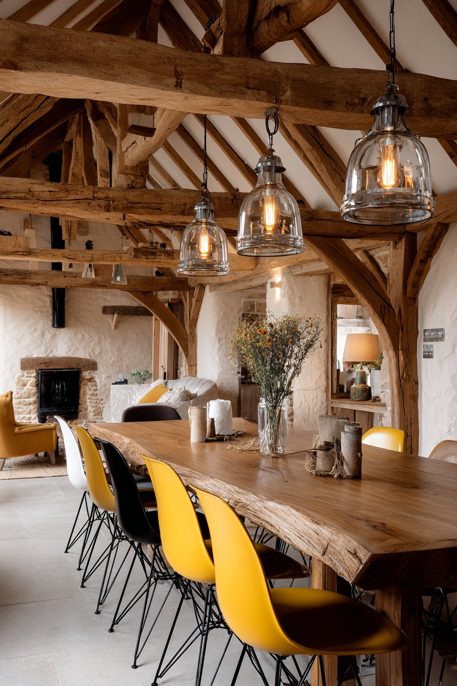 Rough-hewn ceiling beams in natural wood contrast dramatically with white plaster walls in this cottage dining room that successfully bridges traditional and contemporary aesthetics. The substantial beams showcase wood’s natural edge and character while the pristine white walls provide clean backdrop. This combination honors cottage’s historic roots while creating space that feels fresh and current.