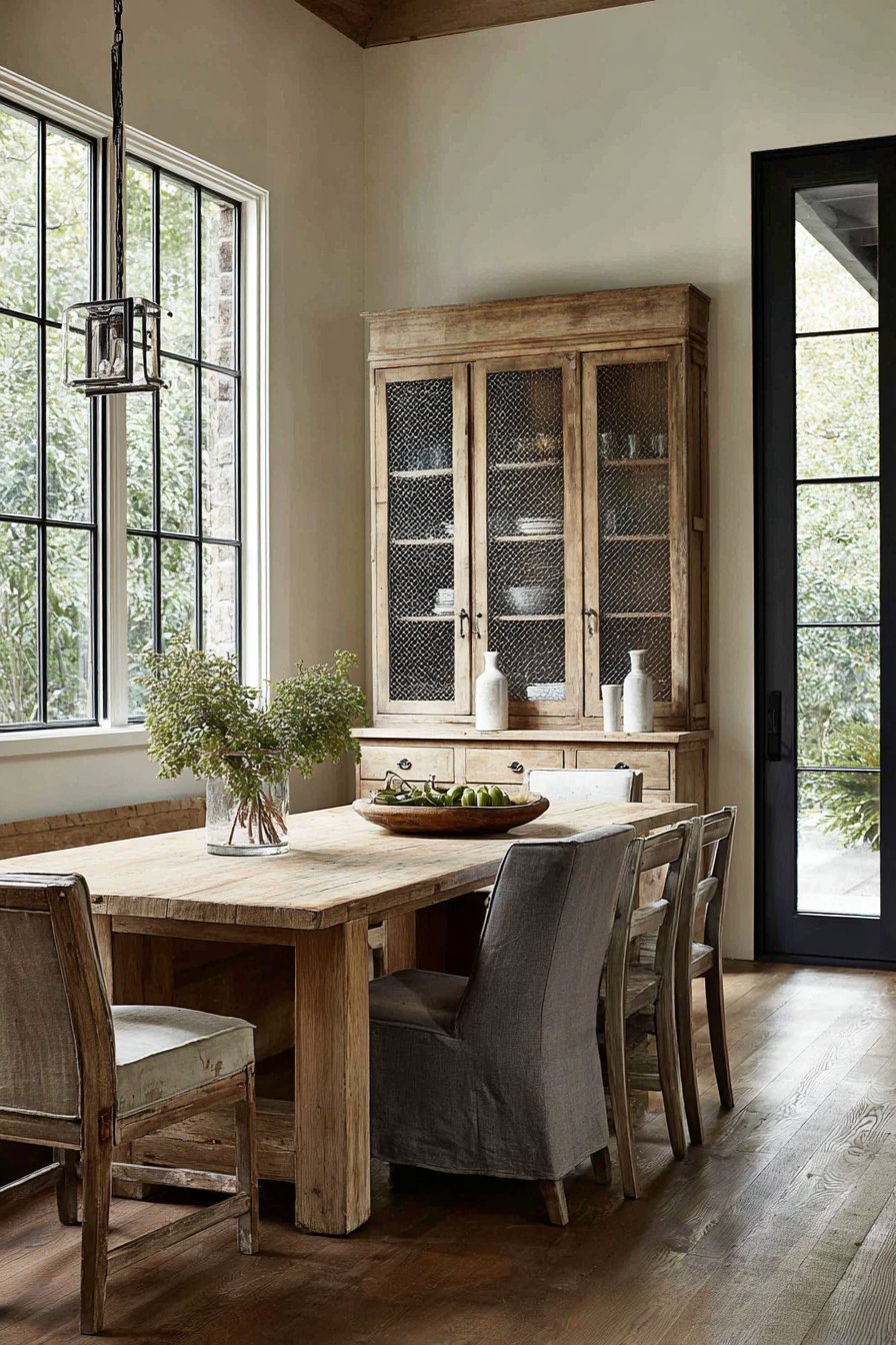A farmhouse table crafted from reclaimed barn wood with visible nail holes and weathering creates the centerpiece of this authentically rustic cottage dining room. Each mark and imperfection tells stories of the wood’s previous life, adding depth of character that new lumber cannot achieve. The substantial planks and traditional joinery demonstrate craftsmanship while the distressed surface invites use without concern for adding new marks.