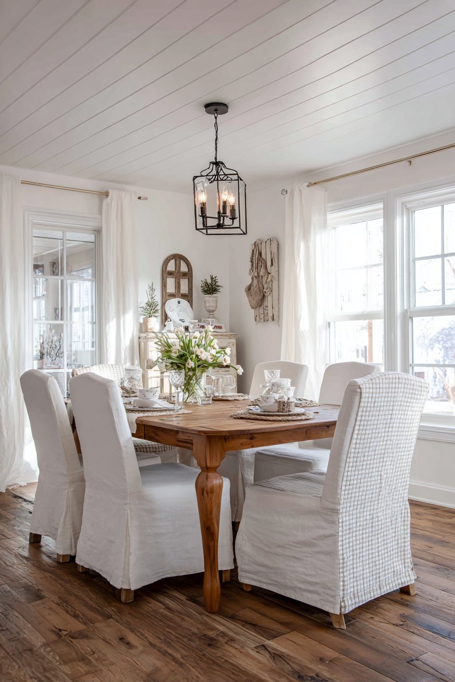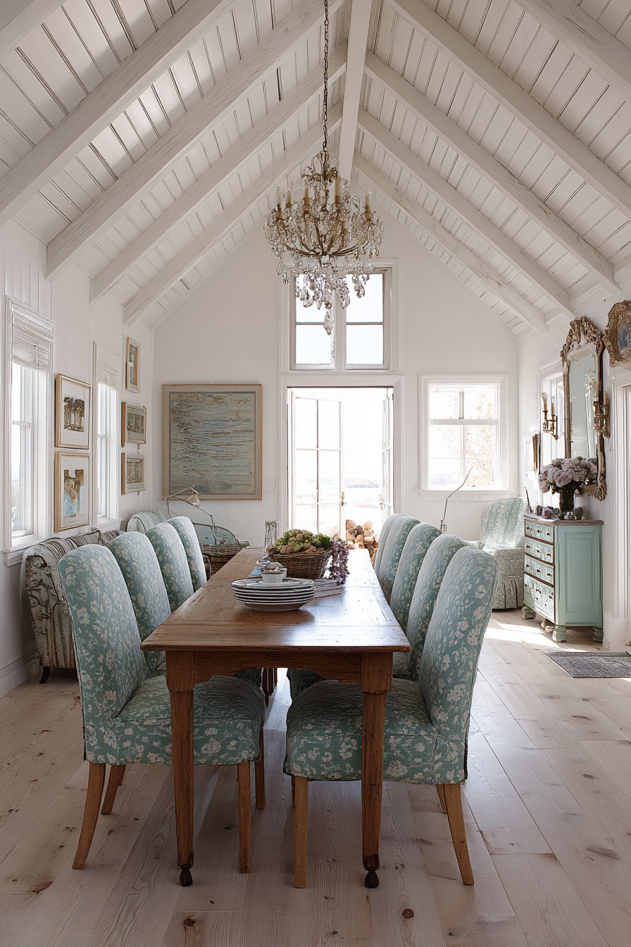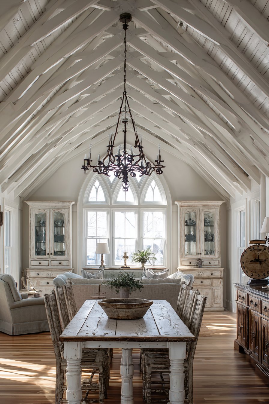 A vaulted ceiling featuring exposed collar ties painted white creates dramatic sense of height in this cottage dining room where architectural bones become the decoration. The white-painted structural elements draw the eye upward while the increased volume makes the space feel generous and grand despite modest square footage. This ceiling treatment showcases the home’s construction as beautiful rather than concealing it behind drywall.