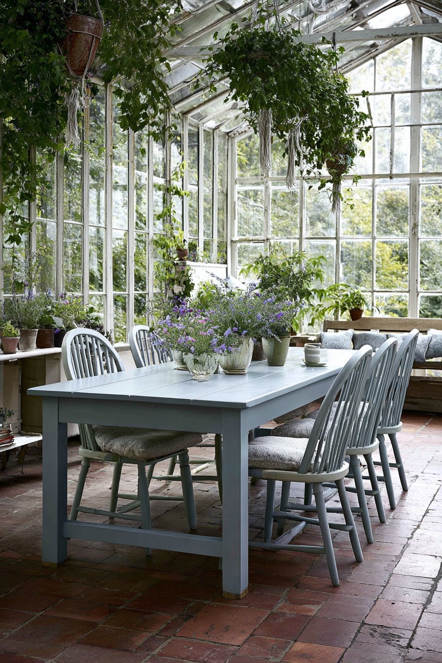 The adjacent dining table features a scrubbed pine top paired with a painted base, creating visual interest through the combination of natural wood and painted surfaces. This treatment adds depth to what might otherwise be a simple piece, demonstrating how finish choices can elevate furniture personality. Garden-style dining chairs mixing metal and wood elements surround the table, their varied textures contributing to the room’s collected-over-time appearance.
