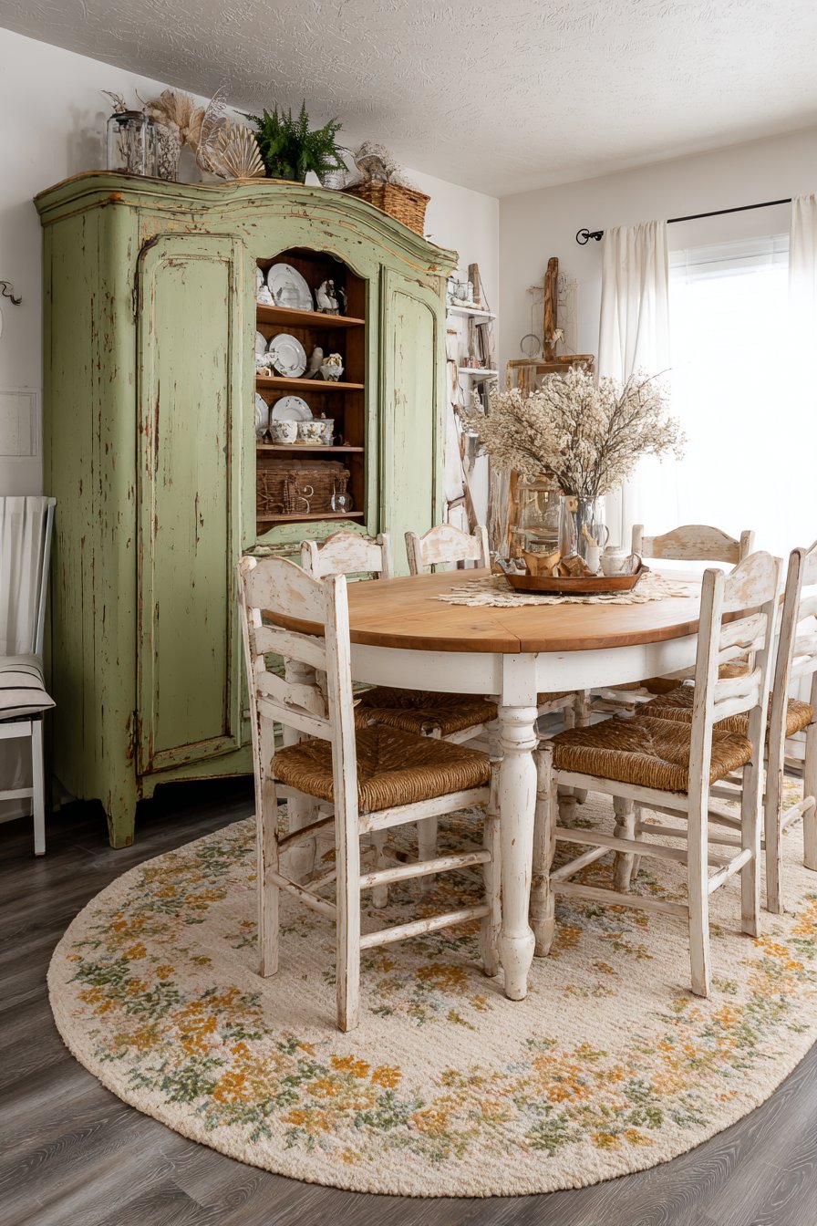 The adjacent oval dining table features a pedestal base painted in chippy white, its distressed finish revealing wood and earlier paint layers beneath. The oval shape softens the room’s geometry while accommodating more diners than a rectangular table of similar length. Ladder-back chairs with woven seats surround the table, their traditional construction and natural materials reinforcing cottage authenticity.