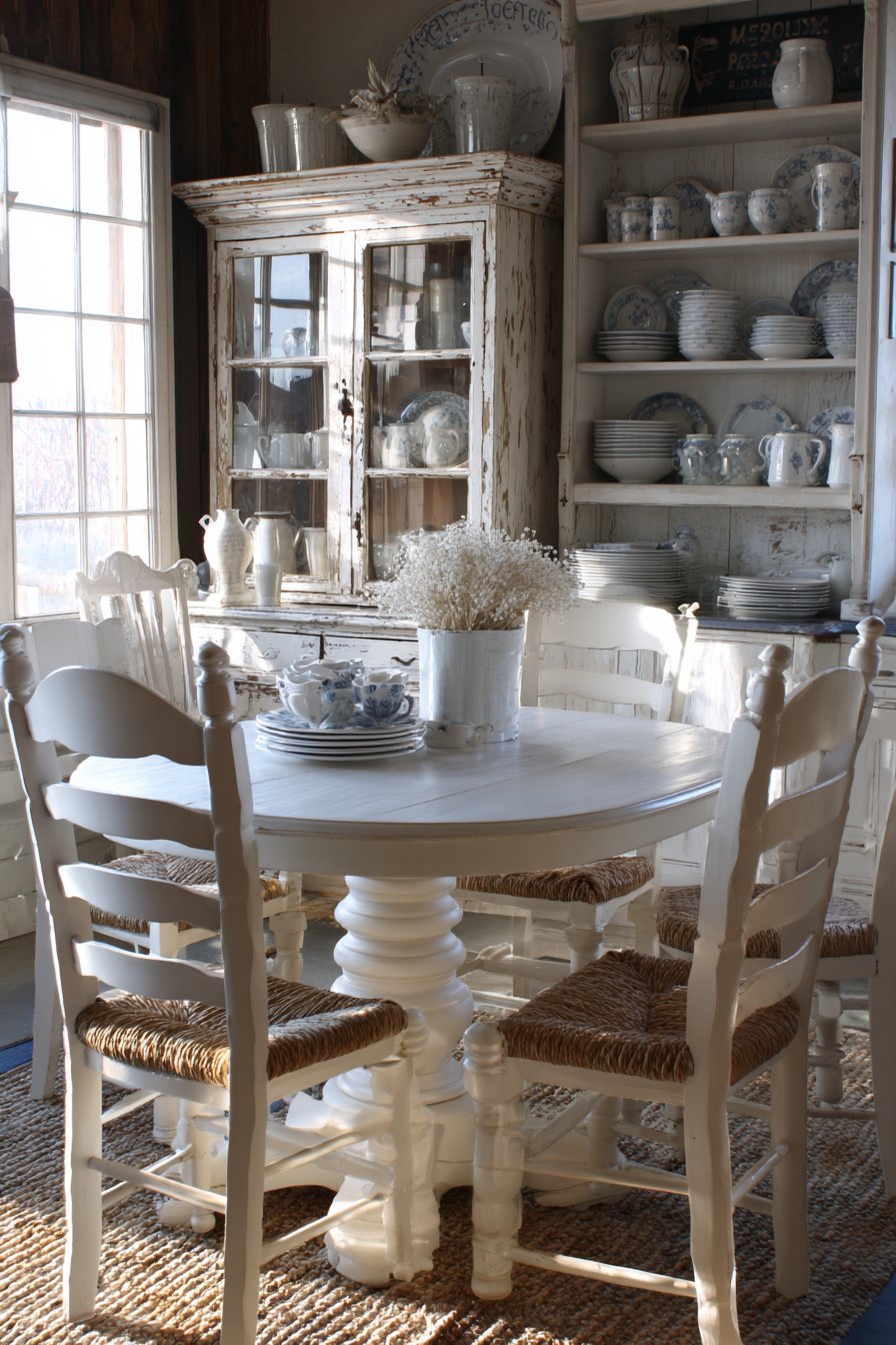 Ladder-back chairs with woven rush seats provide traditional seating that remains lightweight and visually unobtrusive. These classic cottage chairs can easily be moved aside when the table is contracted, and their natural rush seats introduce organic texture that complements the painted wood elements. A vintage plate rack mounted on the wall displays treasured china collections, turning functional storage into decorative focal point.