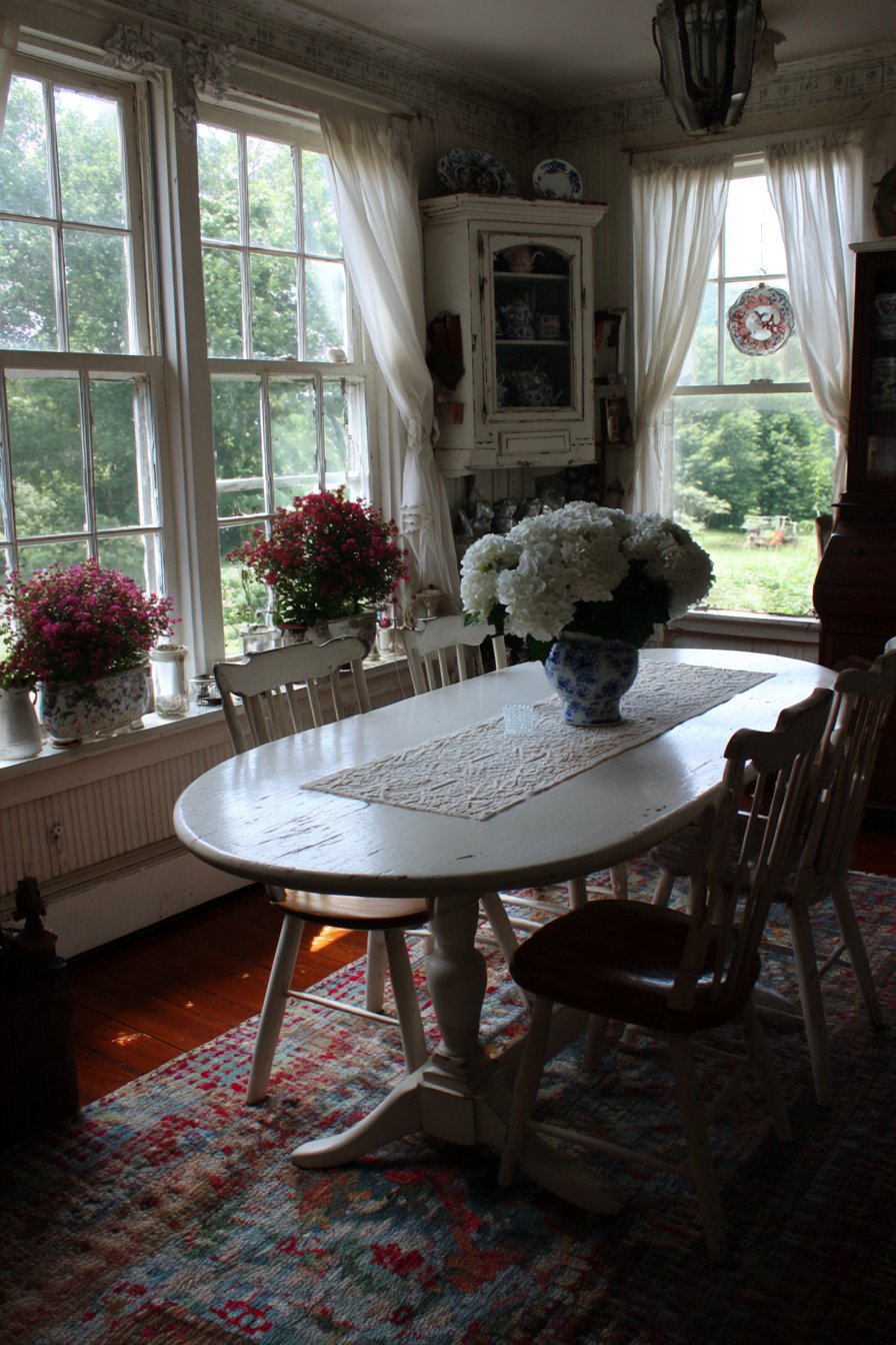 A corner cupboard in original milk paint finish becomes the treasured focal point of this cottage dining room, its authentic aged surface displaying decades of wear in the most beautiful way. The cupboard displays vintage transferware—blue and white china in various patterns that share common color but vary in design. This collection represents years of gathering pieces from different sources, creating a display that tells family and hunting stories.