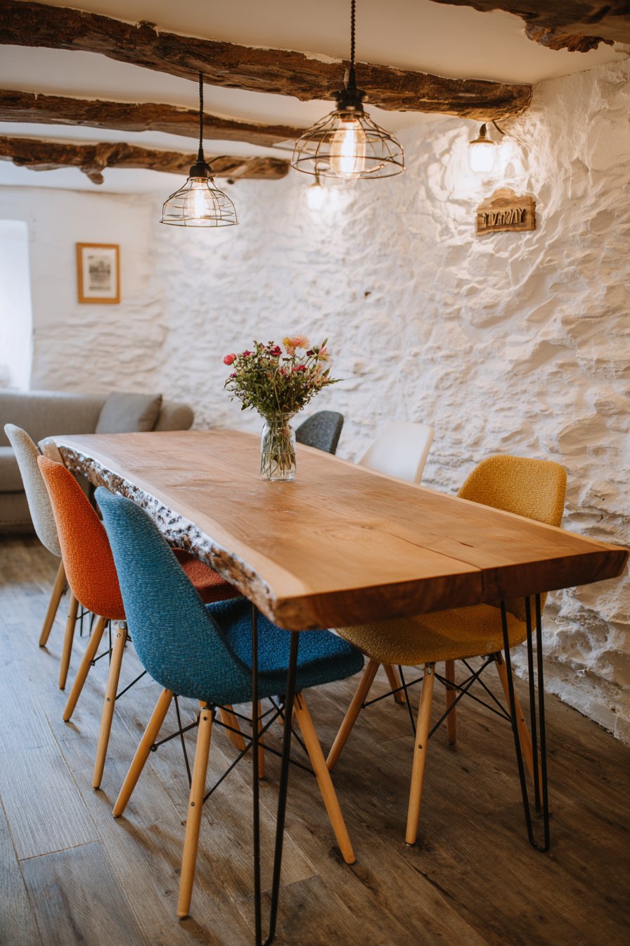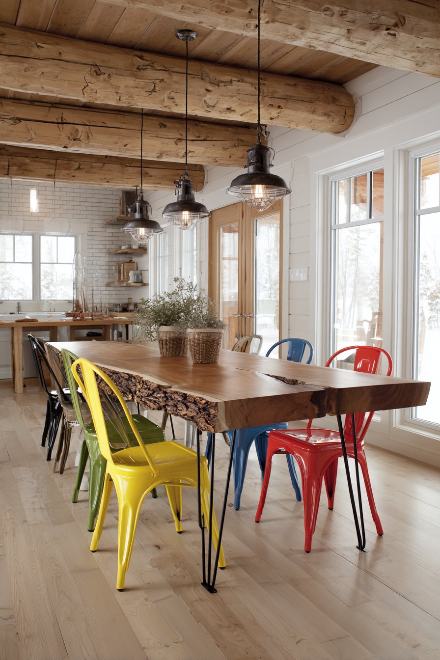 A live-edge wooden table with metal hairpin legs provides stunning contrast between organic and industrial elements. The table’s natural edge preserves the tree’s original shape, celebrating wood’s natural beauty, while the sleek metal legs add contemporary touch. Eames-style molded chairs in various colors create eclectic seating that combines mid-century modern design with cottage’s embrace of mismatched elements.