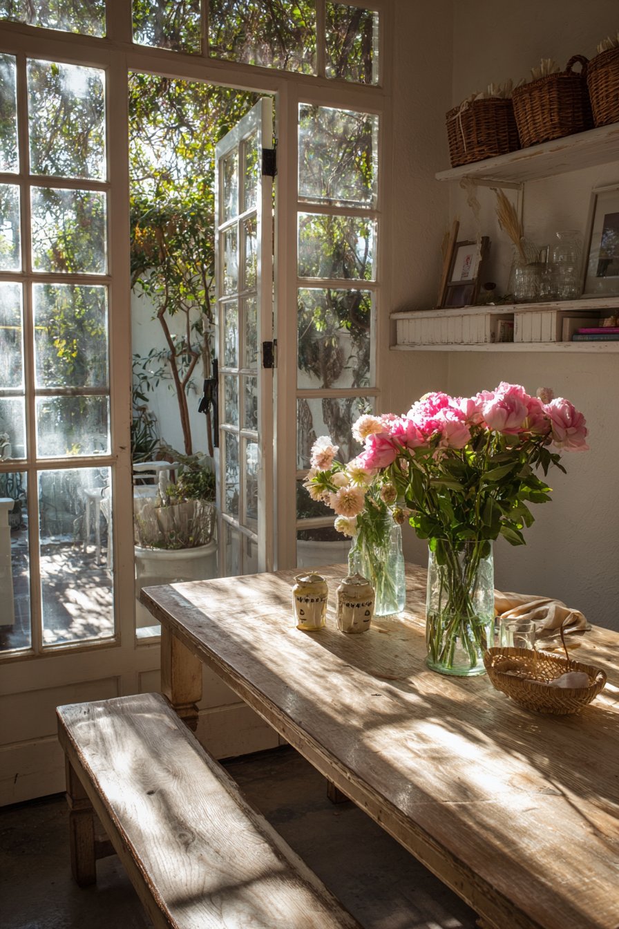 A scrubbed pine table with bench seating on one side maximizes space efficiency while creating casual, family-friendly dining arrangement. The bench accommodates flexible numbers of diners and can seat children more easily than individual chairs. Mismatched milk glass vases hold fresh garden flowers, their white translucent finish creating cohesive display despite varied forms.