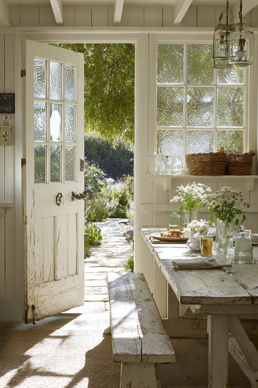 A Dutch door opening to the garden serves as the defining feature of this cottage dining room, its top half featuring original wavy glass panes that admit light while the bottom half can remain closed for pet or child containment. This traditional door style creates flexible connection to outdoor spaces, allowing fresh air and garden views while maintaining security. The door becomes both functional and decorative element that anchors the room’s garden-inspired aesthetic.