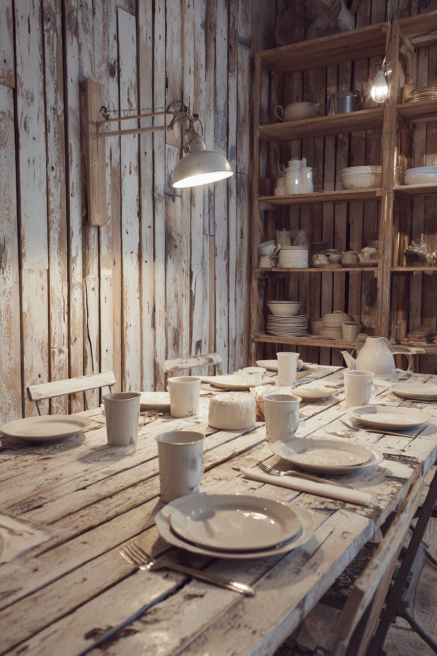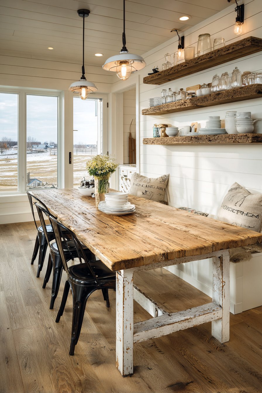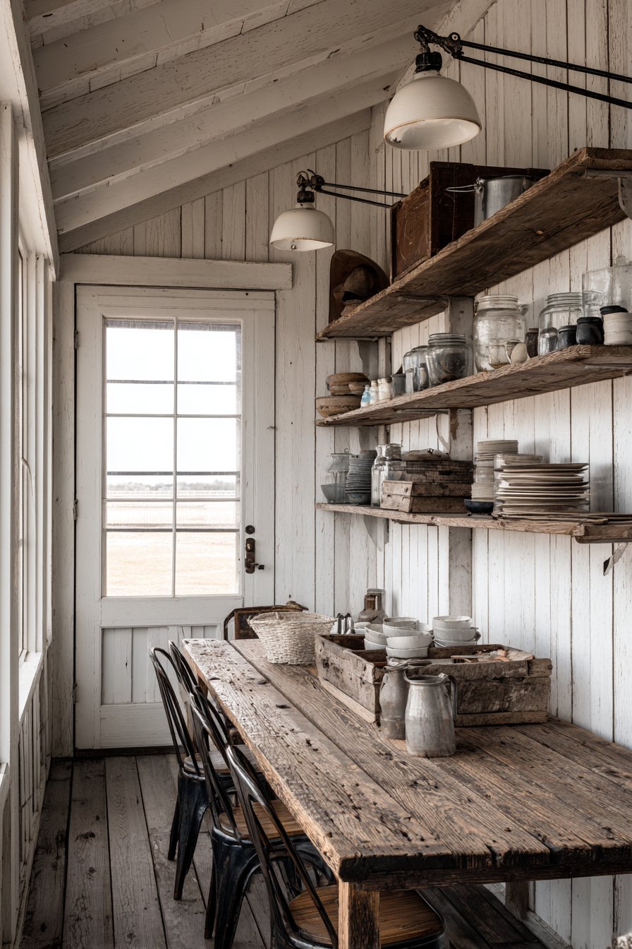 Open shelving constructed from salvaged wood holds everyday dishes, creating display storage that keeps necessities accessible while adding decorative interest. The rough-sawn boards and simple bracket supports reference barn construction, tying the shelving to the table’s reclaimed materials. This approach to storage eliminates upper cabinets, keeping the room feeling open and casual.