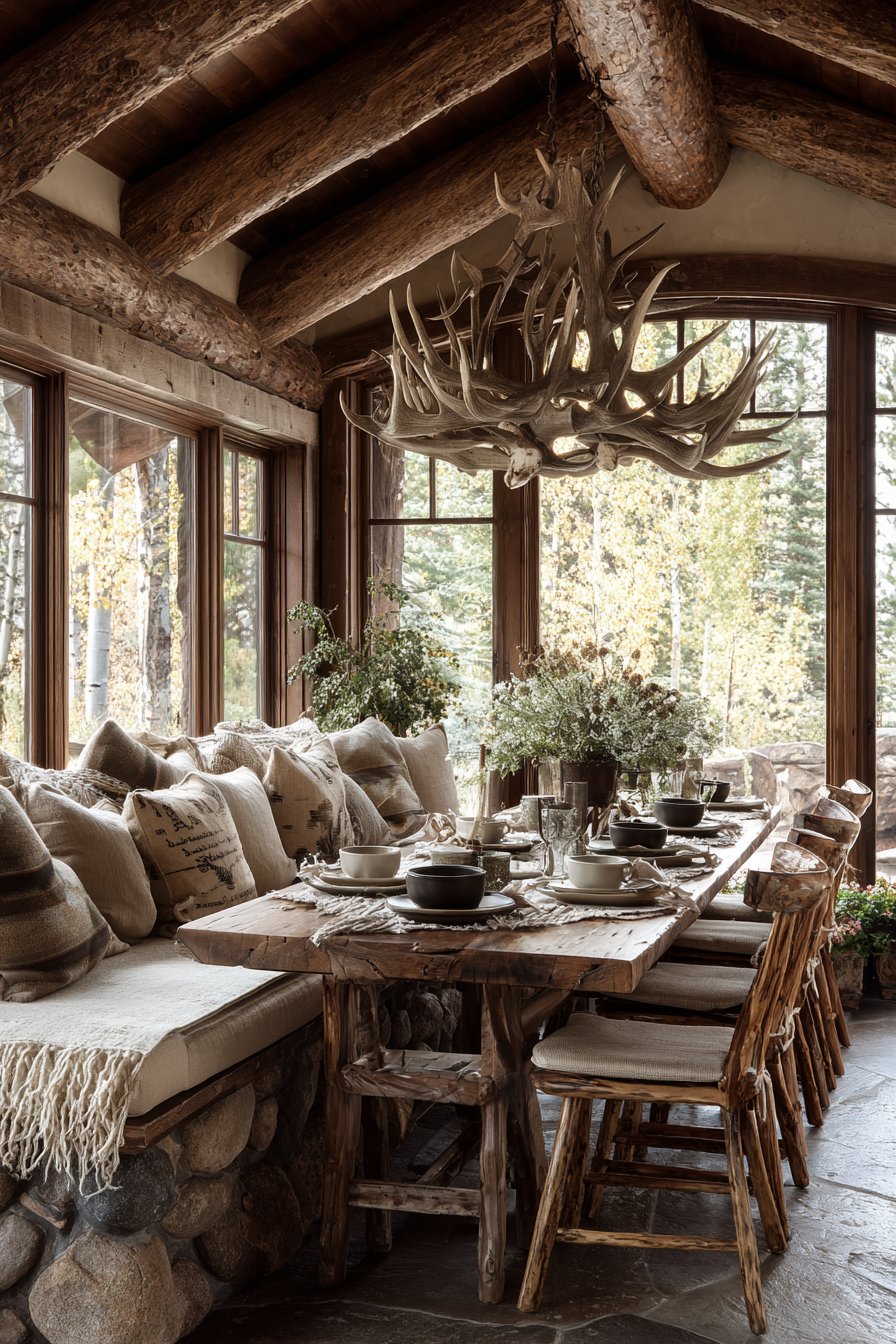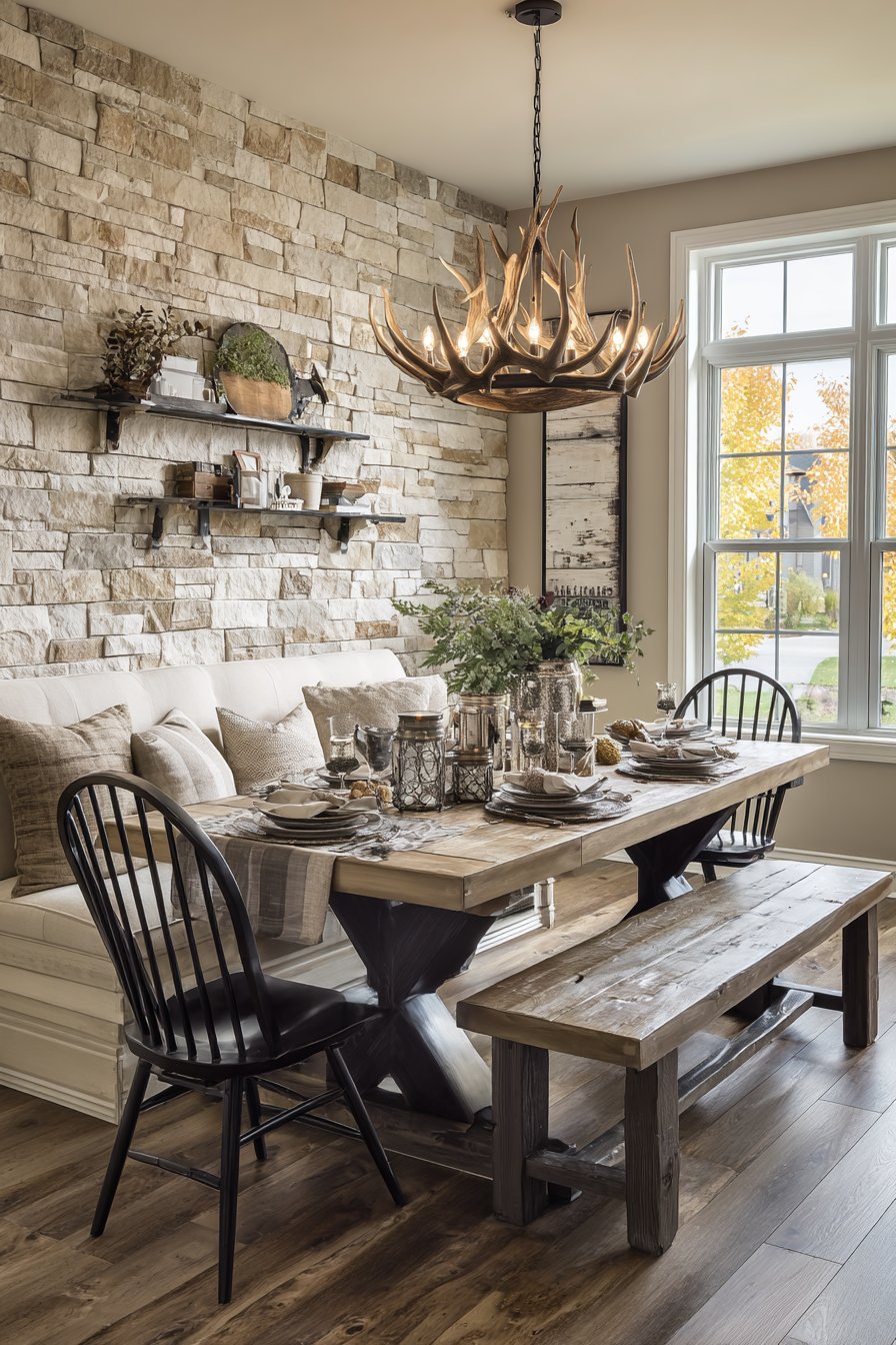A rustic farm table with bench on one side and chairs on the other provides family-style seating that encourages closeness and conversation. The bench seating allows children to sit together easily and accommodates one or two additional guests when needed. An antler chandelier adds organic sculptural element overhead, its natural form and neutral coloring complementing the stone wall.