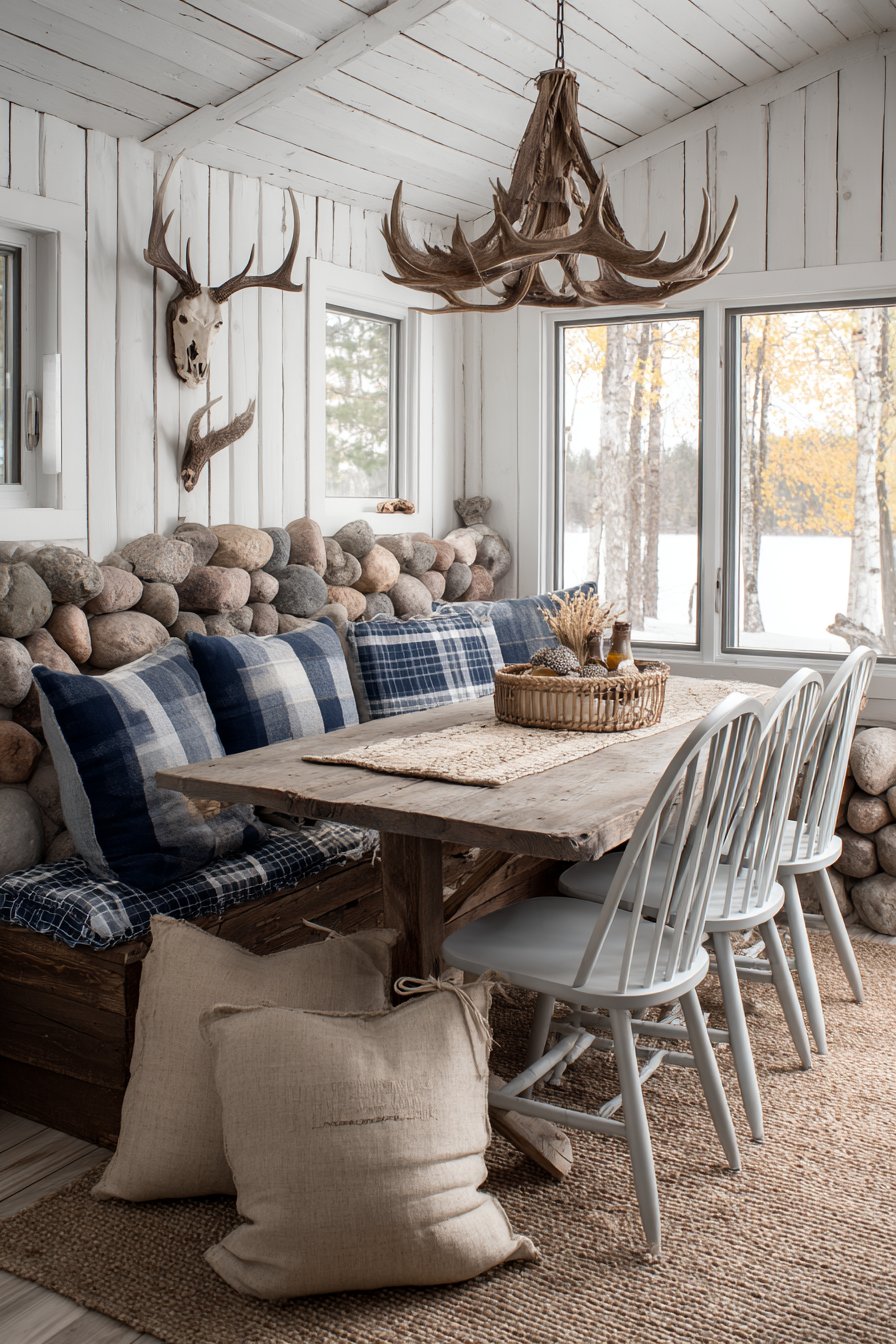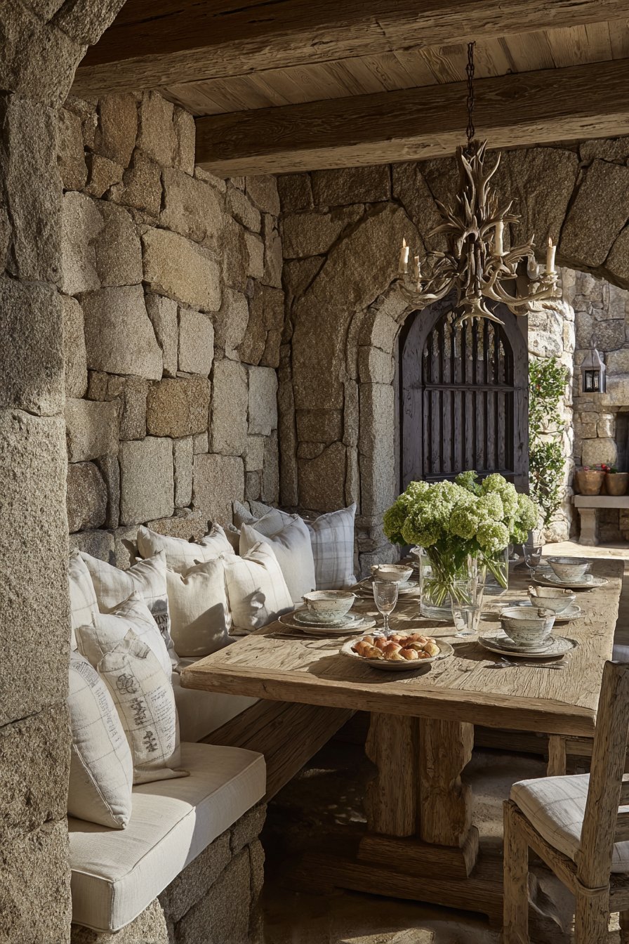 Vintage grain sack pillows on the bench add comfort while introducing traditional textile patterns. The grain sacks’ original printing and worn fabric speak to agricultural heritage, connecting this dining space to cottage’s farming roots. The pillows’ linear stripes add pattern without competing with the stone wall’s strong texture.